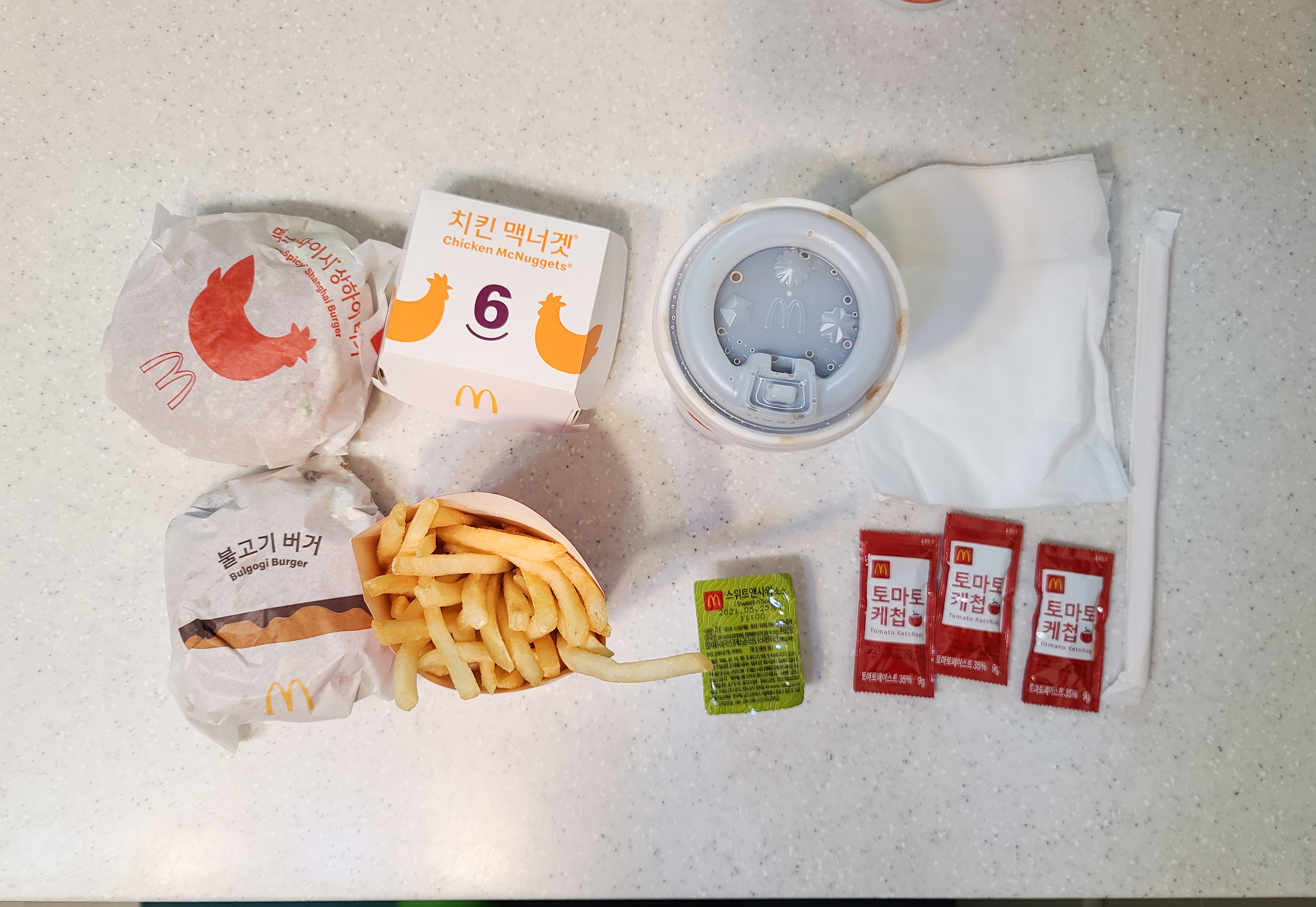 불고기버거도 뒤집어서 먹었는데, 소스를 손가락에 묻히는 건 똑같더라고요. 제가 잘 못 먹은 건진 몰라도요.(ㅋㅋ) 상하이 버거와 불고기버거 모두 좀 뭔가 내용물이 줄어든 것처럼 거의 샌드위치 수준으로 나오더라고요. 아무튼 불고기버거는 패티가 너무 스펀지 같은 식감이었습니다. 소고기 패티가 아니어서 그런지 좀 식감과 맛이 별로였습니다. 그래도 이 날 몹시 배가 고픈 상태에서 먹었더니 두 햄버거 다 소화시켰네요.
