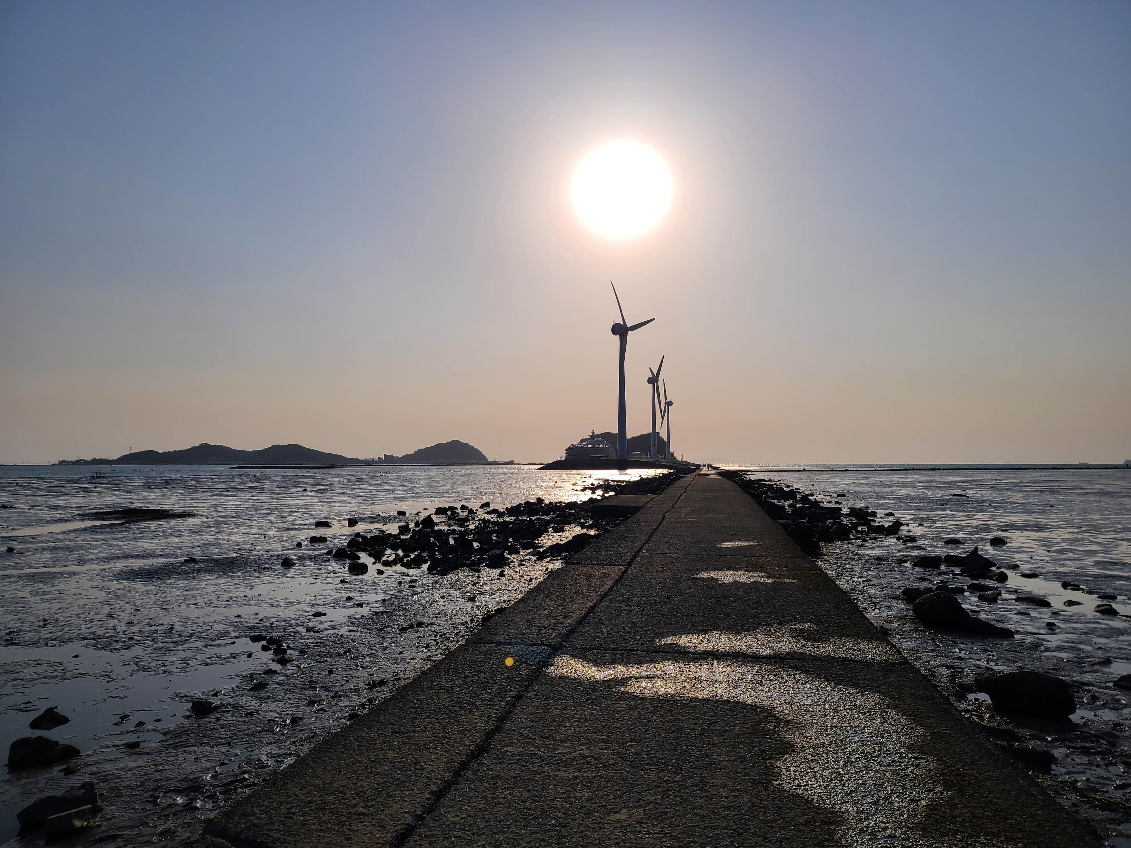 누에섬 방향으로 걸어가면 꽤 깊숙이 들어갈 수 있습니다. 밀물 시간이 다가오는지 물이 누에섬을 따라 난 길 쪽으로 서서히 차오르는 것 같더라고요. 그래서 더 멀리 가지는 못했는데, 해가 떨어지려는 시간에 방문해서 그런지 완벽한 노을 사진은 아니지만, 멋진 색감의 사진을 건질 수 있었습니다.