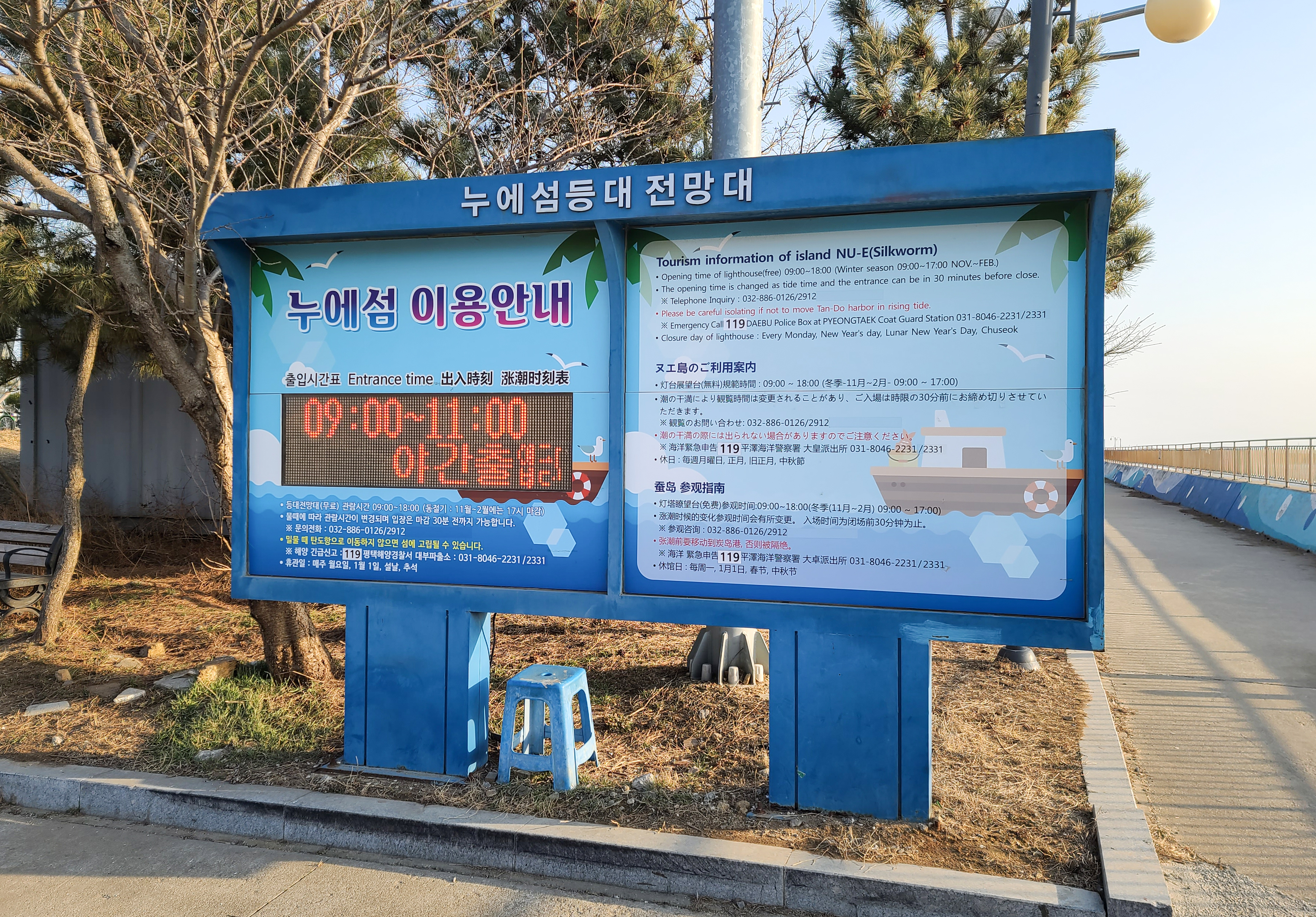 탄도항에 방문하면 위와 같은 안내문을 볼 수 있는데, 누에섬 등대 전망대 방향은 썰물에는 관람이 가능하지만, '밀물 때는 탄도항 방향으로 이동하지 않을 경우 고립될 수 있다' 라는 안내문을 확인할 수 있었습니다. 작년에 찍은 사진에서처럼 물이 차오르기 때문에 밀물 때는 주의가 필요합니다.