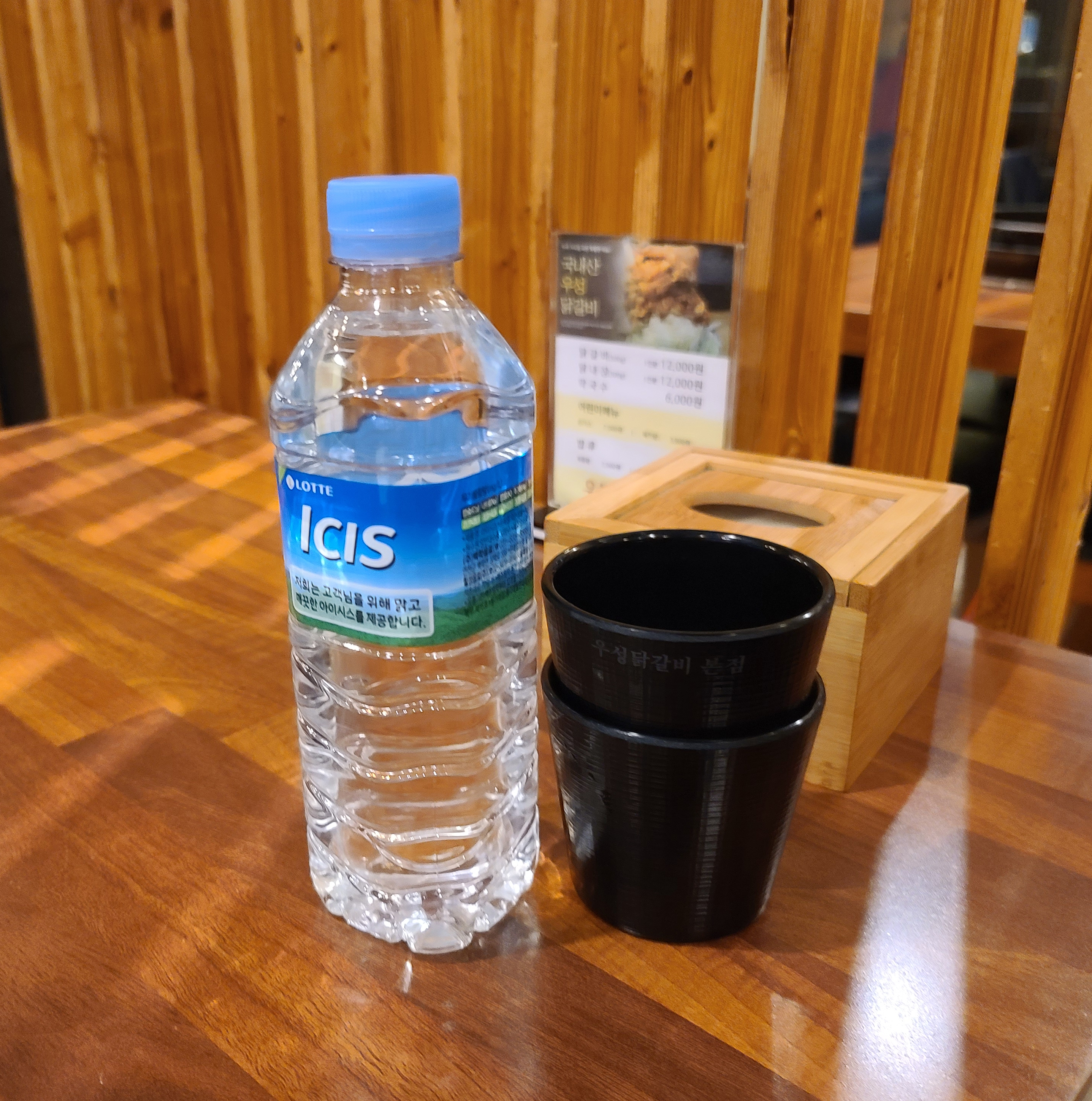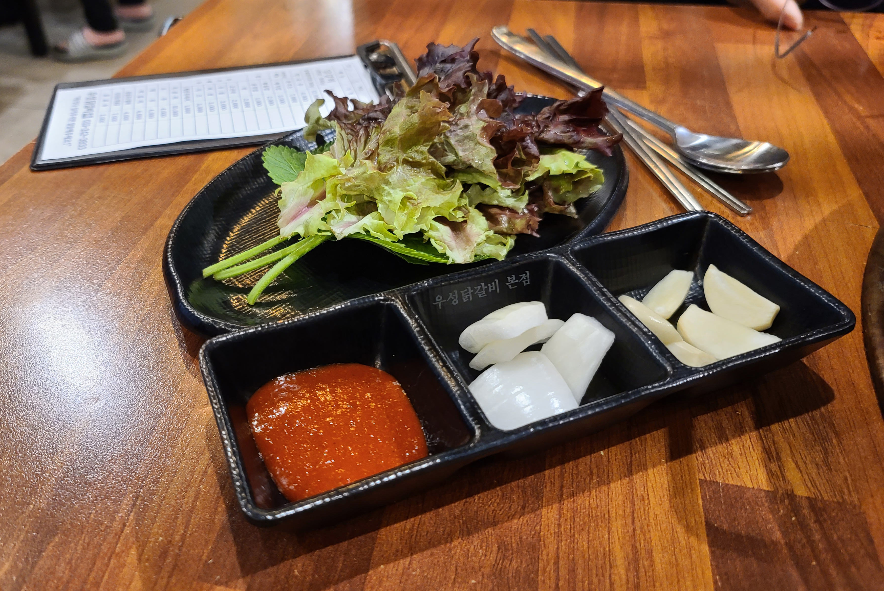 자리를 잡고 앉으면 생수와 동치미, 쌈채소, 양파, 마늘 등을 가져다주십니다. 동치미는 가끔 짤 때가 있지만 나름 시원하고 맛있는 편입니다. 그럼 이제 춘천 우성닭갈비 본점의 메뉴를 함께 살펴보실까요?