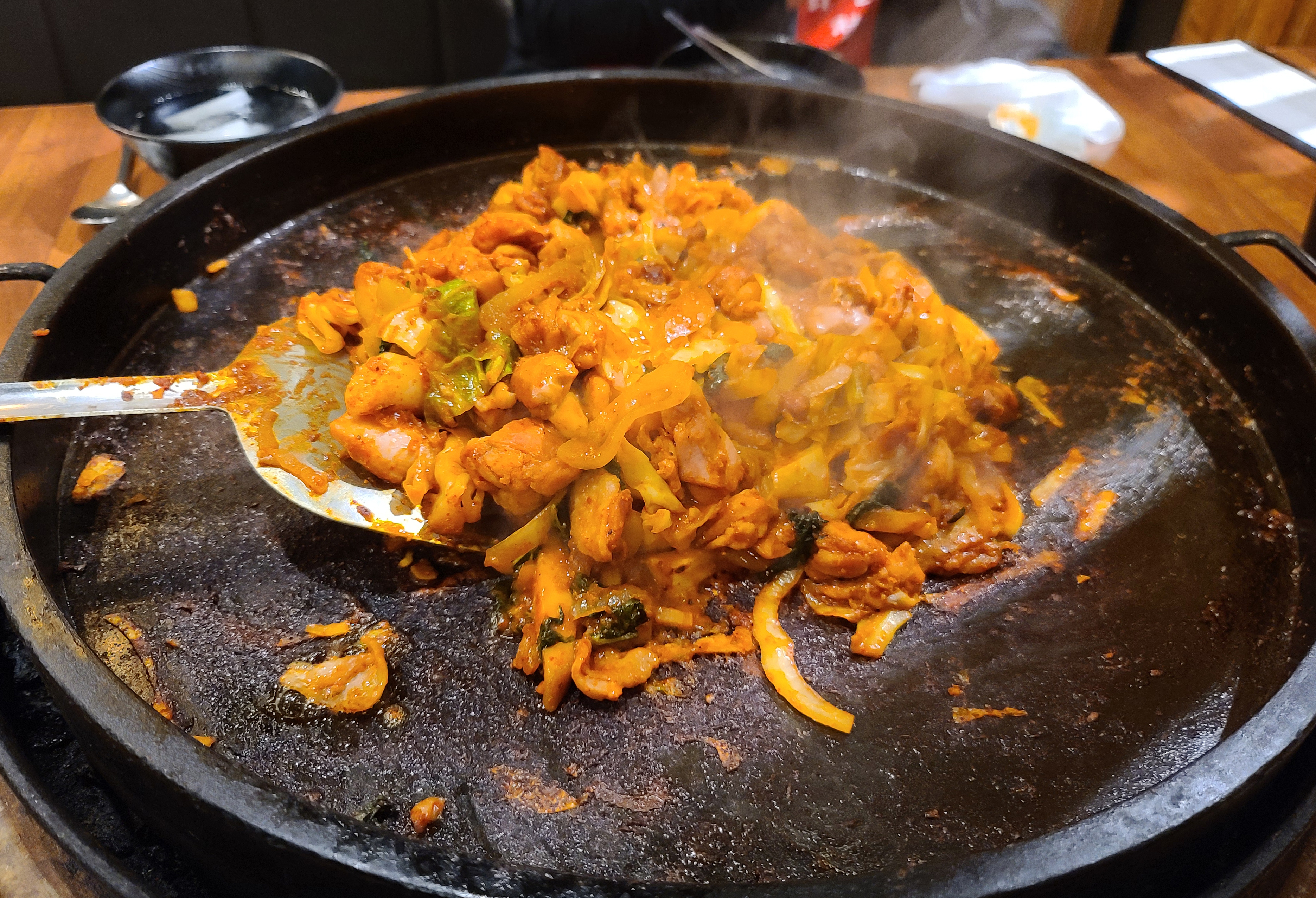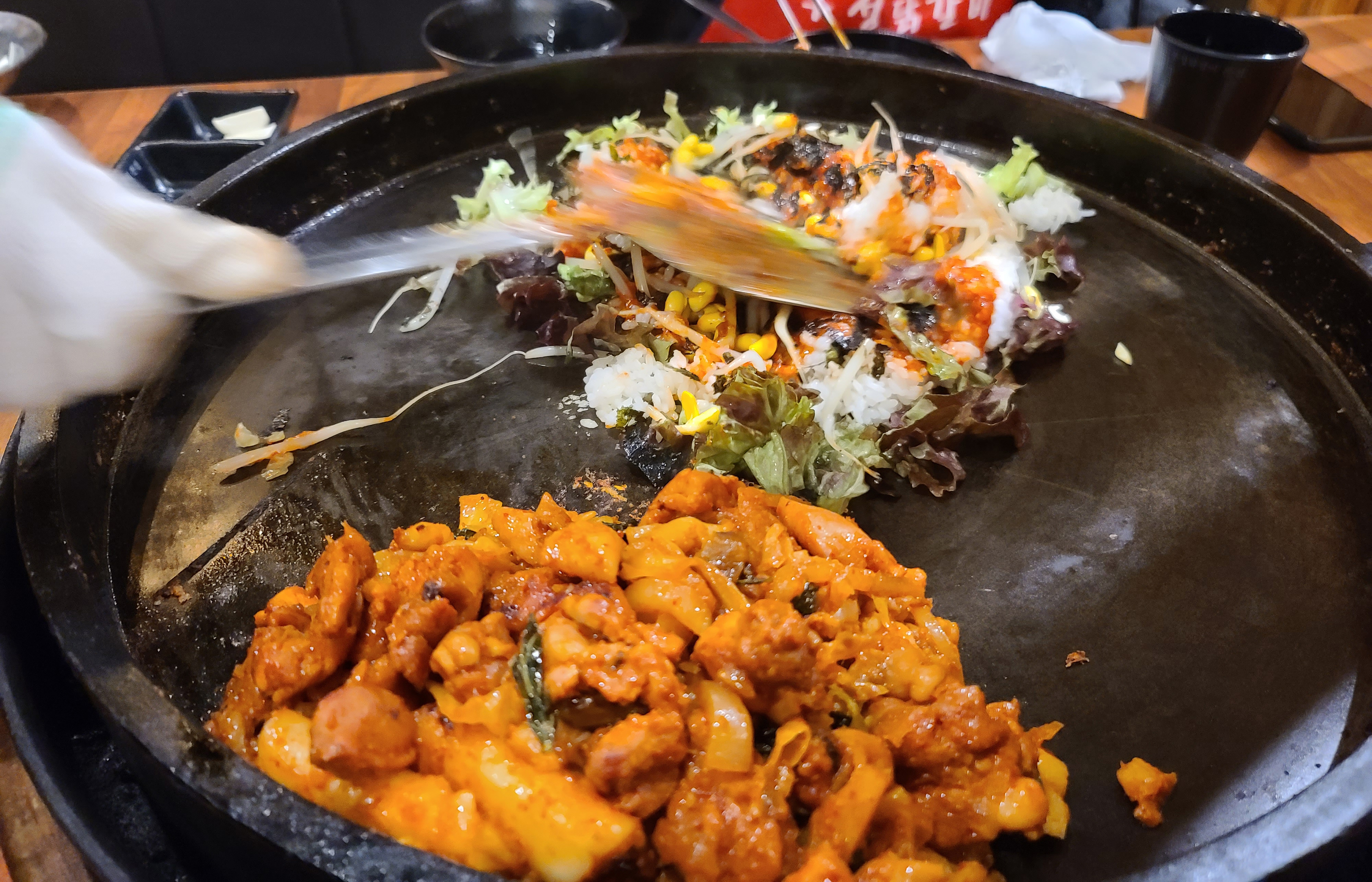 떡과 고구마는 먼저 익기 때문에 배가 고플 땐 떡을 먼저 골라먹으면 되었습니다. 고구마도 잘 익어서 맛있었는데 사진을 별도로 찍지는 않았더라고요. 닭갈비가 먹기 좋게 익을 때가 되면 "이제 드셔도 됩니다" 하고 직원이 알려줍니다.