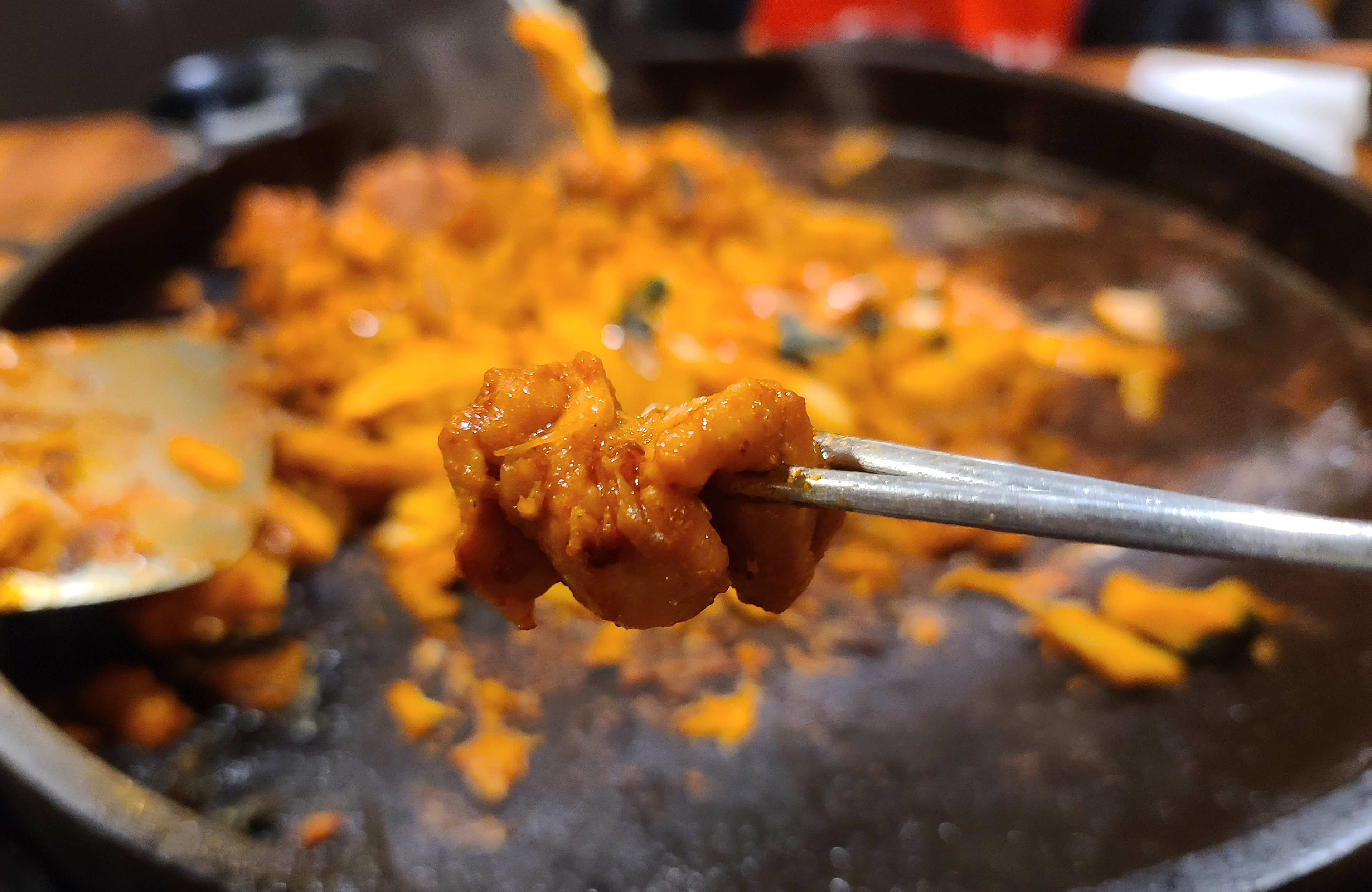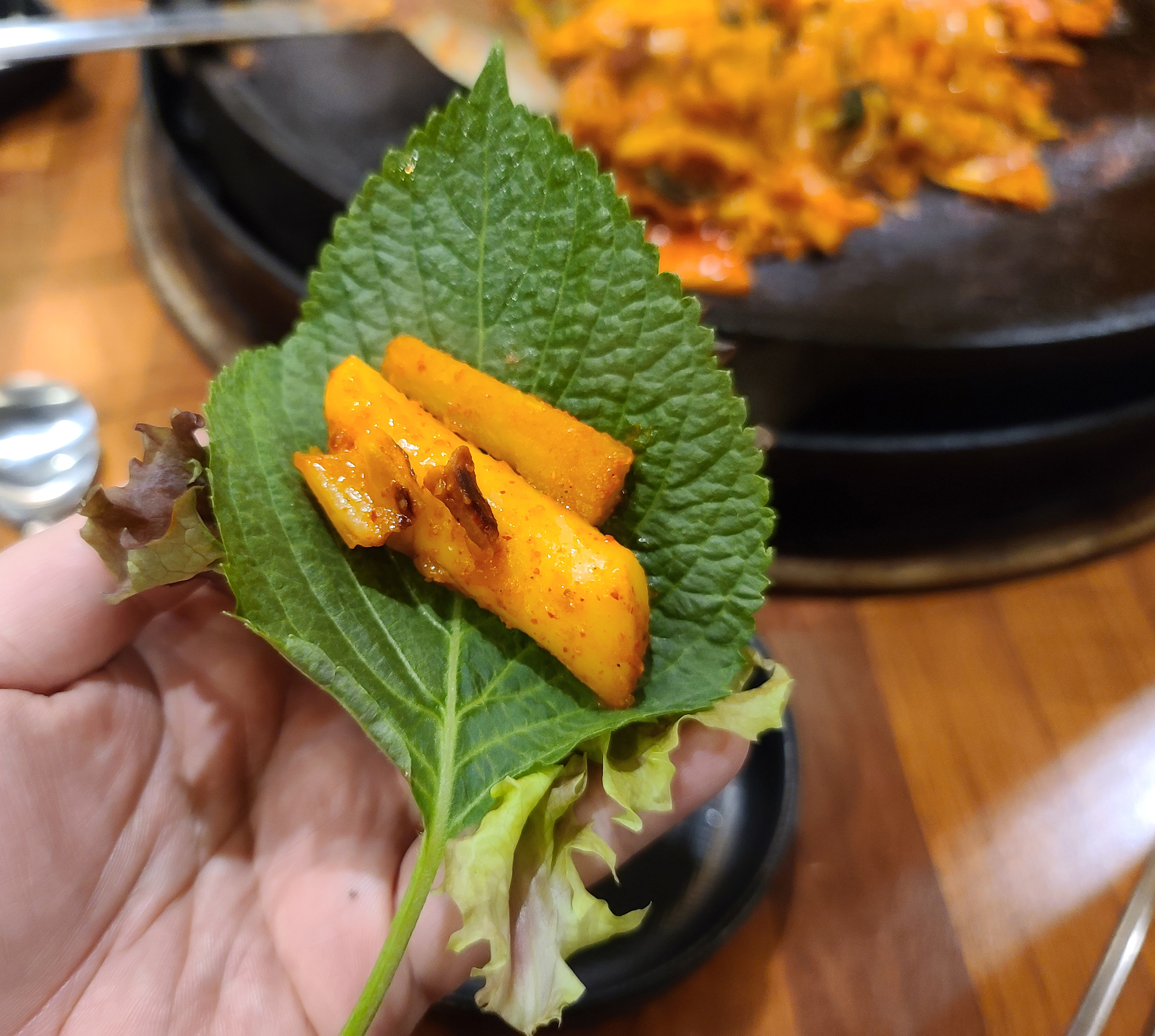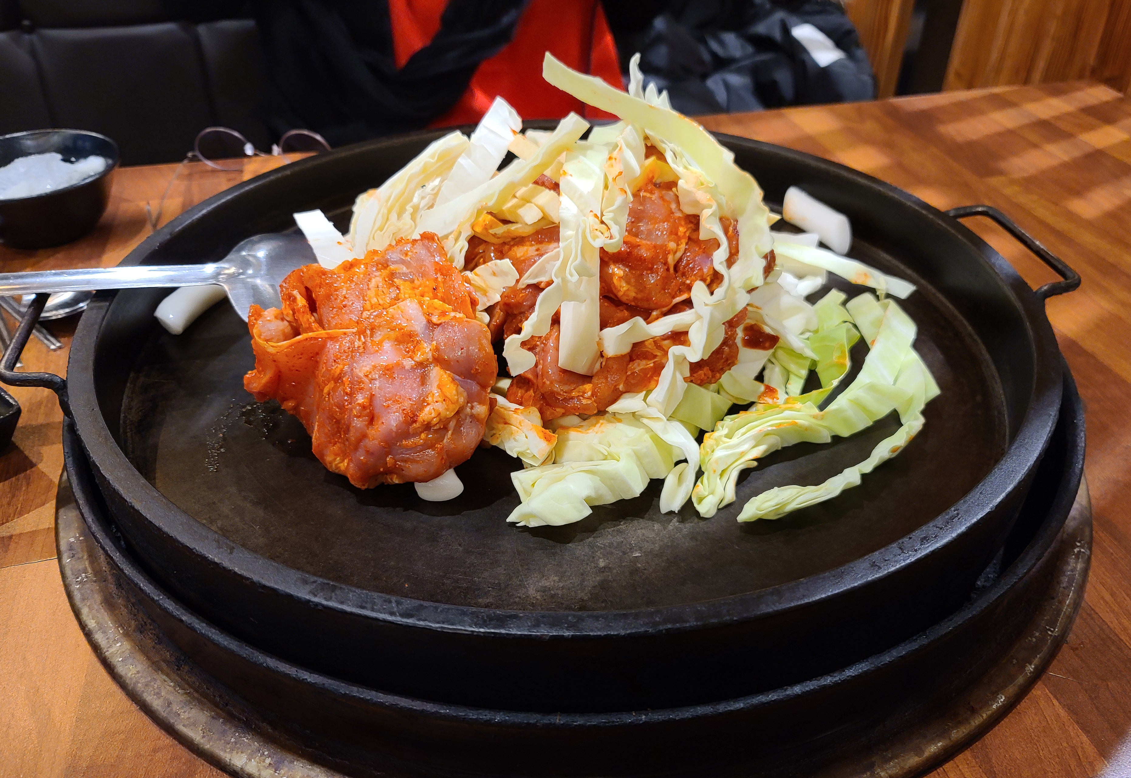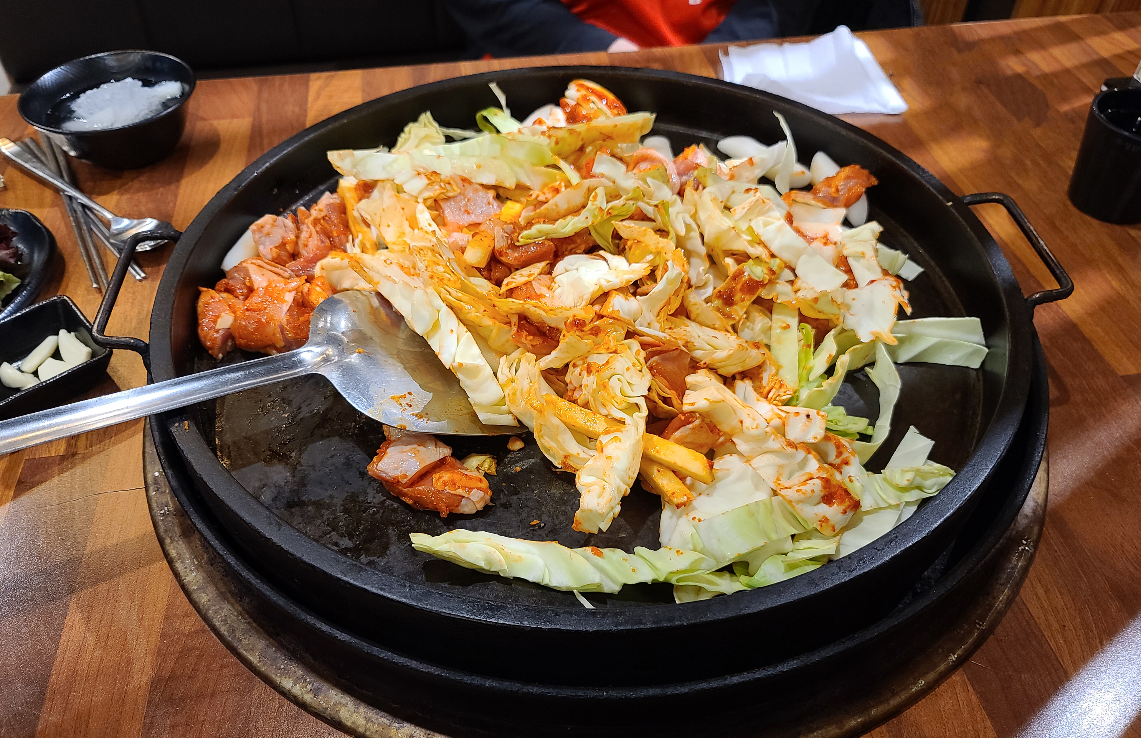 닭갈비는 처음에는 닭고기와 양배추, 떡사리, 고구마를 익혀주다가, 나중에 추가로 소스와 깻잎 등의 채소를 넣어주었습니다. 간이 심심하면 추가로 소스를 넣어달라고 부탁하면 되었고, 이용하는 대부분 간이 심심했던 적은 없어서 따로 소스를 추가하지 않고 먹었습니다.