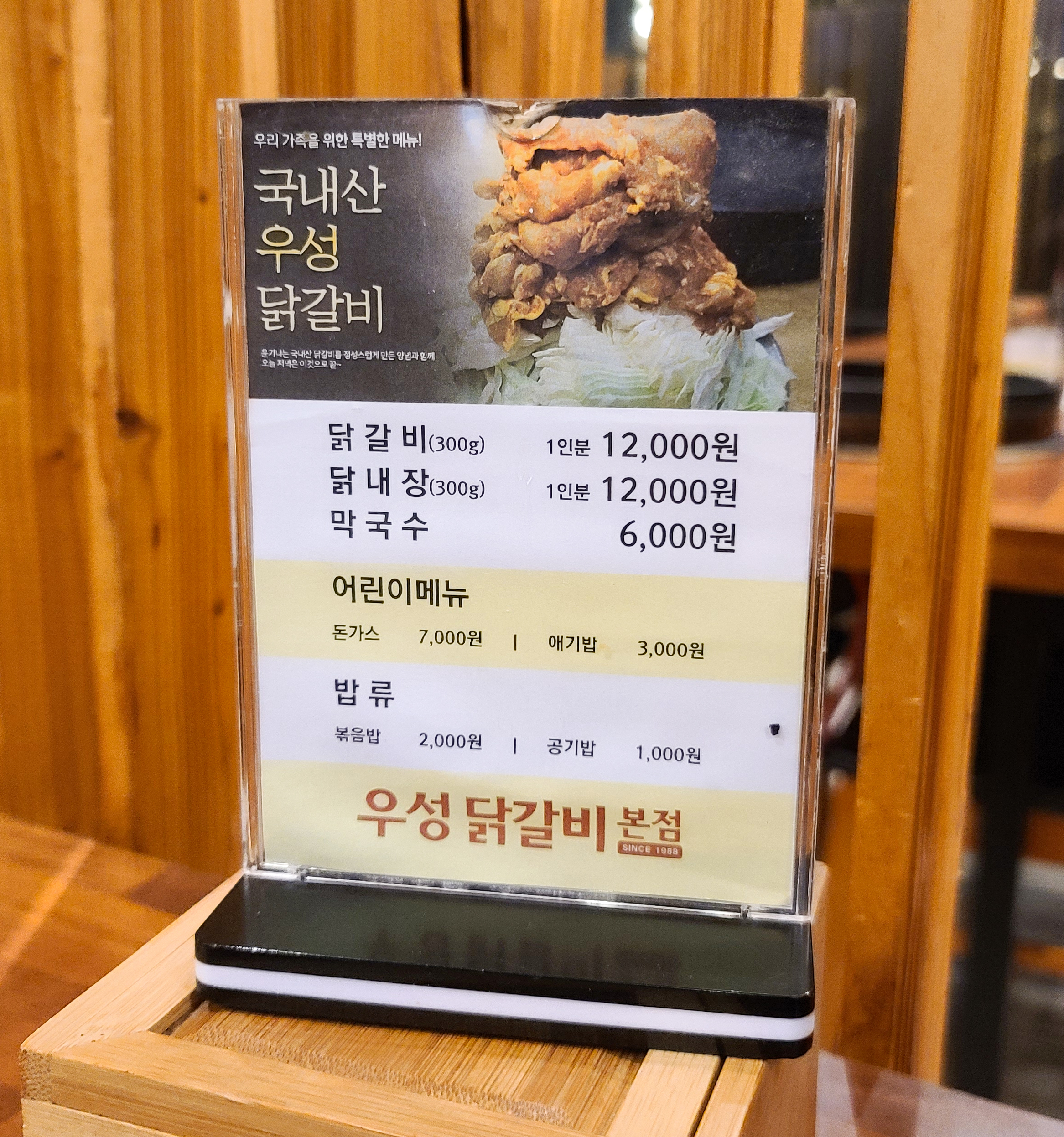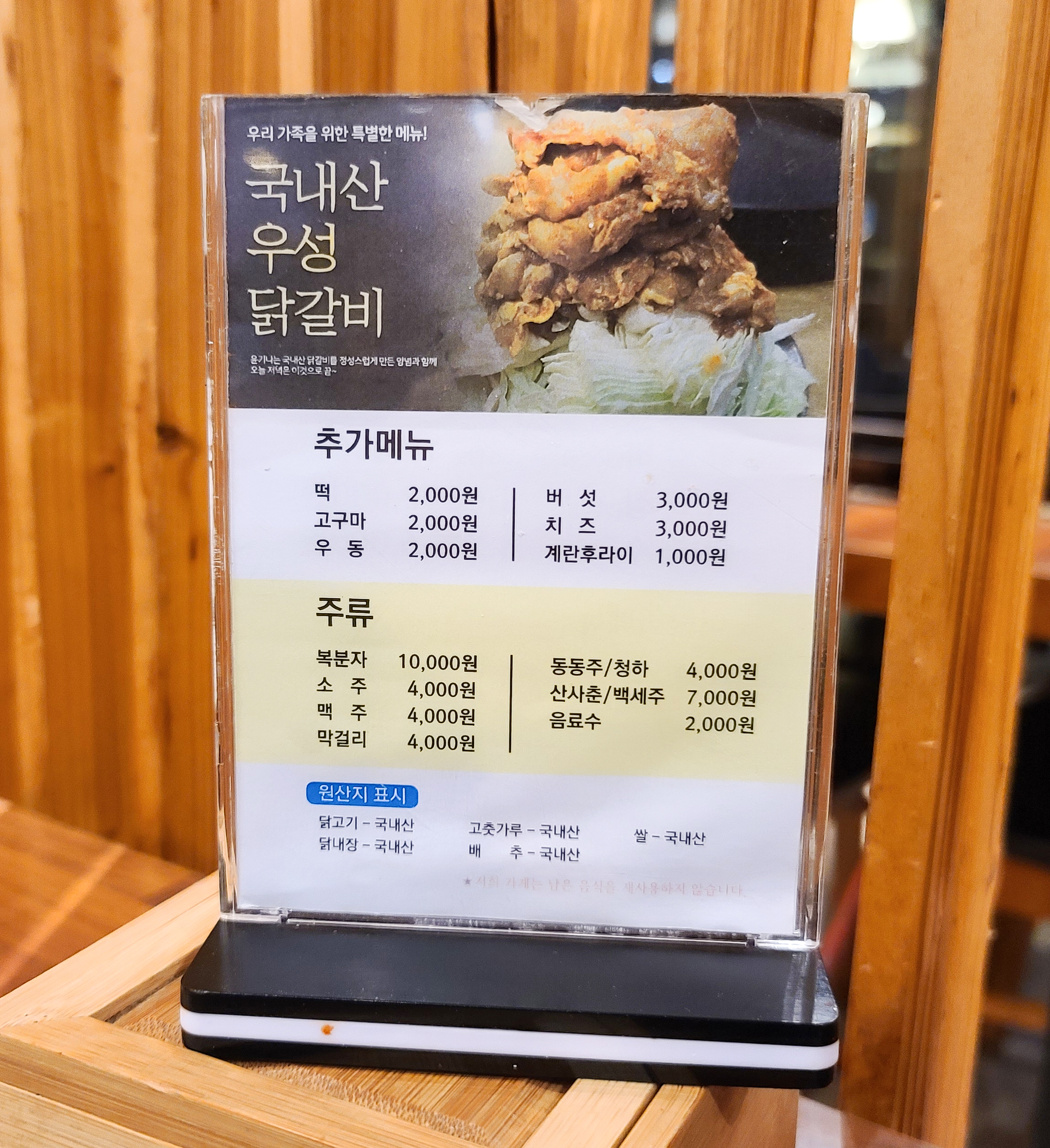 우성닭갈비 본점의 메뉴는 닭갈비, 닭내장, 막국수, 어린이메뉴, 볶음밥, 공기밥 등이 있었습니다. 원산지 표시를 보면 닭고기, 닭내장, 고춧가루, 배추, 쌀 모두 국내산을 사용하고 있었습니다. 저는 항상 주문하던 것처럼 닭갈비를 주문했습니다.