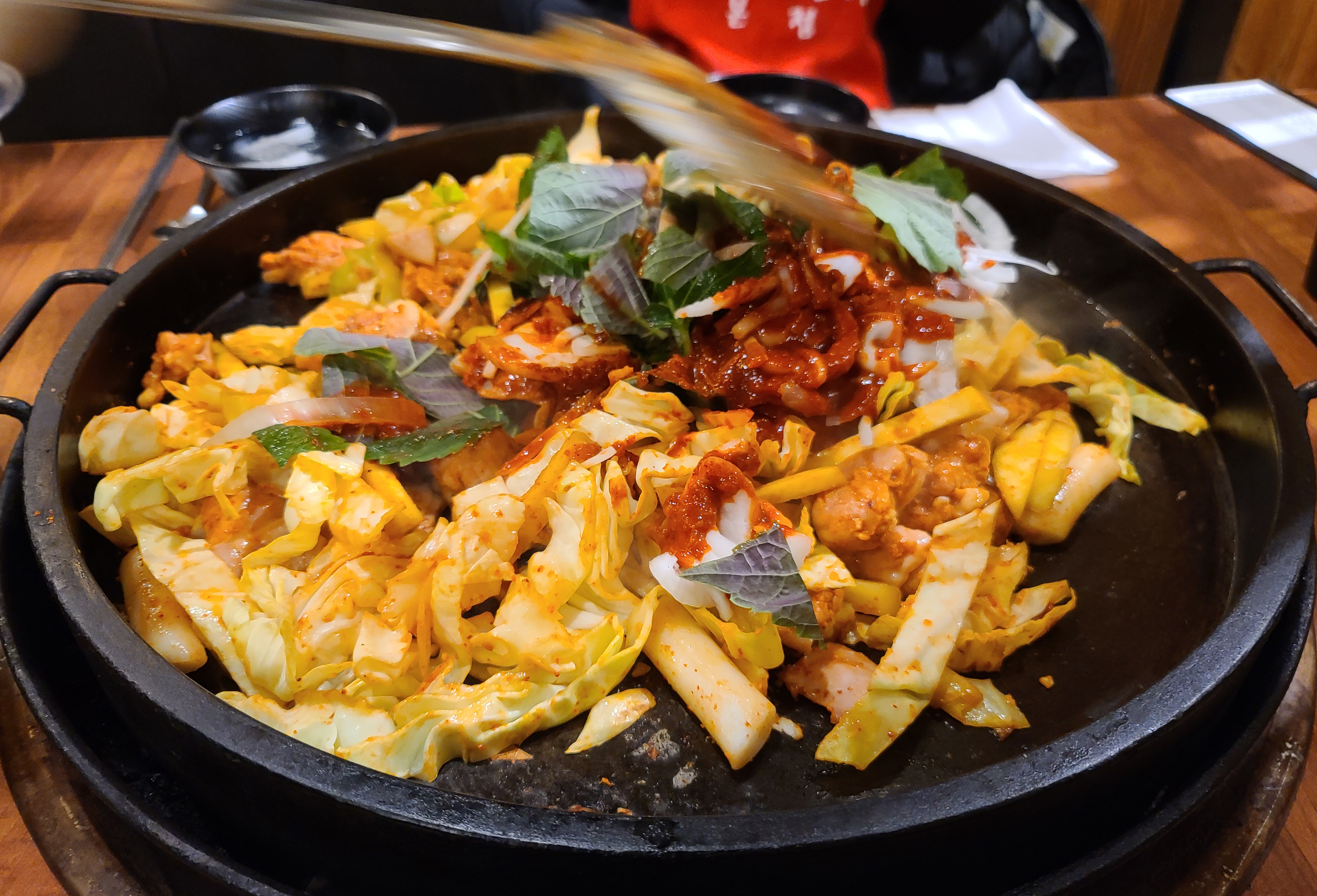 닭갈비는 처음에는 닭고기와 양배추, 떡사리, 고구마를 익혀주다가, 나중에 추가로 소스와 깻잎 등의 채소를 넣어주었습니다. 간이 심심하면 추가로 소스를 넣어달라고 부탁하면 되었고, 이용하는 대부분 간이 심심했던 적은 없어서 따로 소스를 추가하지 않고 먹었습니다.