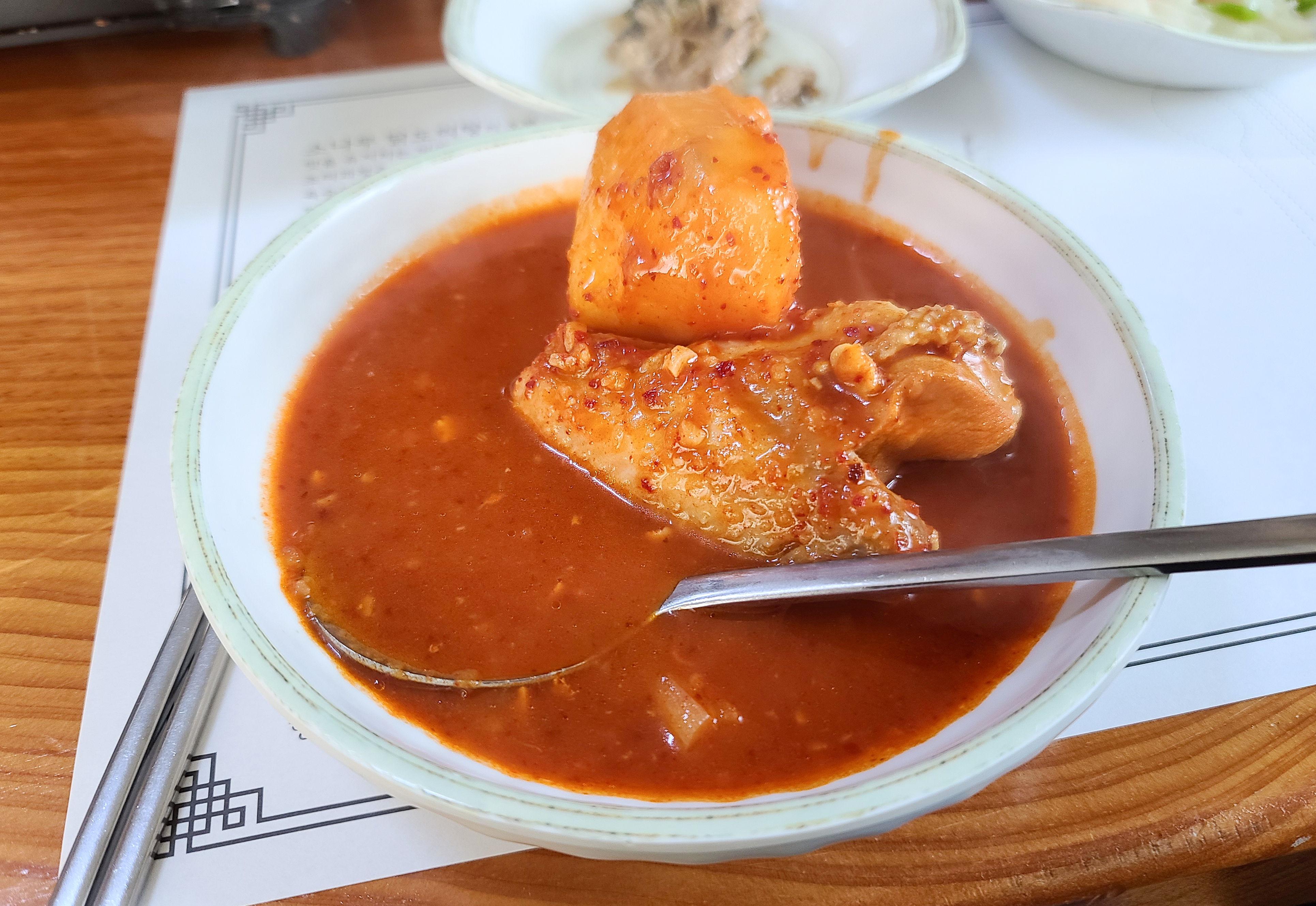 소나무집의 반찬은 위와 같이 나오는데, 감자전, 두부김치, 장조림, 어묵볶음, 김치, 감자채조림, 콩나물무침 등이 나왔습니다. 밥은 기호에 따라 미리 주문하셔도 되고, 나중에 닭도리탕 국물에 볶아서 먹어도 되었습니다. 반찬들 대부분 깔끔하고 담백한 맛이 좋았습니다.