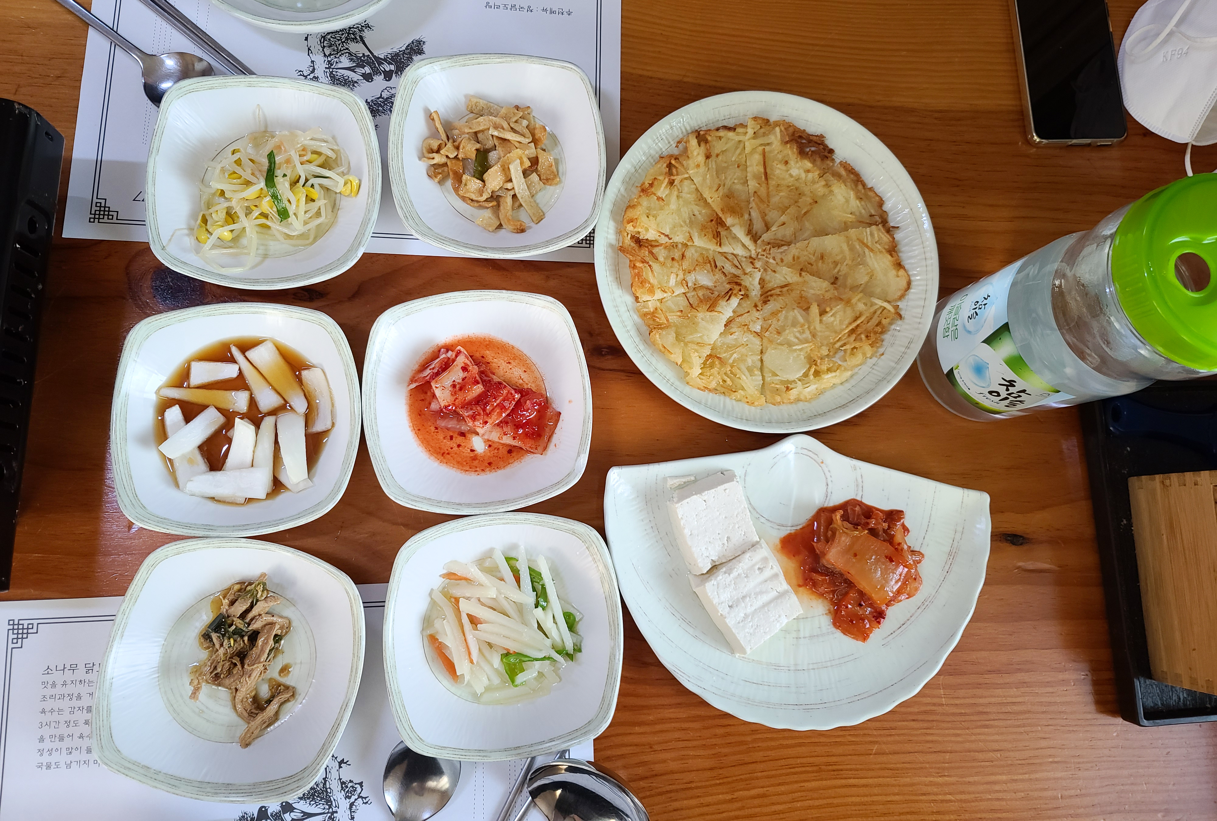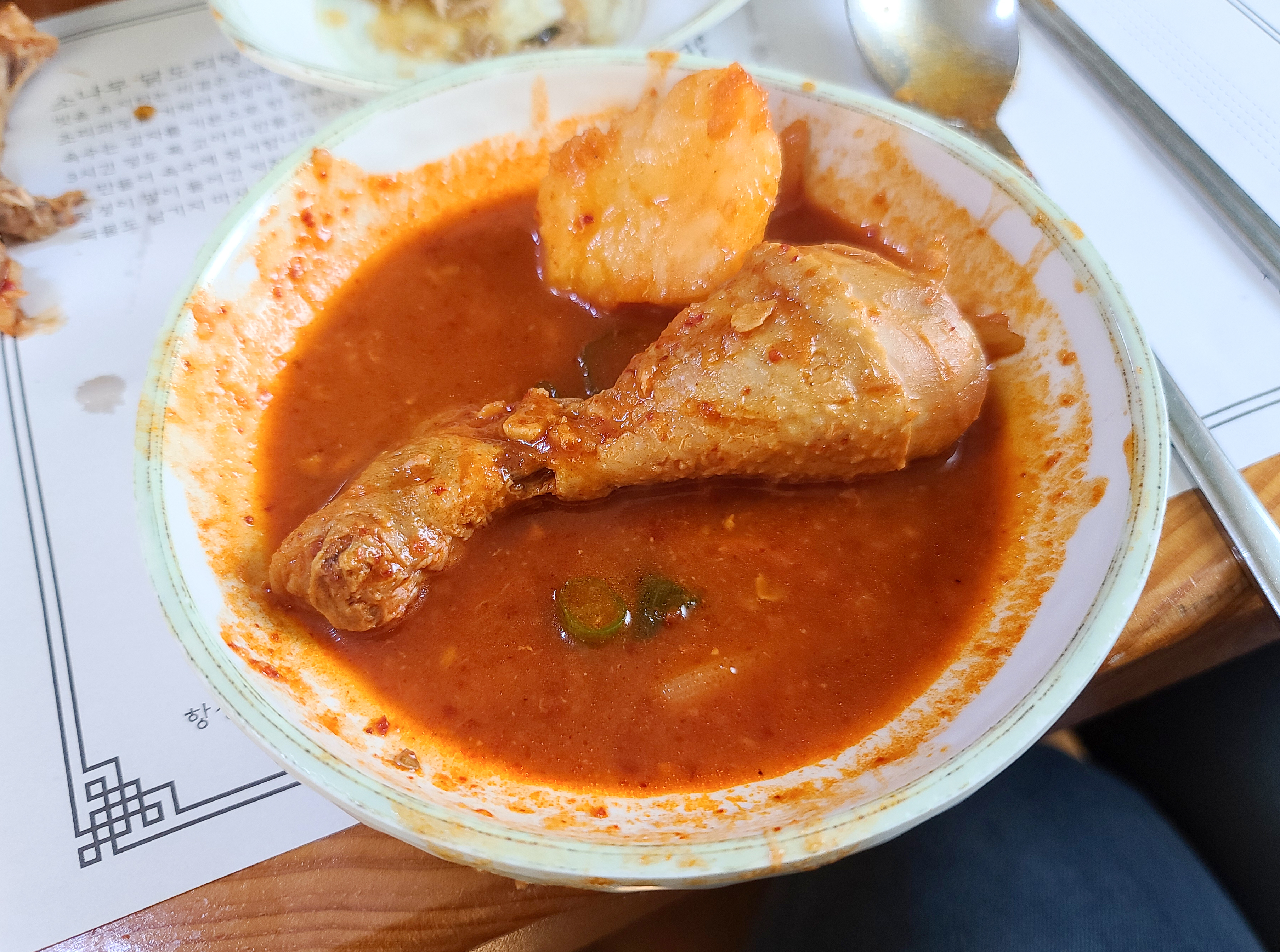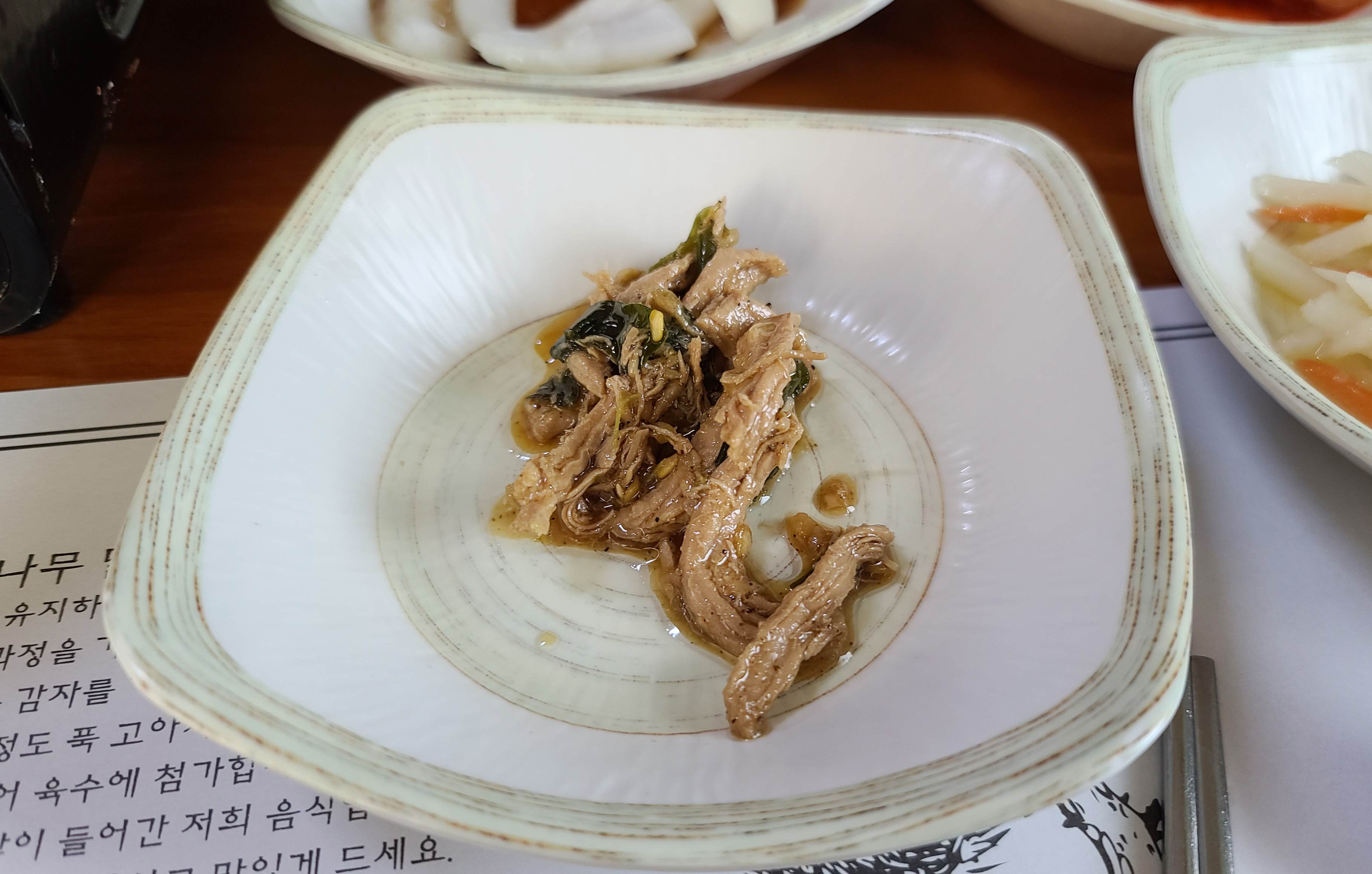 소나무집의 반찬은 위와 같이 나오는데, 감자전, 두부김치, 장조림, 어묵볶음, 김치, 감자채조림, 콩나물무침 등이 나왔습니다. 밥은 기호에 따라 미리 주문하셔도 되고, 나중에 닭도리탕 국물에 볶아서 먹어도 되었습니다. 반찬들 대부분 깔끔하고 담백한 맛이 좋았습니다.