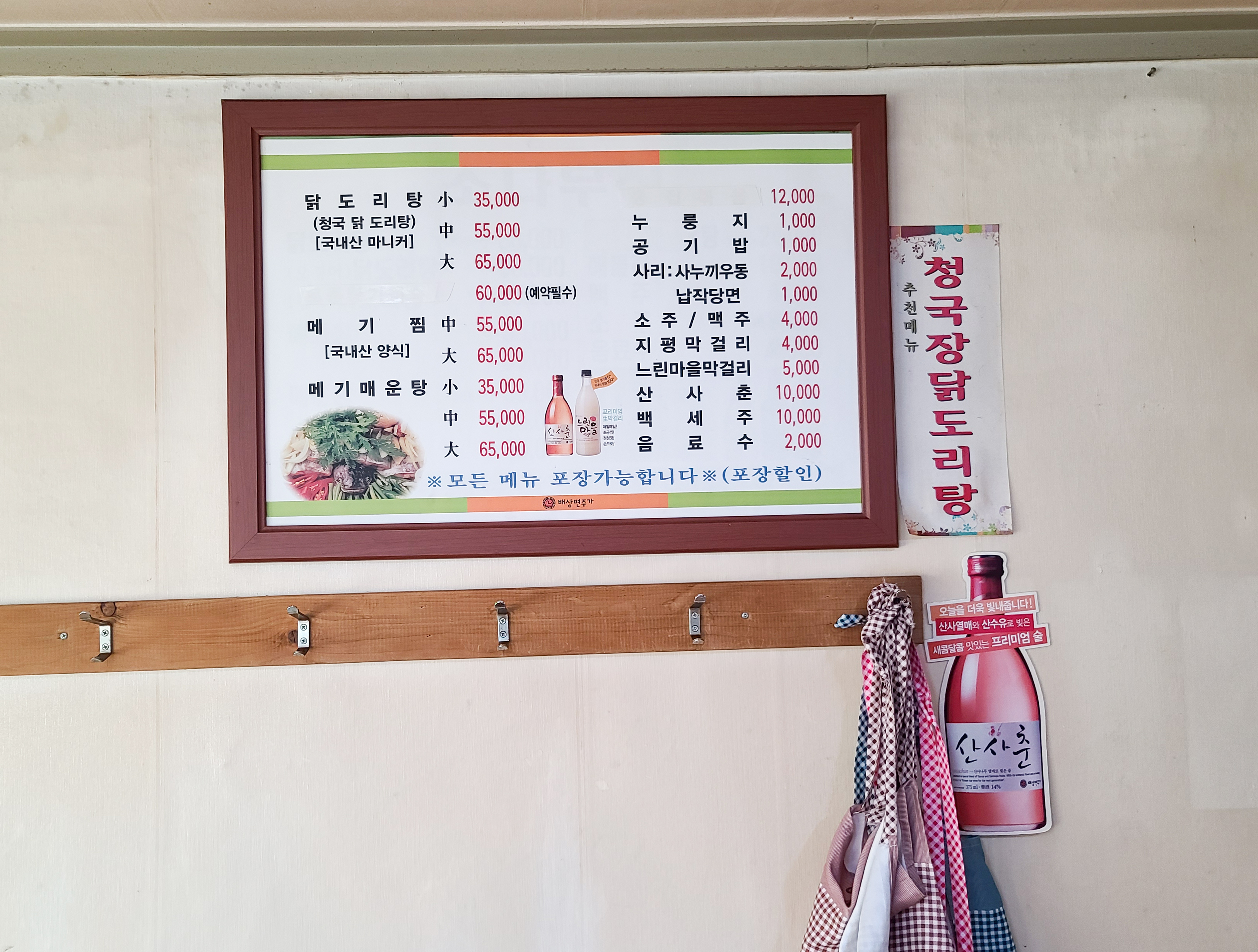 소나무집 만의 청국장 닭볶음탕(닭도리탕)은 독특한 매력이 있는 메뉴입니다. 특히 소나무집 닭도리탕은 국물이 덜 자극적이며, 은은한 청국장 향으로 자꾸만 당기는 매력이 있습니다. 서초 소나무집의 메뉴는 닭도리탕, 청국닭도리탕, 메기찜, 메기매운탕, 누룽지, 공기밥, 사리 등이 있었습니다. 참고로 이 가게는 예약을 미리하고 방문하시는 것을 추천드립니다.
