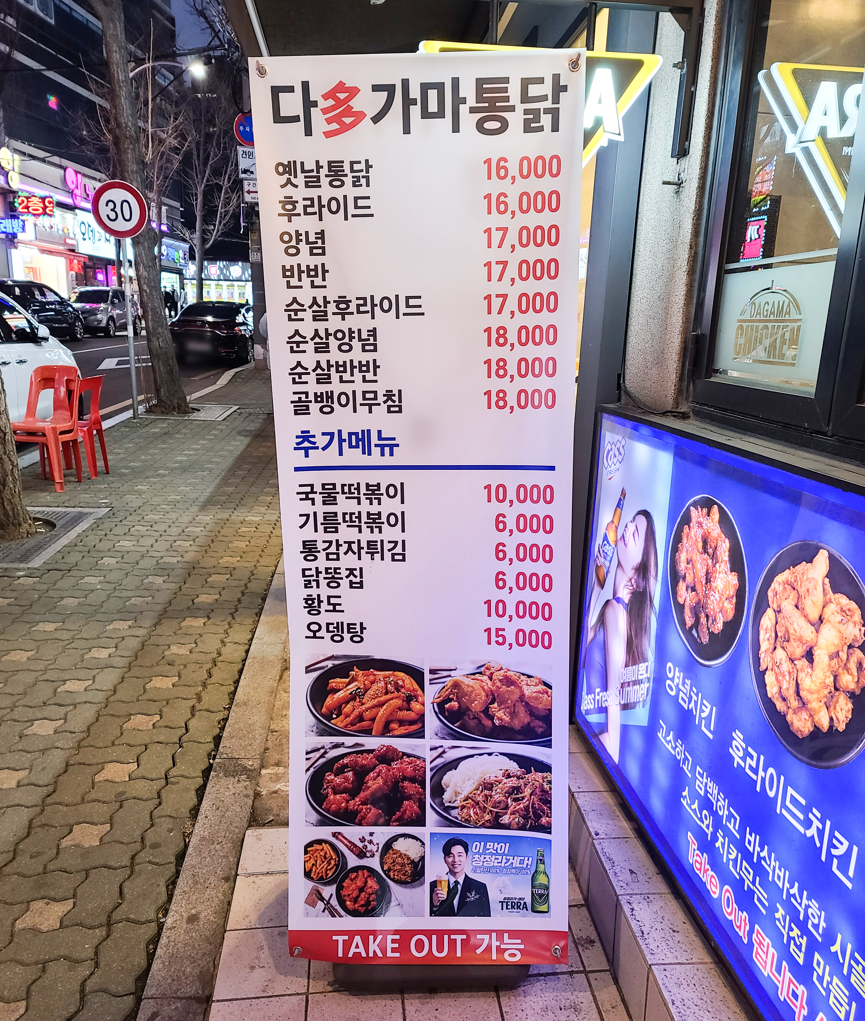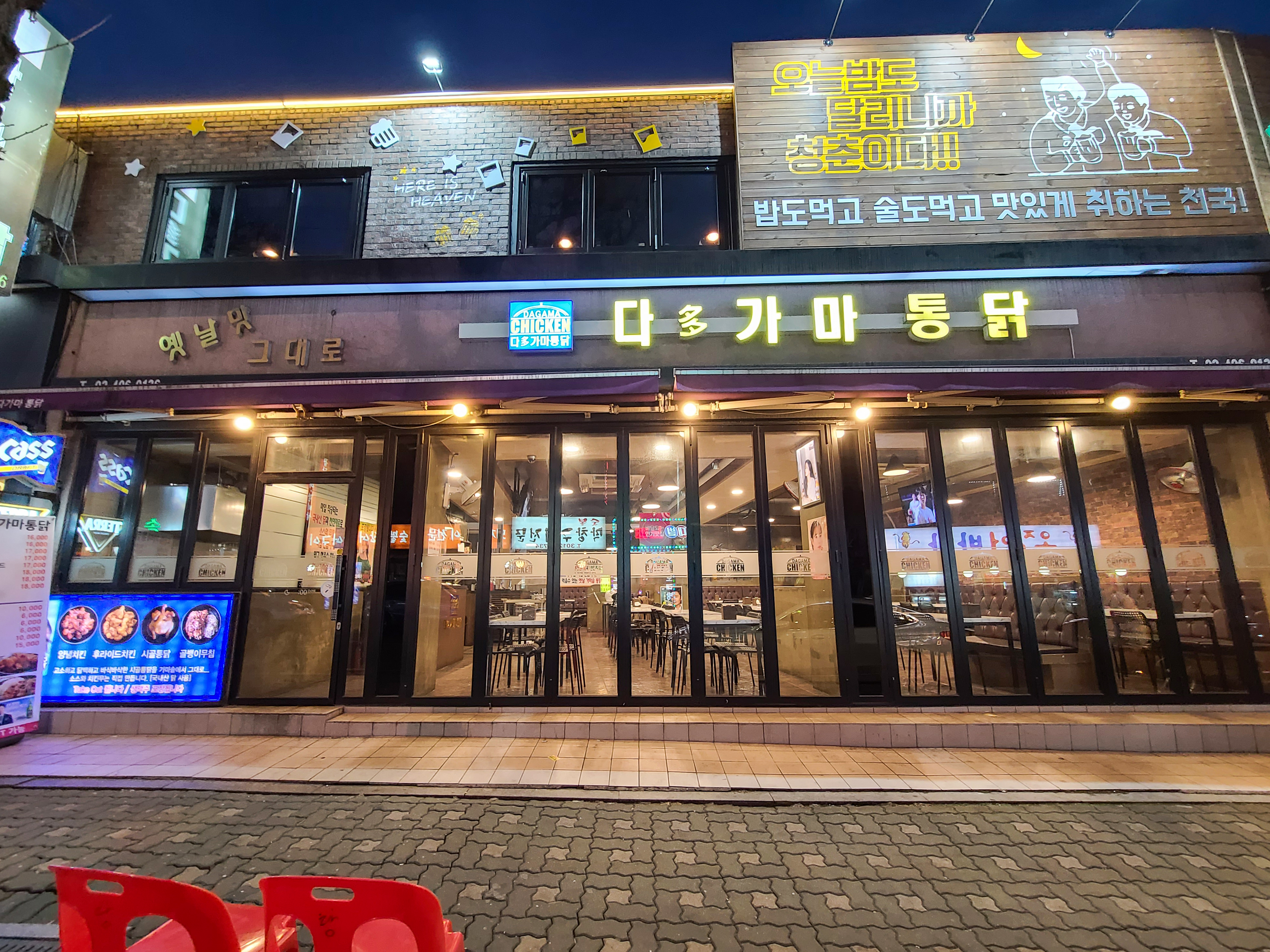 가락시장역 치킨집 다가마통닭의 모습은 위와 같습니다. 가마솥에 치킨을 튀겨주는 치킨집 다가마통닭은 넓은 실내를 갖추고 있는 가게입니다. 주차장은 별도로 마련되어있지는 않습니다. 가게 앞 도로는 주・정차 위반 단속을 자주 하기 때문에 가게 앞에 주차하는 것은 추천드리지 않습니다. 저 역시 포장하러 갔다가 단속당한 경험이 있기 때문에, 가급적 다른 곳에 주차를 한 다음 가게를 이용하는 편입니다.