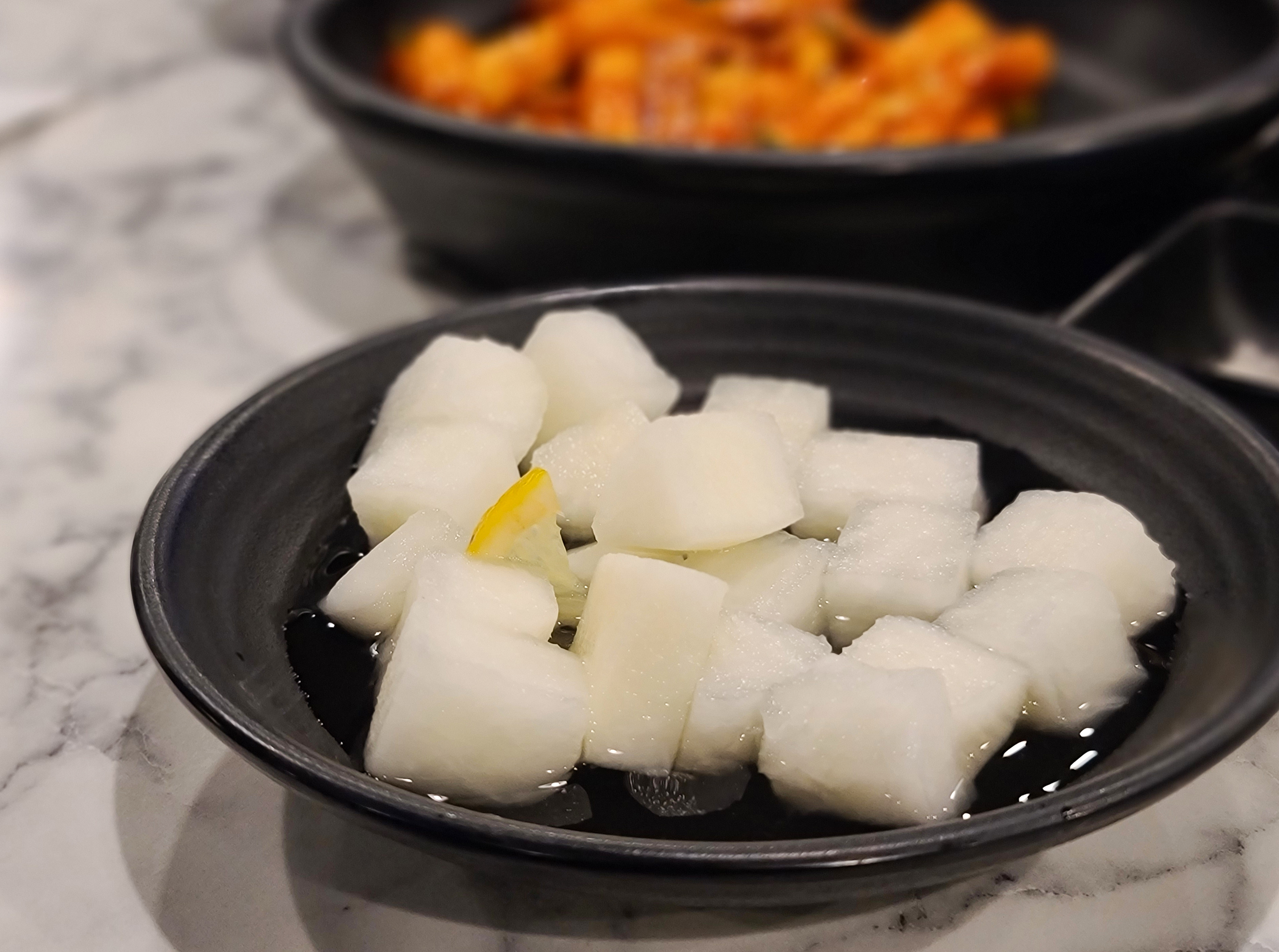 우선 기름떡볶이부터 살펴보시죠. 다가마통닭의 기름떡볶이는 매콤한 어묵볶음(?)을 떠올리게 하는 맛인데요, 튀긴 떡과 어묵을 매콤한 소스에 버무려 제공하고 있는 메뉴였습니다. 쫄깃한 떡과 어묵을 먹으면 자연스럽게 입맛이 도는 것 같습니다. 이제 메인 메뉴인 치킨을 함께 살펴보실까요?