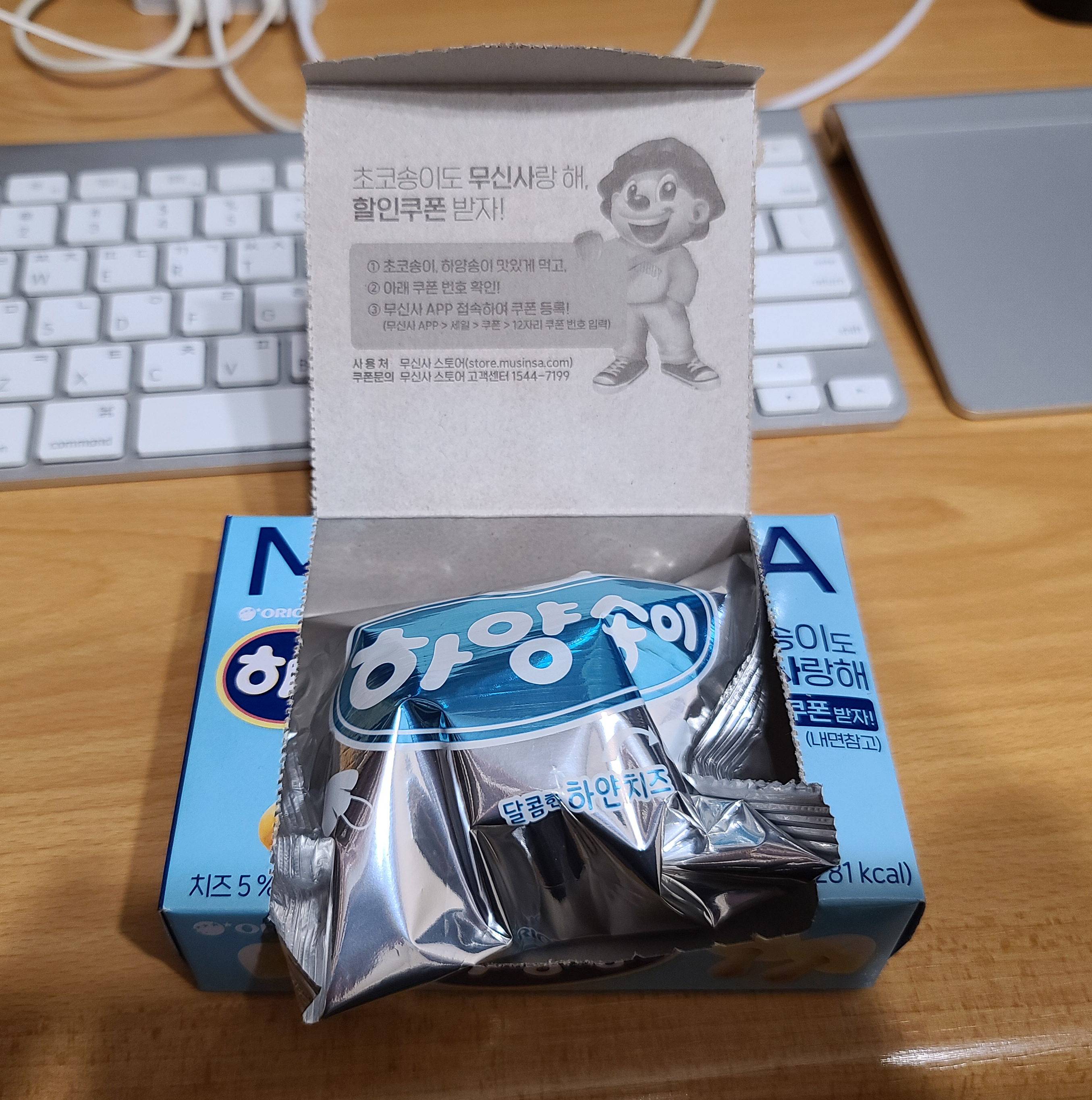 하양송이의 봉지를 뜯어서 과자 상자에 담아서 먹었습니다. 화이트 치즈의 맛이 달콤하긴 한데, 요즘 단 맛이 당기지 않아서 많이는 못 먹겠더라고요. 쌉싸름한 커피와 먹는다면 모를까..(ㅋㅋ)