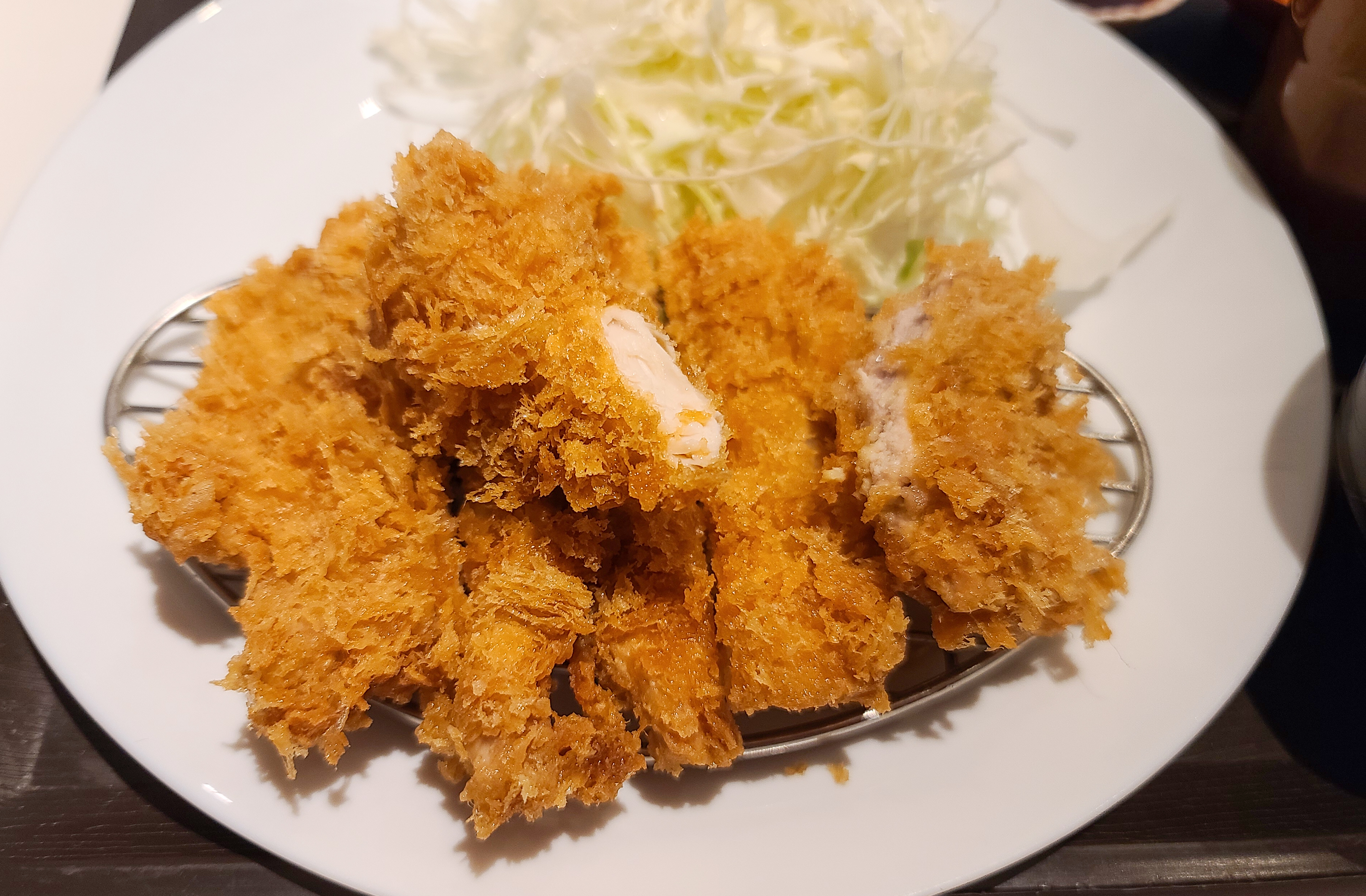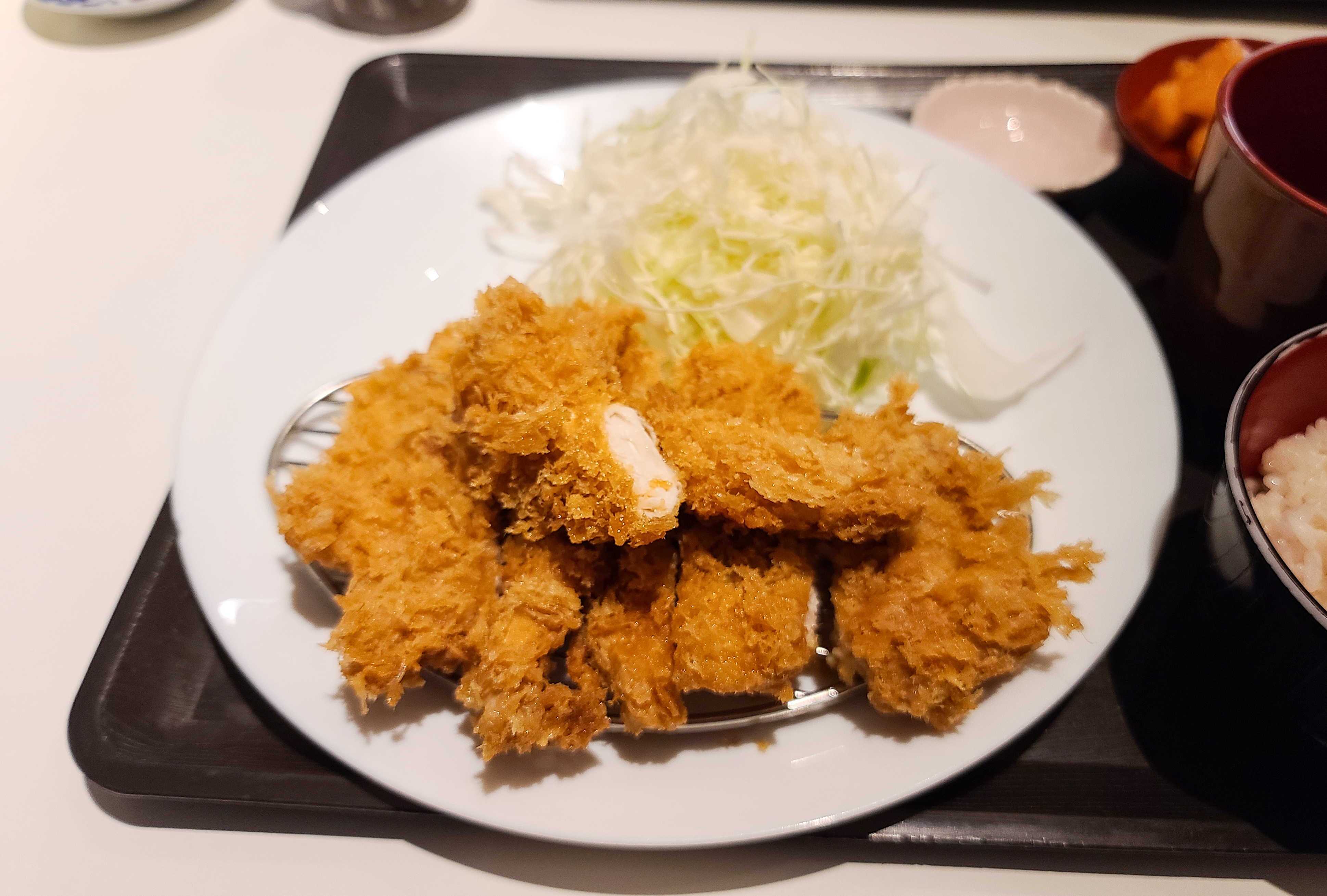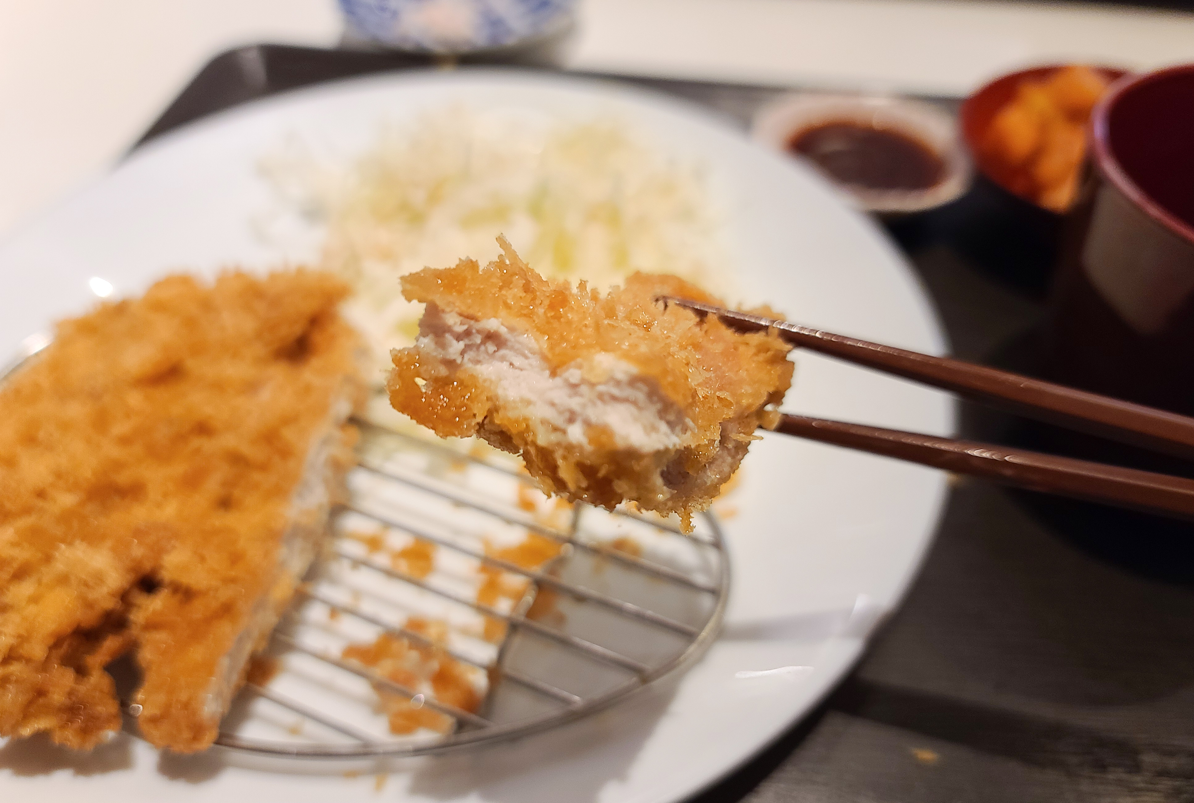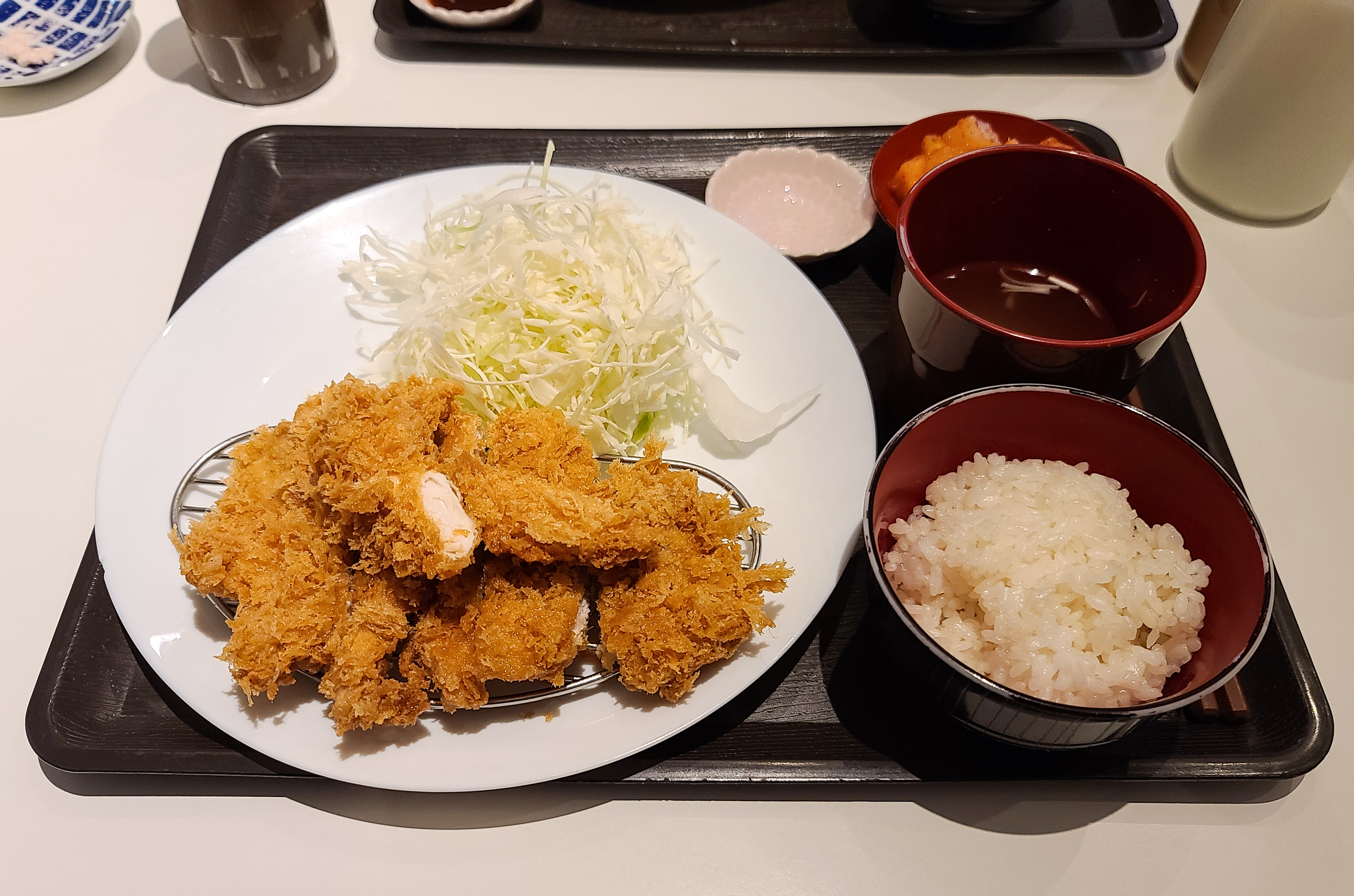 곧이어 주문한 등심카츠가 나왔습니다. 참고로 청담동 카츠로우의 클래식카츠, 카츠카레, 오로시카츠 메뉴에는 치킨카츠 2조각이 서비스로 제공됩니다. 기호에 따라서 겨자, 와사비, 암염(핑크솔트) 등을 곁들여 먹을수도 있었습니다. 저는 원래 먹던대로 우스터소스와 깨간장소스를 섞고, 암염은 추가로 받아서 먹었습니다.