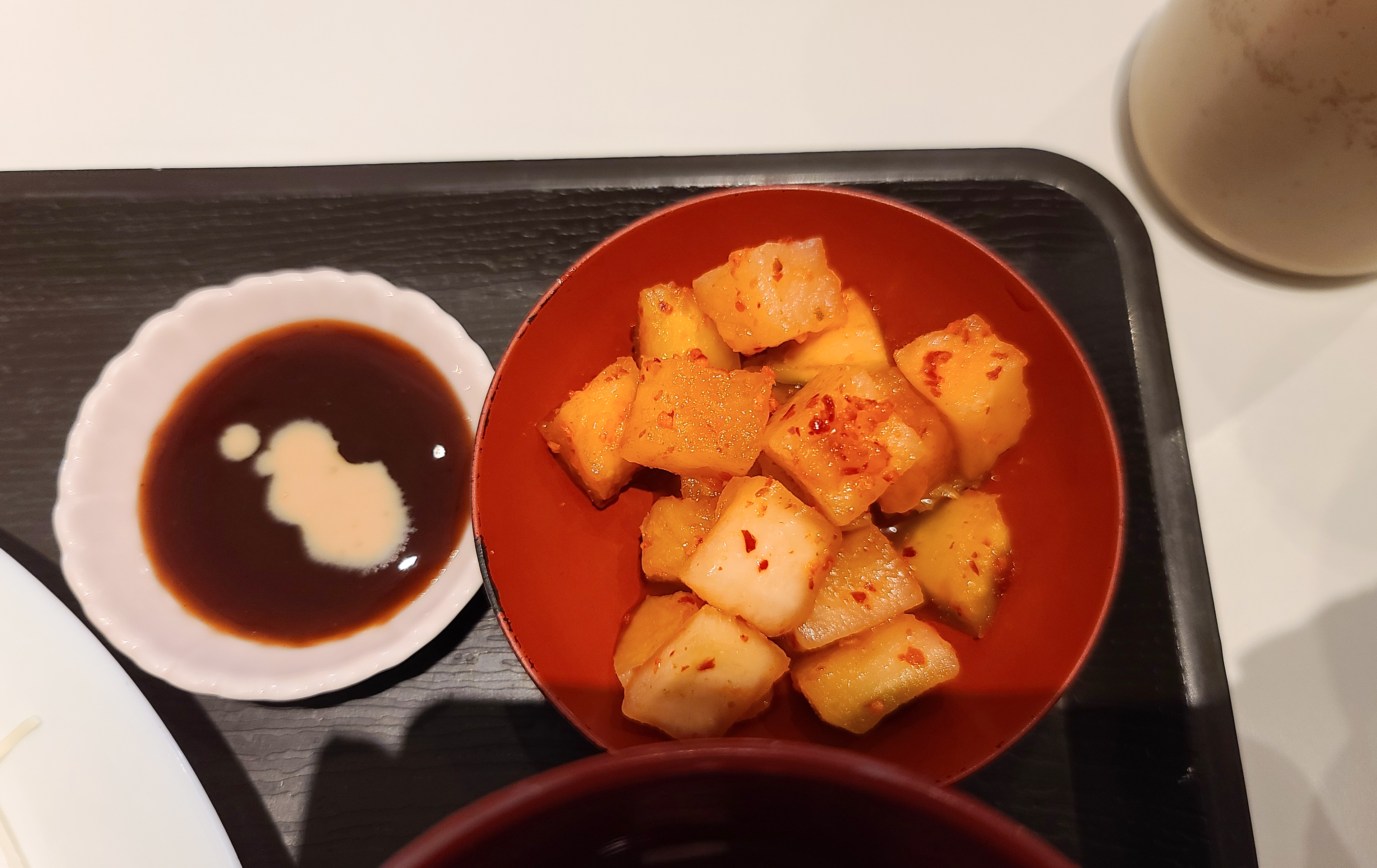 돈까스는 깨끗한 기름에 튀겨내어 그런지 튀김에서 기름냄새가 안났고, 바삭하게 잘 튀겨낸 튀김옷이 맛있었습니다. 같이나온 무김치와 장국도 맛있었는데, 무김치는 단 맛이 강했습니다. 그래도 이게 은근히 돈까스와 조합이 잘 맞아서 당기는 매력이 있어서 자꾸만 손이가더라고요.