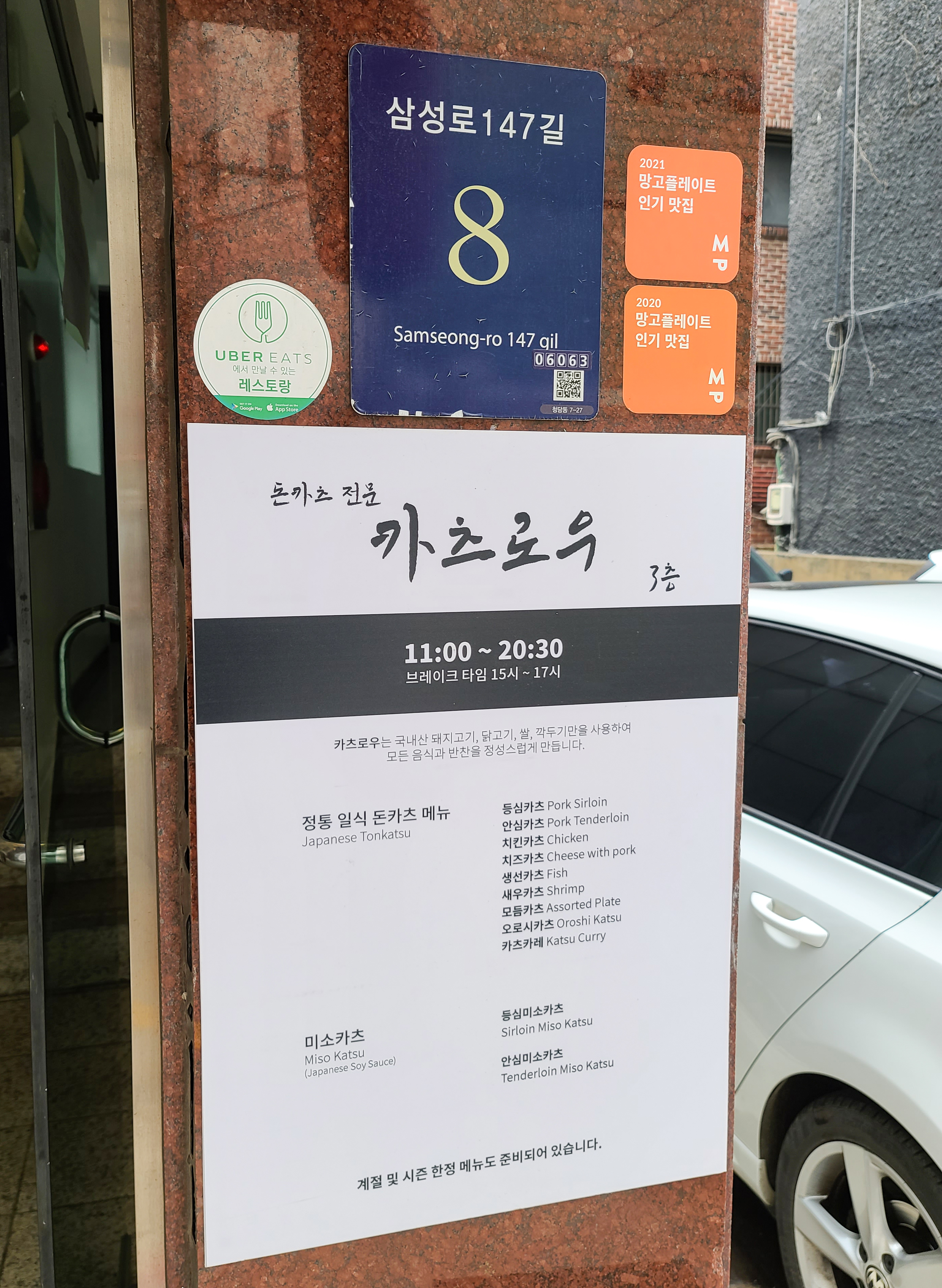 청담동 카츠로우의 도로명주소는 삼성로147길8, 3층 이며, 가게 옆 공간에 차량 4대정도 주차이용이 가능했습니다. 영업시간은 11시~ 20시30분 까지이며, 브레이크타임은 15~ 17시 까지로 운영되었습니다. 일본식 돈카츠를 만드는 가게여서 그런지, 가게는 일본느낌의 분위기를 잘 살린 인테리어와 소품들이 돋보였습니다.