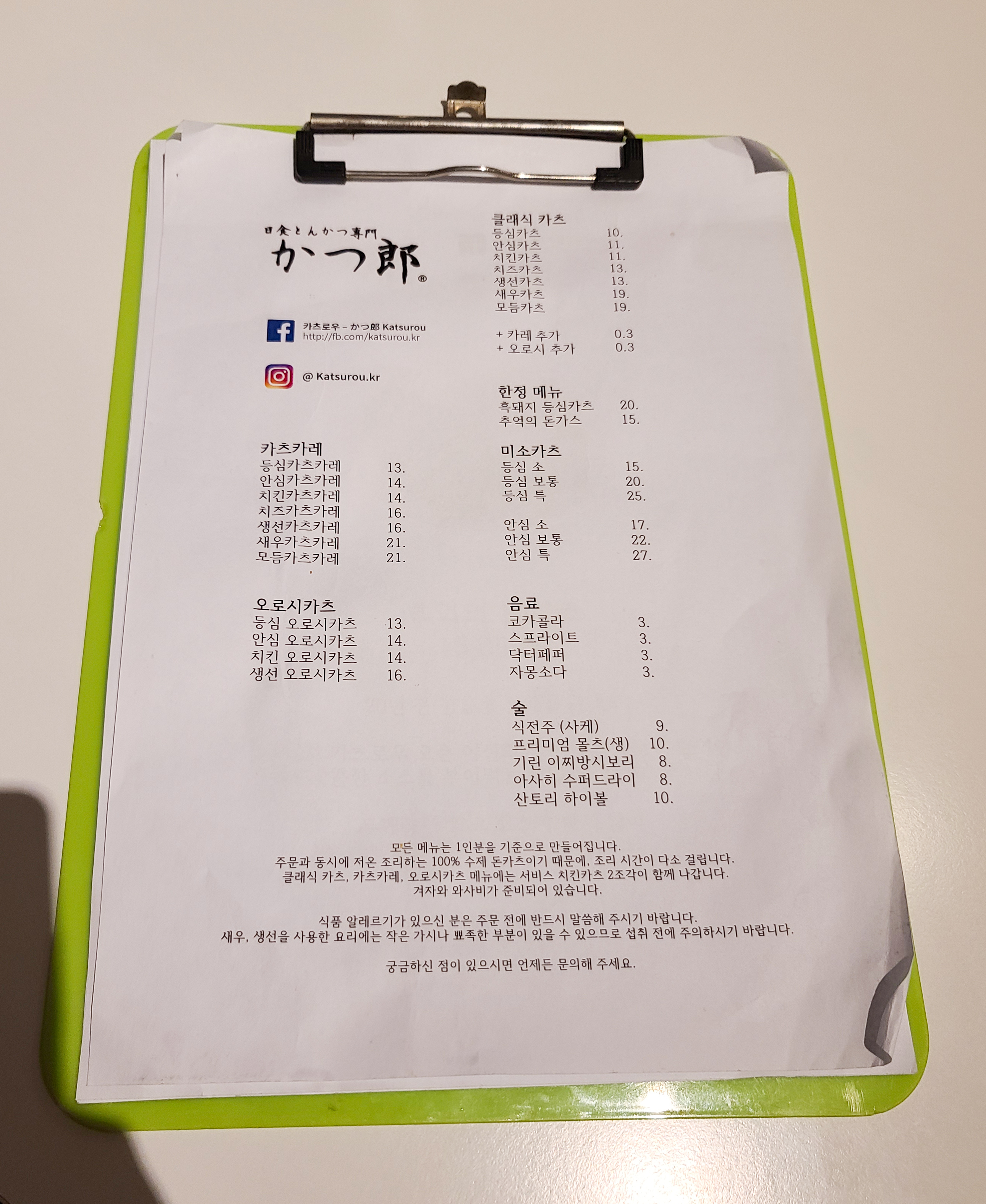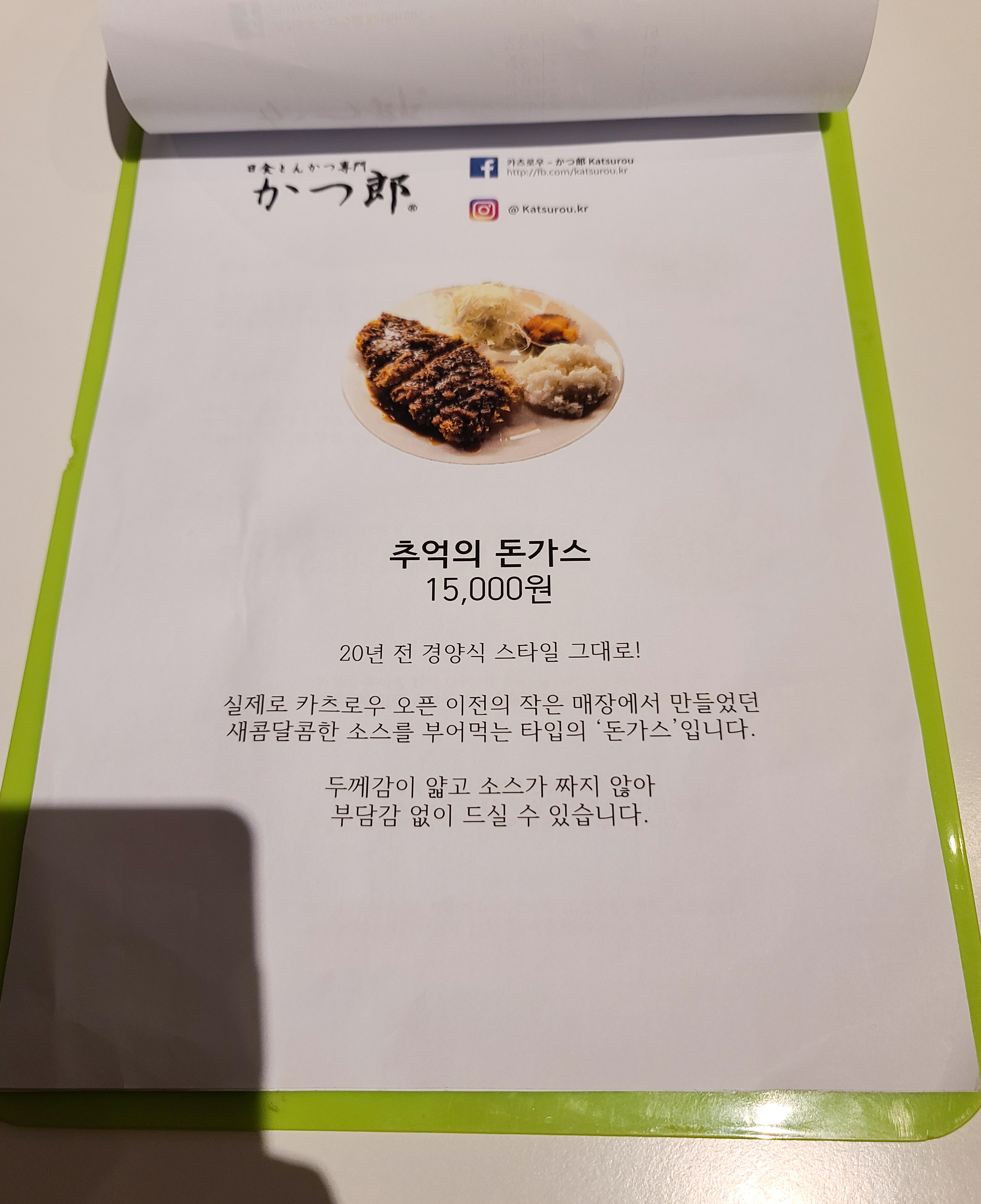 강남구 돈까스 맛집 카츠로우의 메뉴는 등심카츠, 안심카츠, 치킨카츠, 치즈카츠, 생선카츠, 새우카츠, 모듬카츠, 카레추가, 오로시추가, 흑돼지등심카츠, 추억의돈가스, 미소카츠, 카츠카레, 오로시카츠 등이 있었습니다. 저는 가장 기본적인 메뉴인 등심카츠를 즐겨먹기 때문에 카츠로우의 등심카츠를 주문했습니다.