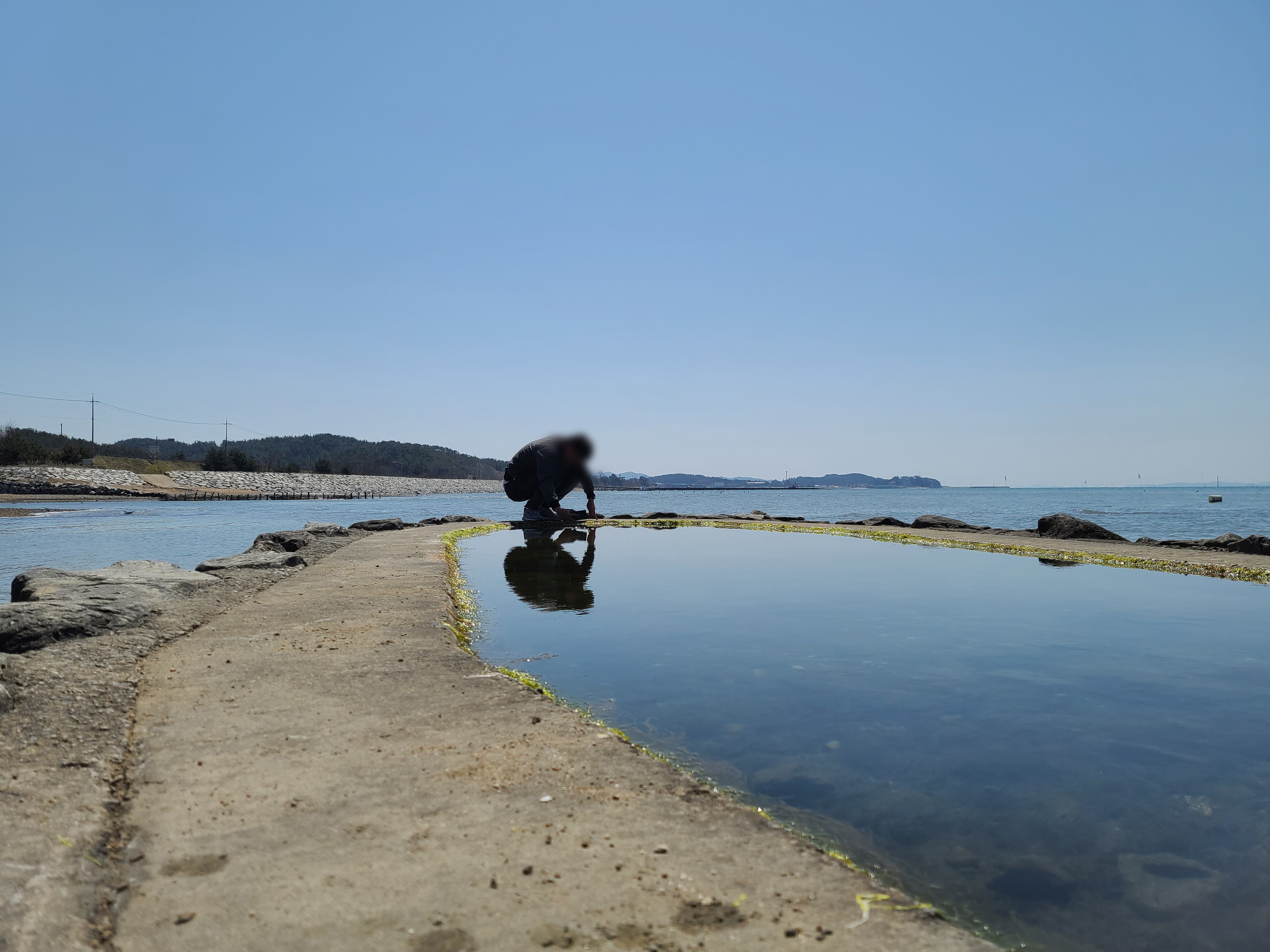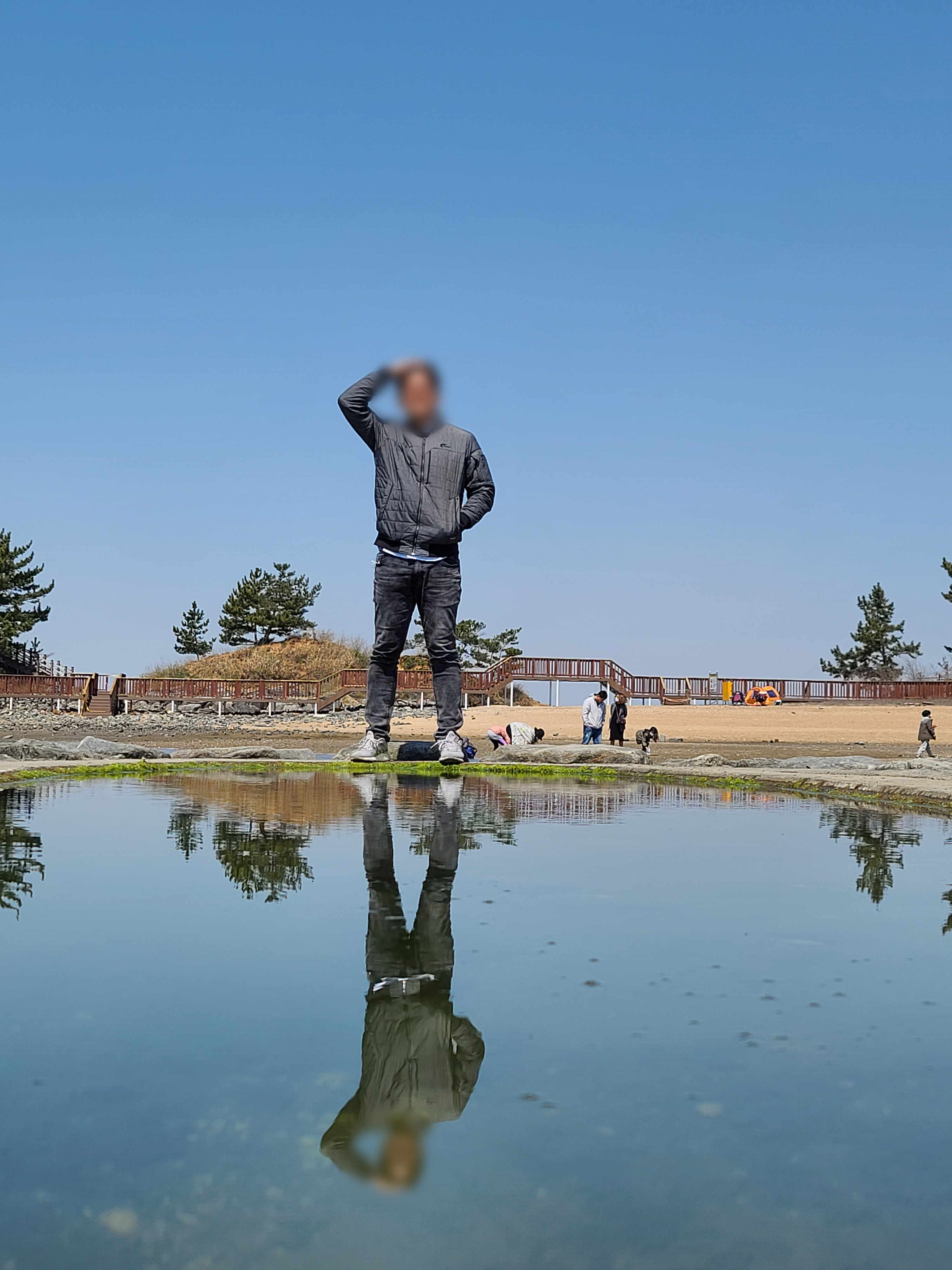 속동 갯벌 체험관에서 보는 풍경은 위와 같습니다. 속동전망대와 앞서 소개해드린 물 웅덩이가 있어서 반영 사진을 찍기에 좋았습니다. 이 날 마침 하늘도 맑아서 반영사진이 더 잘 나왔는데요, 함께 간 지인의 사진도 담아보았습니다.