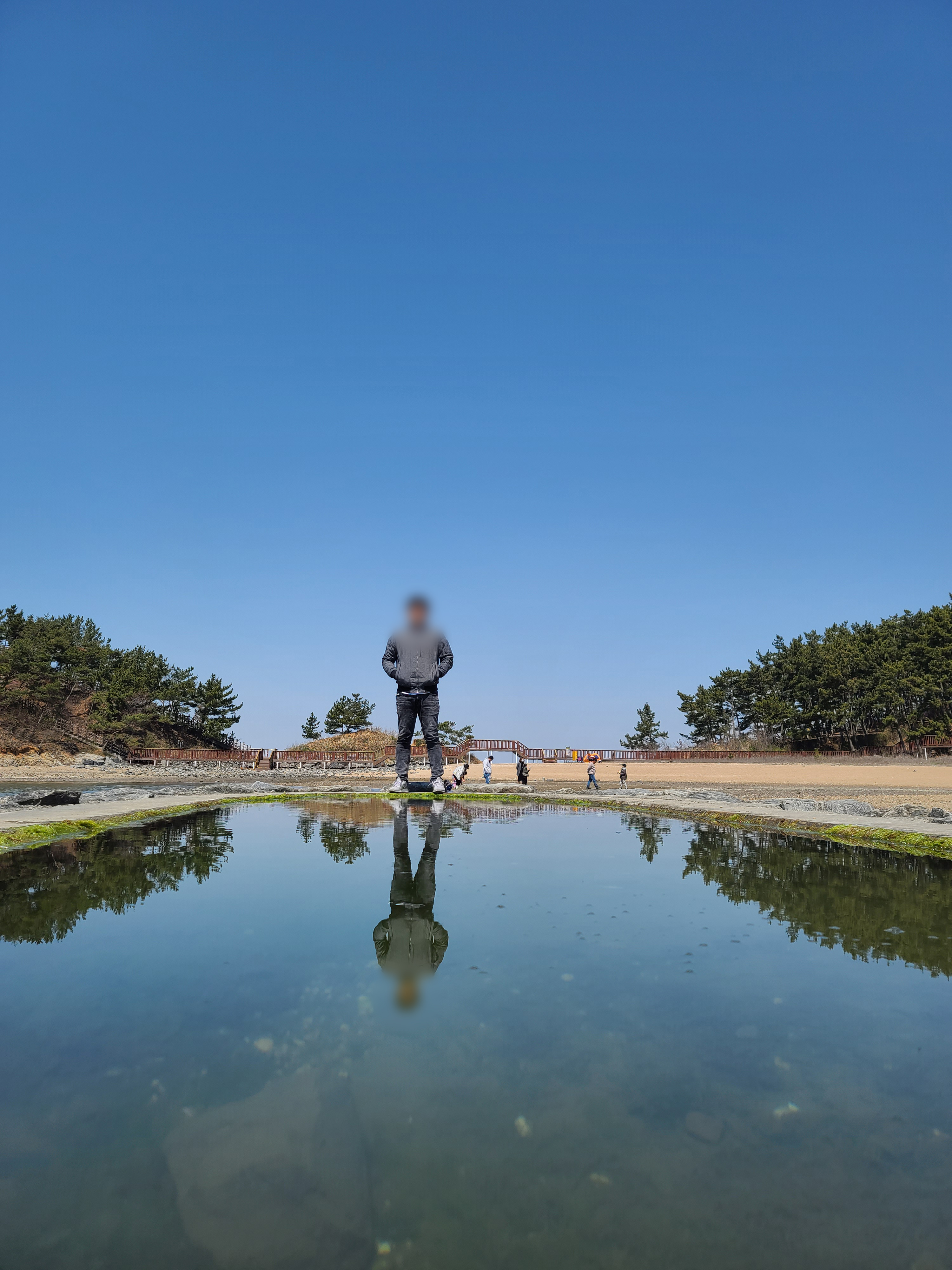 속동 갯벌 체험관에서 보는 풍경은 위와 같습니다. 속동전망대와 앞서 소개해드린 물 웅덩이가 있어서 반영 사진을 찍기에 좋았습니다. 이 날 마침 하늘도 맑아서 반영사진이 더 잘 나왔는데요, 함께 간 지인의 사진도 담아보았습니다.