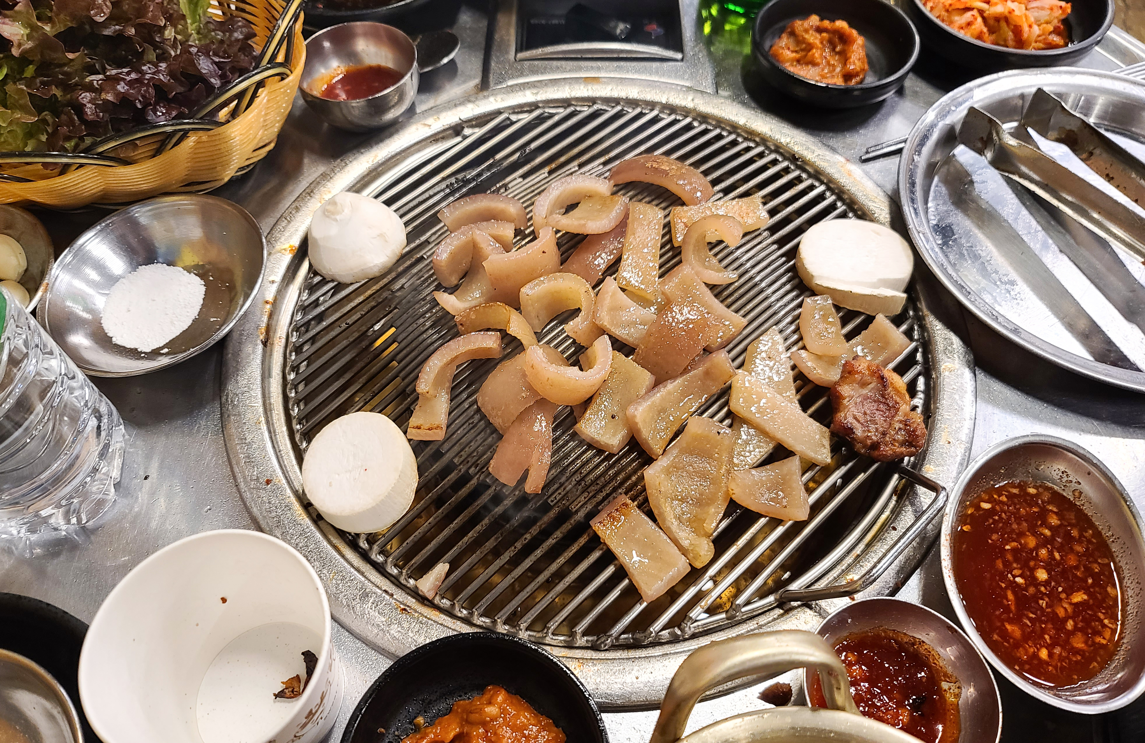 기본 상차림은 파채 절이, 새송이버섯, 마늘, 양념장, 쌈장, 쌈무, 배추김치, 쌈채소 등이 있었습니다. 물론 부족한 반찬은 셀프바에서 직접 가져다 먹을 수 있었습니다. 요즘 채소값이 올랐는데, 파채와 새송이버섯 등 채소들을 원하는 만큼 가져다 먹을 수 있게 한 점은 좋았습니다. 재료들이 신선해서 그런지 아삭아삭 맛있었습니다.