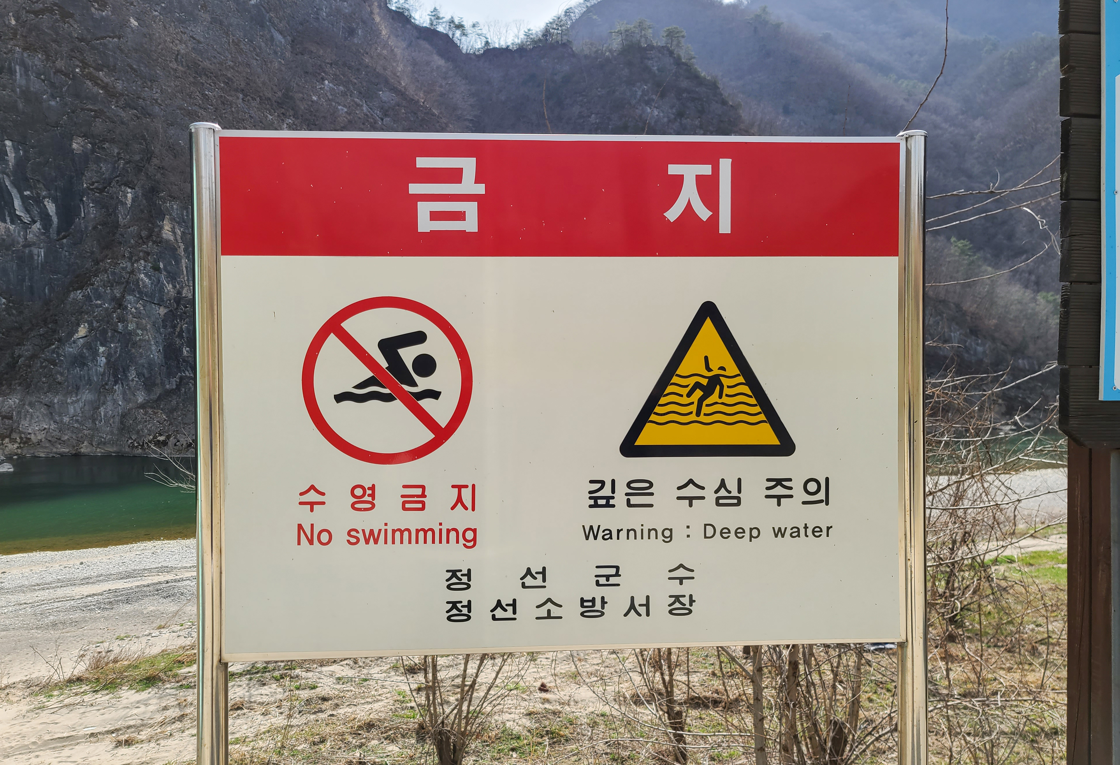 연포분교 앞 동강은 수심이 깊은 곳이 있기 때문에 수영을 금지하고 있었습니다. 그래도 동강과 산의 모습을 멀찌감치 구경하는 풍경도 멋있더라고요. 인근에 둘러볼만한 장소를 찾아보려고 안내판을 살펴보았습니다.