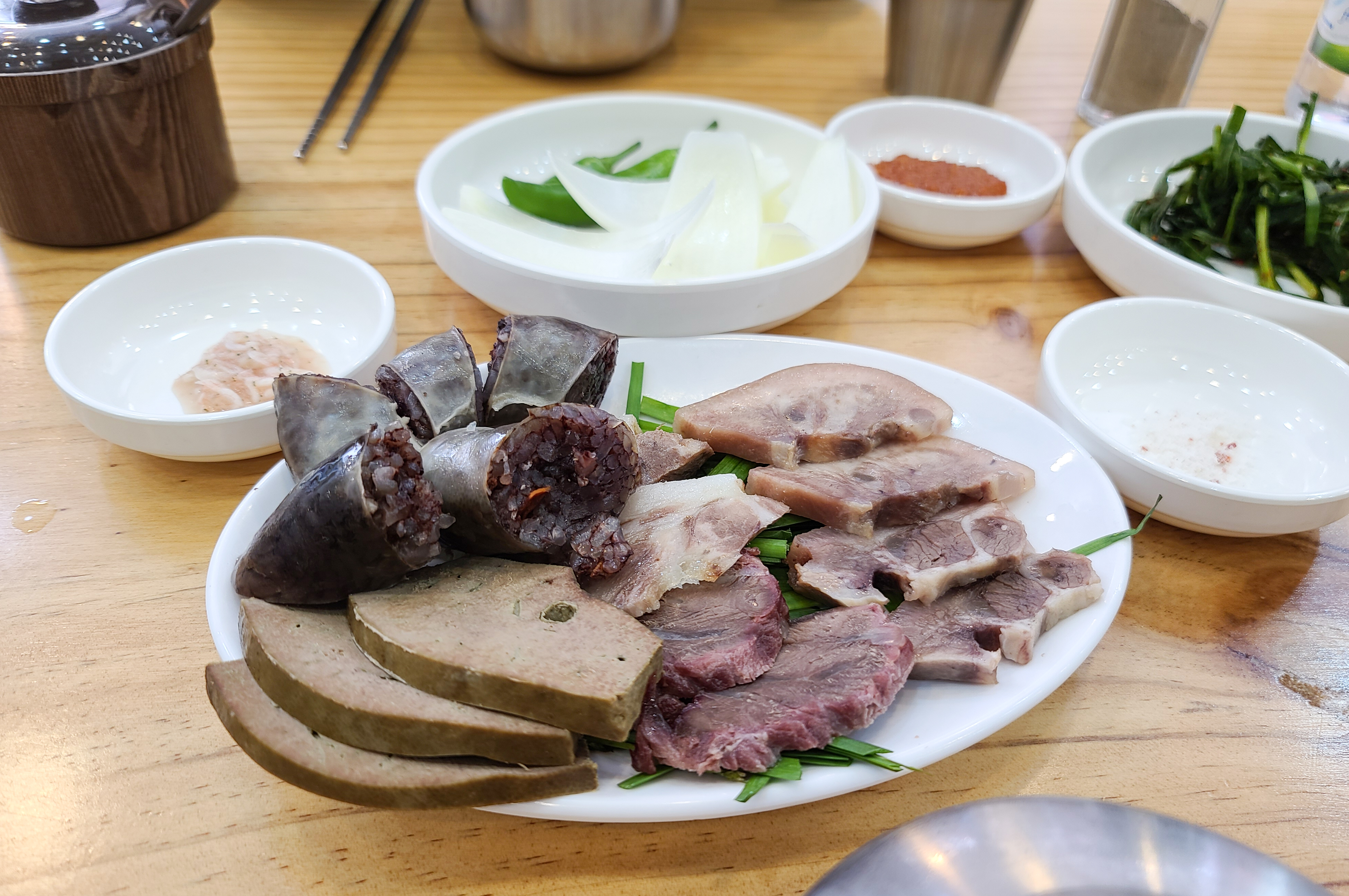 순대국에 기본적으로 나오는 반찬은 양파, 고추, 섞박지, 부추김치 등이 있었고, 순대국정식으로 함께 나온 부속고기가 함께 나왔습니다. 부속고기는 순대와, 간, 등을 비롯한 고기가 나왔는데 나름 잡내도 안나고 맛있더라고요.