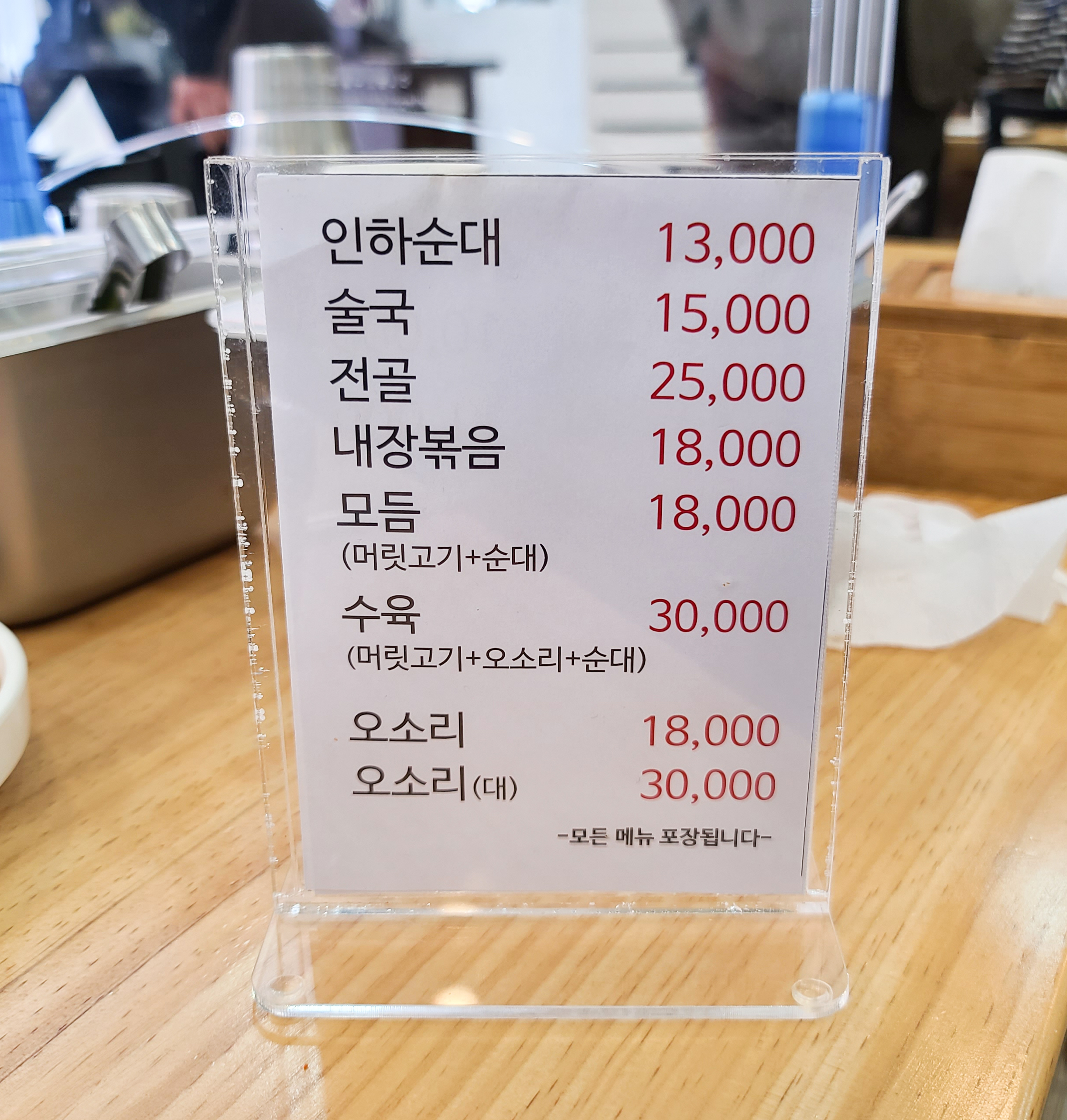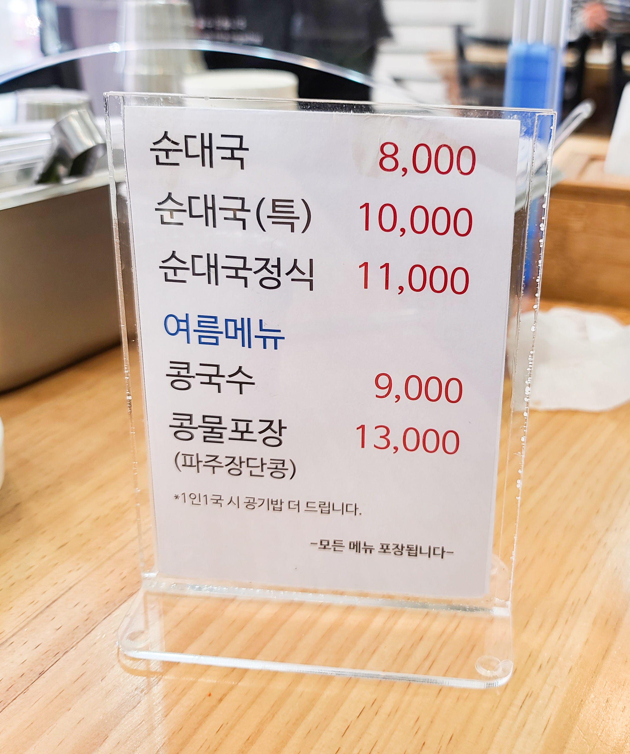 서초동 인하순대국 아들집의 메뉴는 위와 같습니다. 순대국, 순대국정식, 콩국수, 콩물포장, 인하순대, 술국, 전골, 내장볶음, 모듬, 수육, 오소리 등이 있었습니다. 가격은 순대국 기준 8,000원~ 11,000원 사이로 크게 부담스럽지는 않았습니다. 저희는 순대국(특) 메뉴와 순대와 부속고기가 나오는 순대국 정식을 주문했습니다.