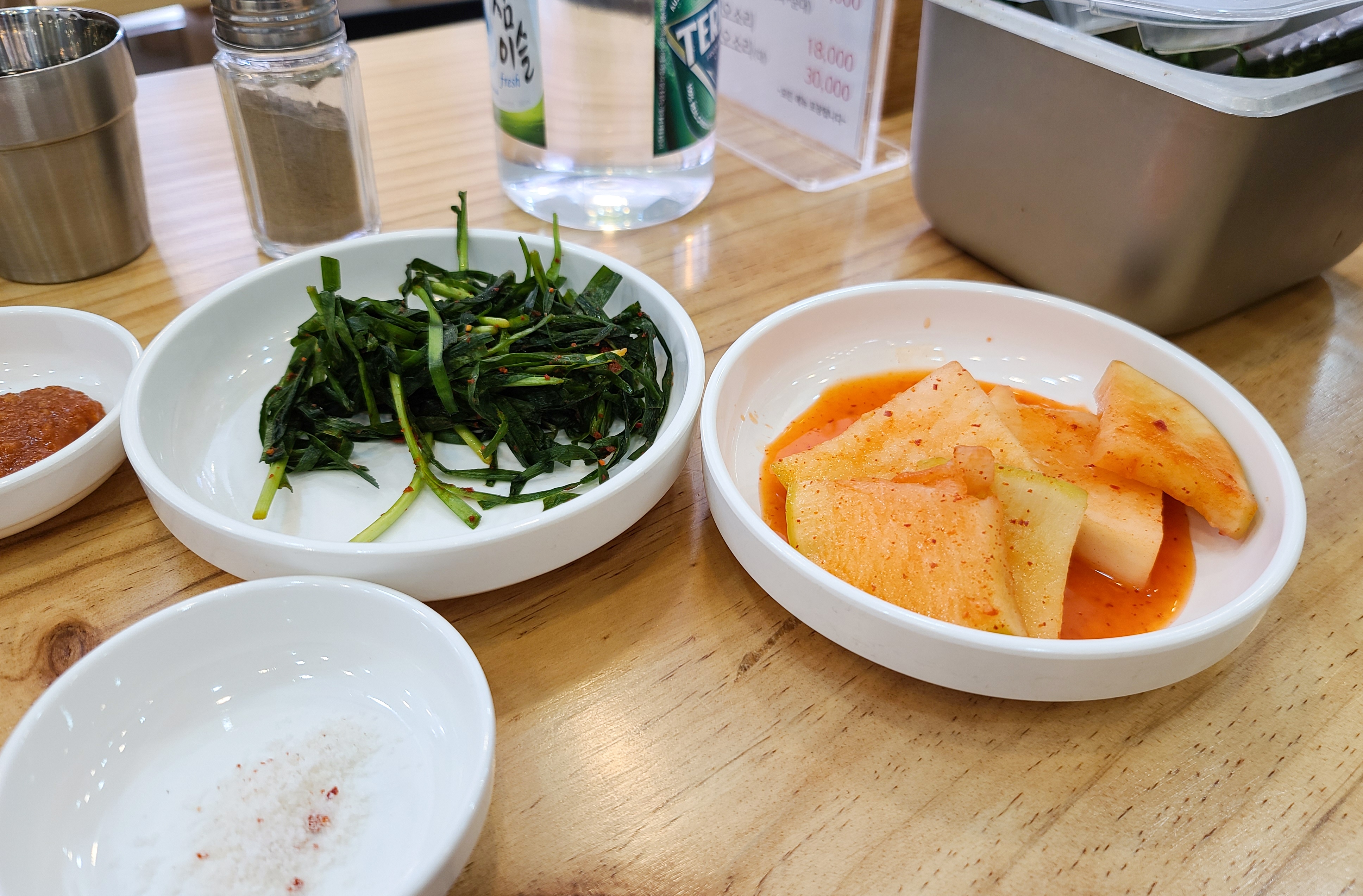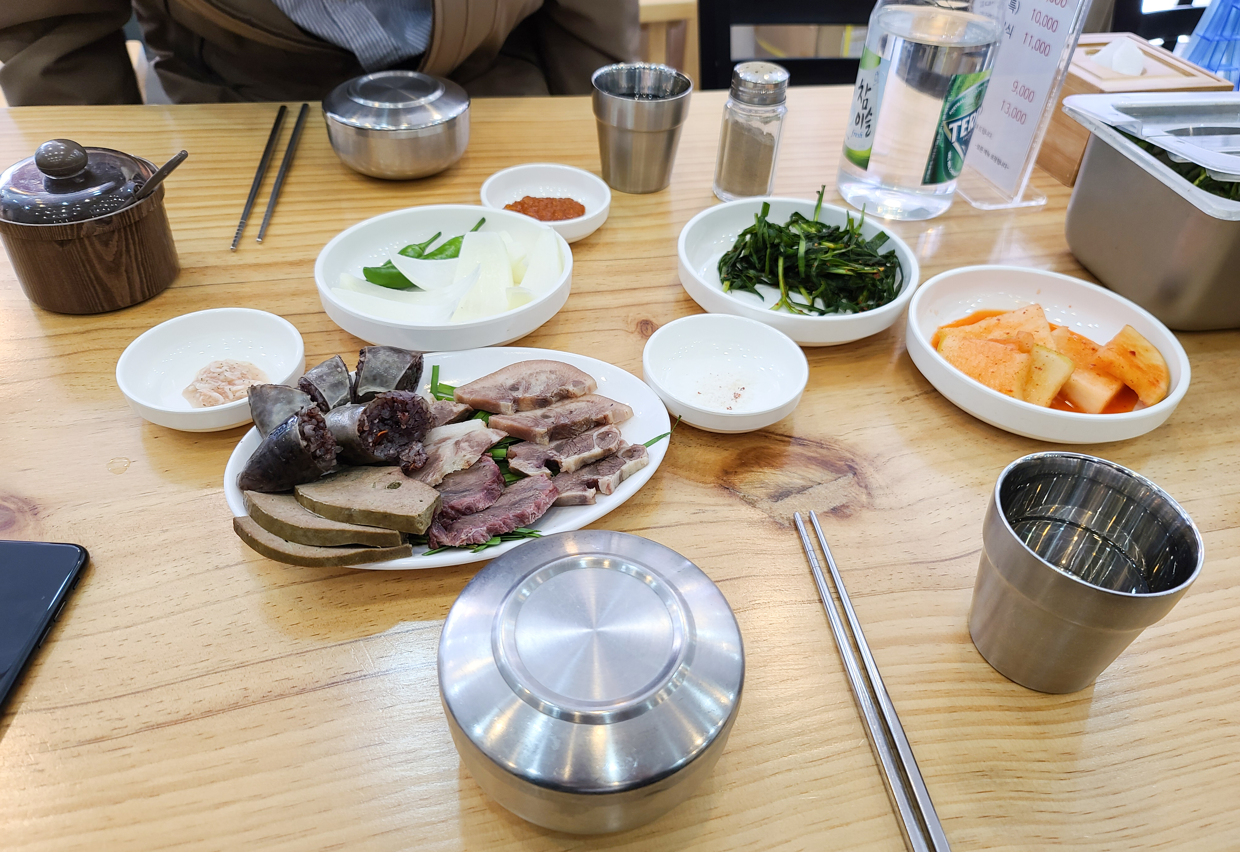 순대국에 기본적으로 나오는 반찬은 양파, 고추, 섞박지, 부추김치 등이 있었고, 순대국정식으로 함께 나온 부속고기가 함께 나왔습니다. 부속고기는 순대와, 간, 등을 비롯한 고기가 나왔는데 나름 잡내도 안나고 맛있더라고요.