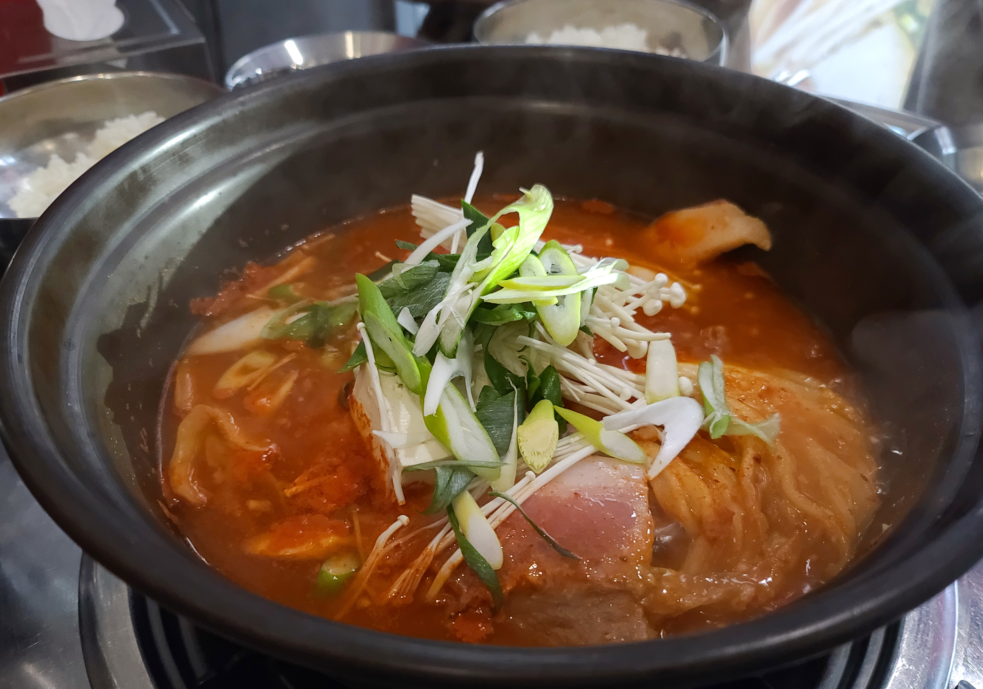 이 곳은 원래 양은냄비에 넉넉하게 김치찌개를 제공해주는 컨셉으로 운영되던 가게였는데, 요즘 양은냄비에 음식을 조리할 경우 코팅이 벗겨진 부분에서 알루미늄이 국물에 용출되어 건강에 해롭다는 것을 인식하고 있기 때문에, 요즘은 코팅이 된 널찍한 냄비를 쓰고 있더라고요.