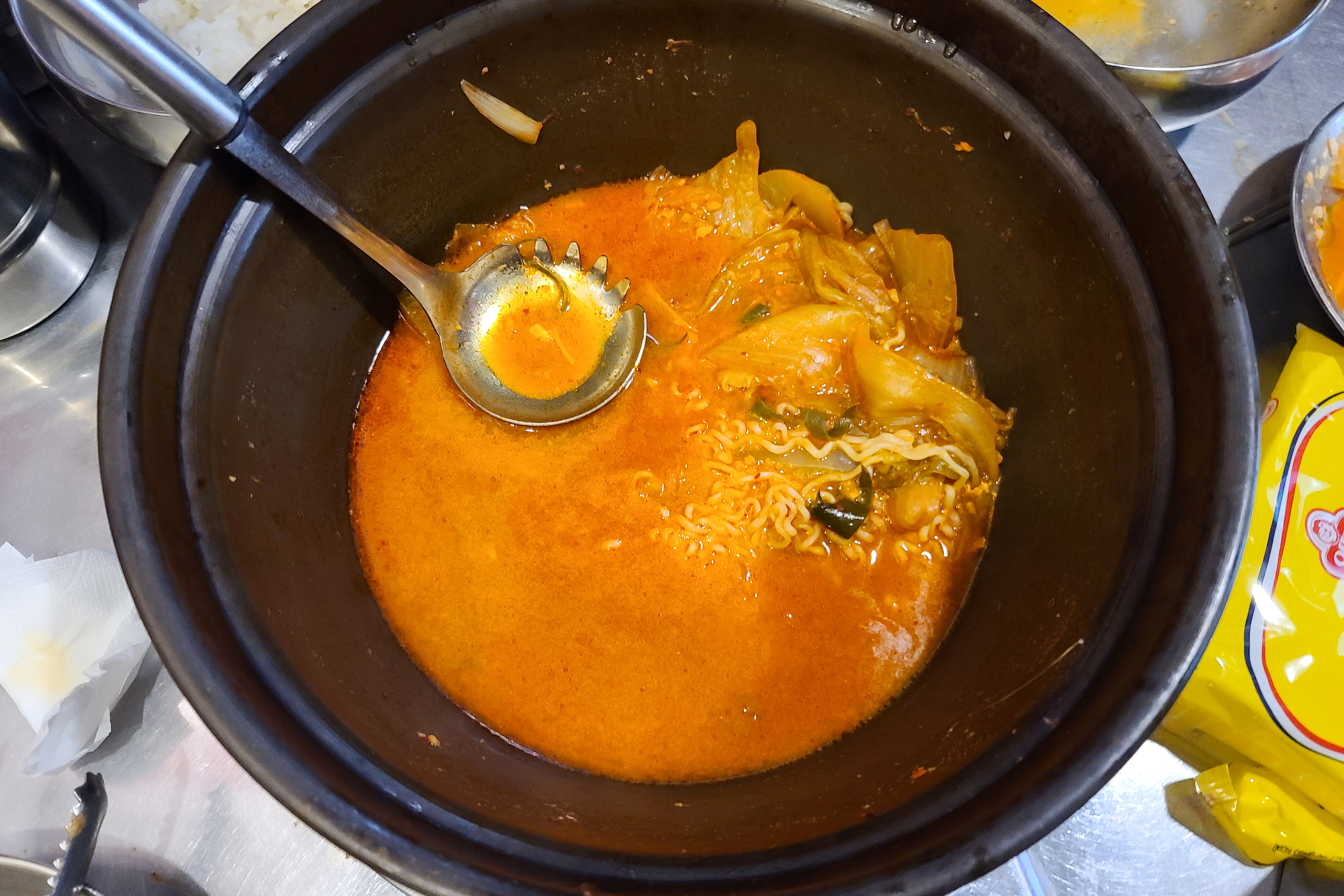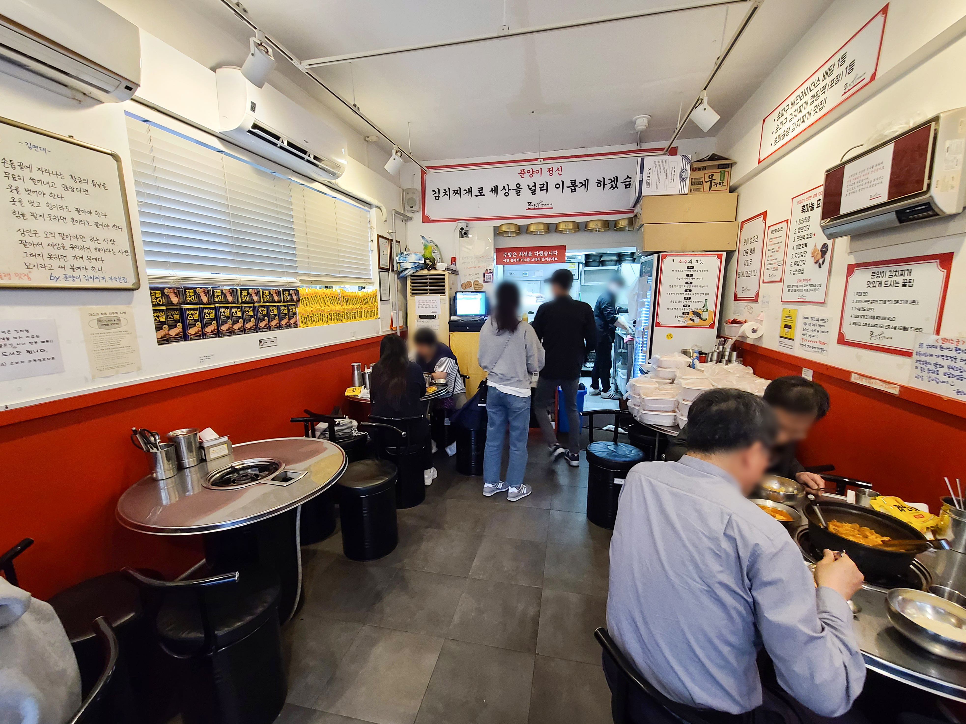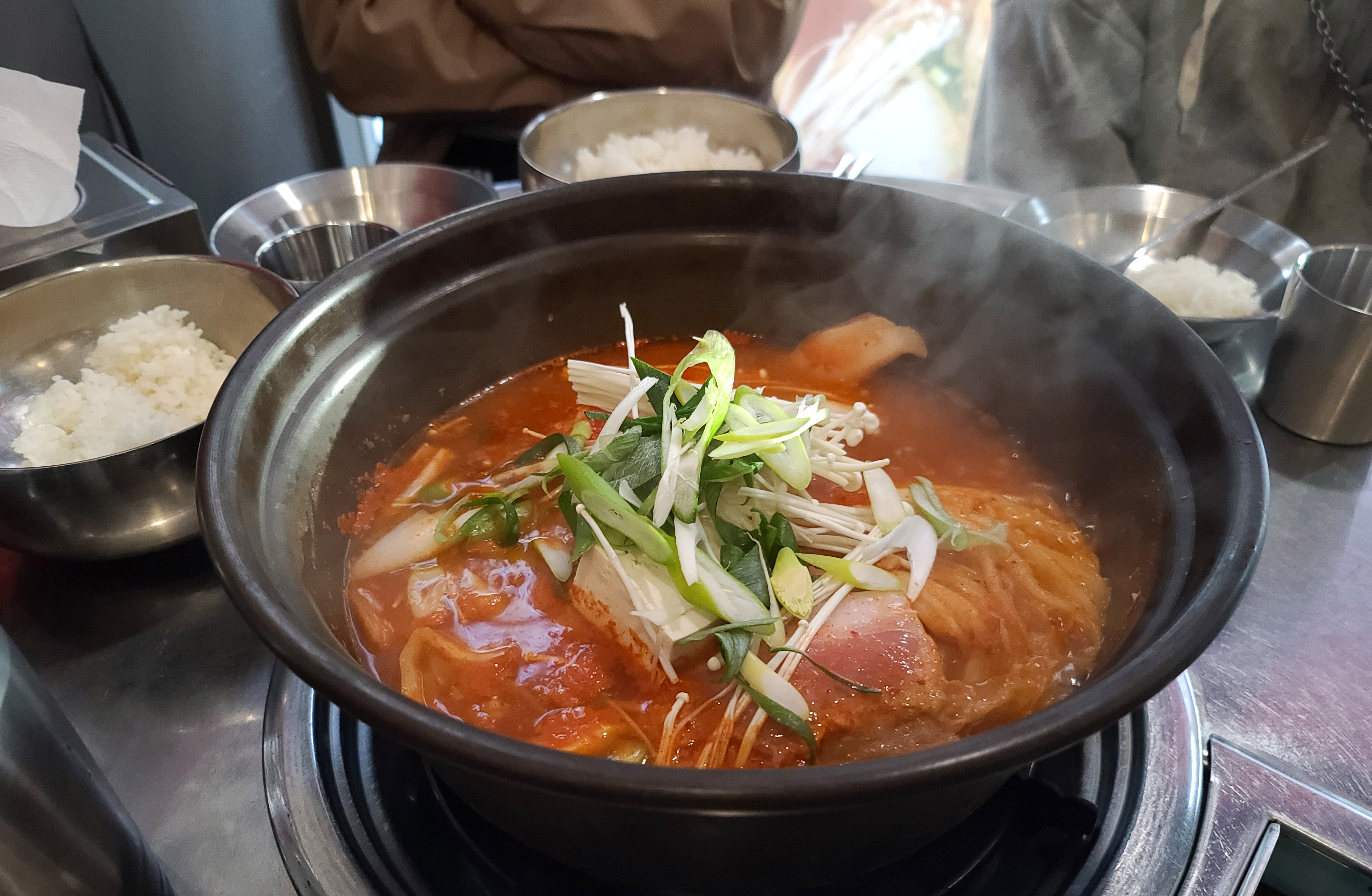 이 곳은 원래 양은냄비에 넉넉하게 김치찌개를 제공해주는 컨셉으로 운영되던 가게였는데, 요즘 양은냄비에 음식을 조리할 경우 코팅이 벗겨진 부분에서 알루미늄이 국물에 용출되어 건강에 해롭다는 것을 인식하고 있기 때문에, 요즘은 코팅이 된 널찍한 냄비를 쓰고 있더라고요.