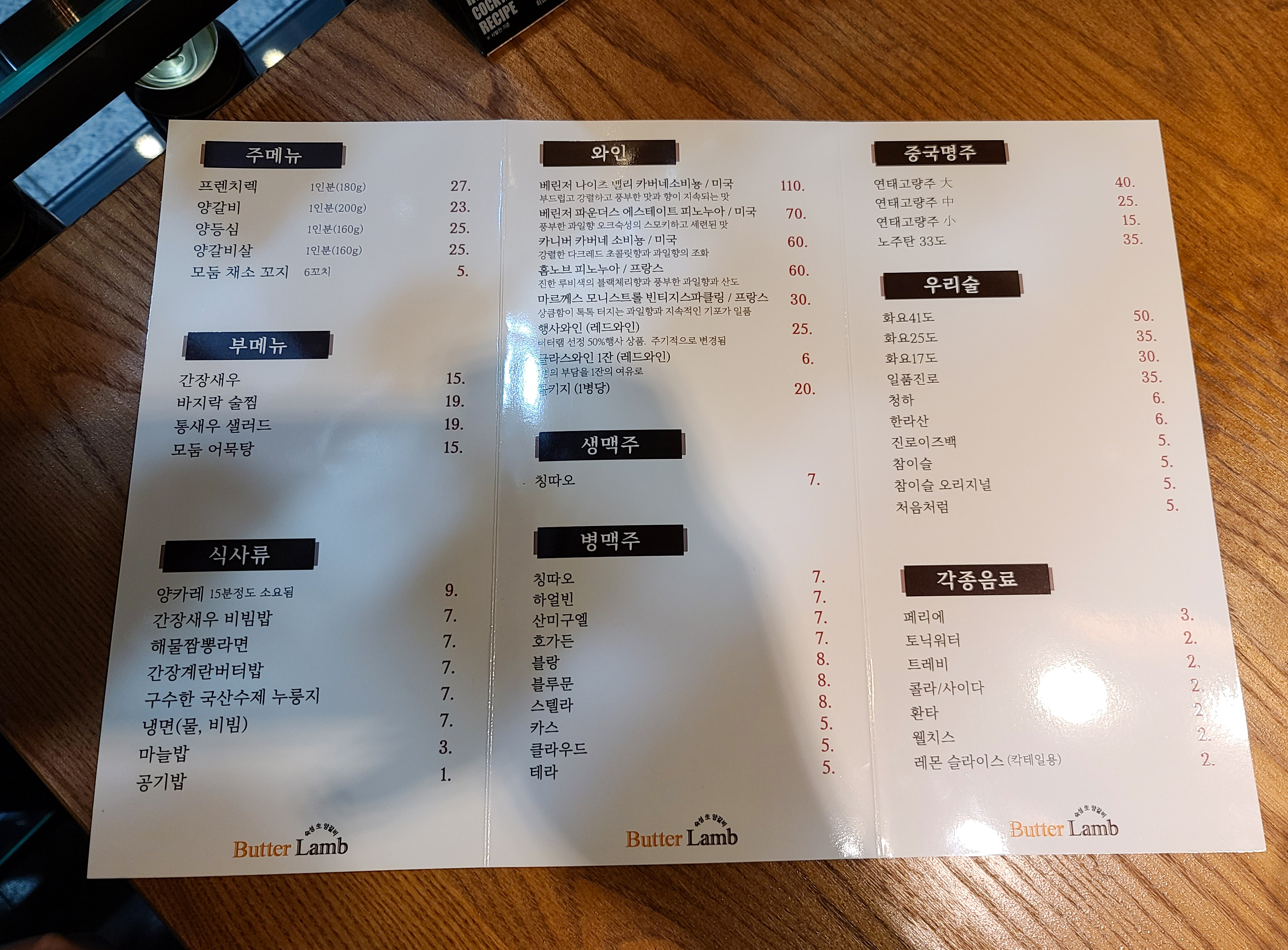 자리에 앉아서 버터램의 메뉴를 살펴보았습니다. 프렌치렉, 양갈비, 양등심, 양갈비살, 모둠채소꼬지, 간장새우, 바지락술찜, 통새우샐러드, 모둠어묵탕, 양카레, 간장새우비빔밥, 해물짬뽕라면, 간장계란버터밥, 구수한국산수제누룽지, 냉면, 마늘밥, 공기밥 등 이 있었습니다.