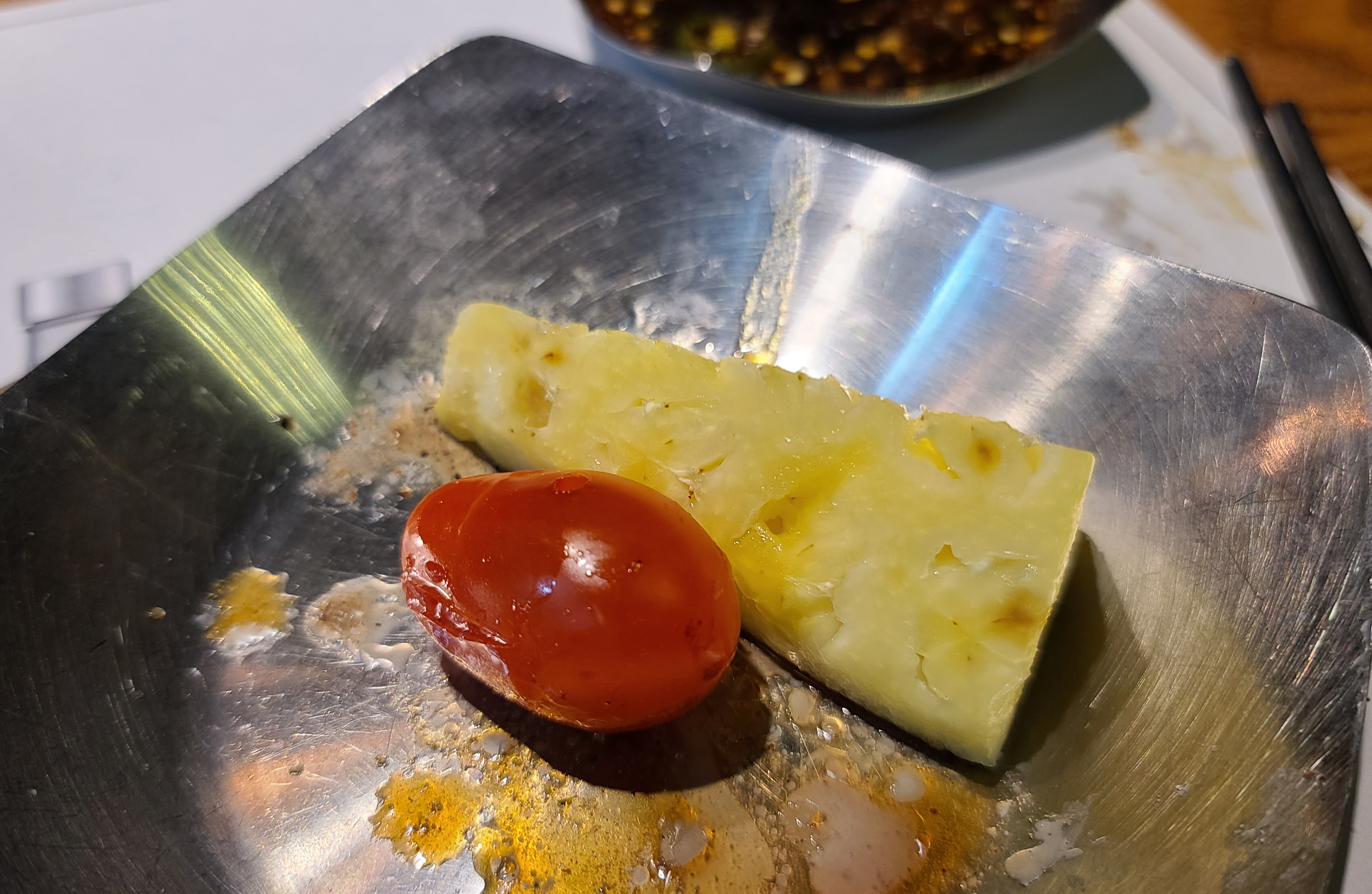 화로 위에 프렌치렉과 양갈비, 방울토마토, 가지, 떡, 파인애플 등을 올리고 익히기 시작했습니다. 고기는 굽는 사람의 스킬이 중요한데, 고기 굽는 전문가인 직원분께서 직접 알맞게 구워주셔서 잘 익은 고기를 편하게 먹을 수 있었습니다.