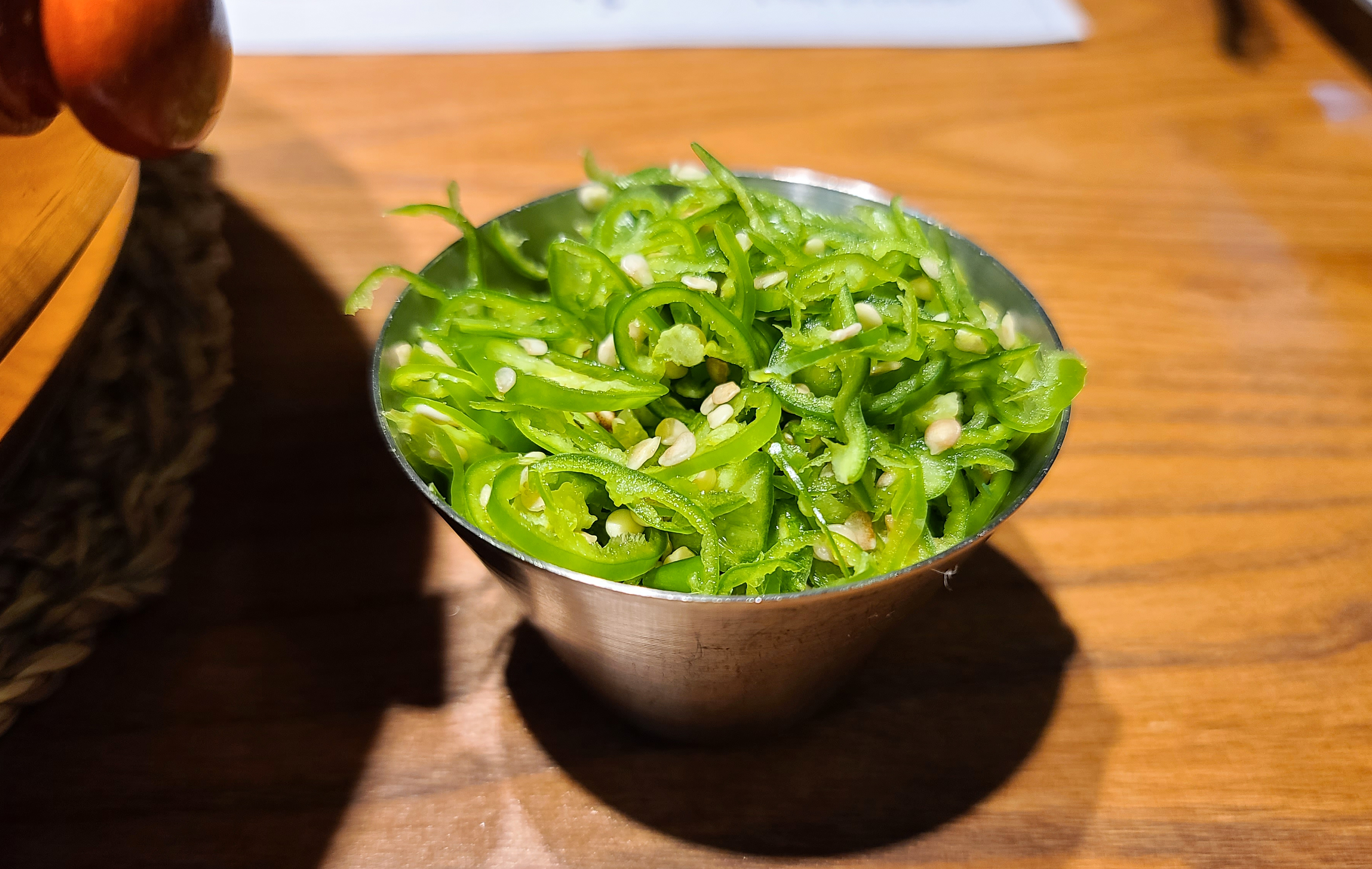 먼저 양갈비 프렌치렉 부터 먹어보았습니다. 간장소스에 담근 고추를 조금 집어서 양갈비 위에 얹고, 프렌치렉을 먹었는데 양고기라고 하면 "특유의 비린내" 가 있지 않을까 하는 의심이 있었는데, 그런 거 없이 오히려 소고기와 비슷하거나 소고기보다 덜 느끼하고 맛있더라고요.