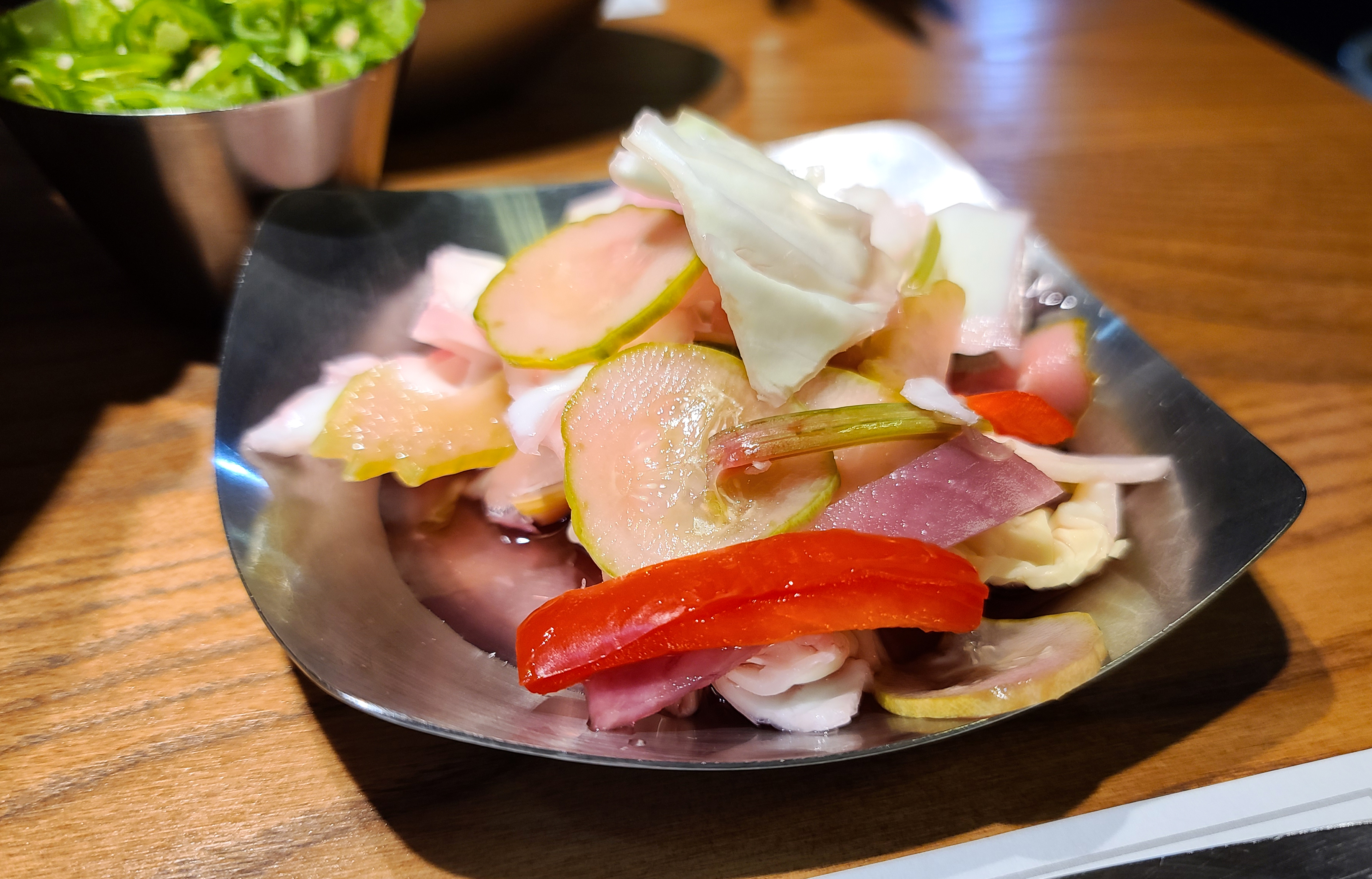 버터램의 기본 반찬은 위와 같습니다. 청양고추채, 간장소스, 피클, 상추 샐러드 등이 나왔습니다. 전체적으로 양고기와 잘 어울리는 반찬들이었고, 간장소스에 채 썬 청양고추를 곁들이니 알싸한 맛이 더해져 더 좋았습니다.