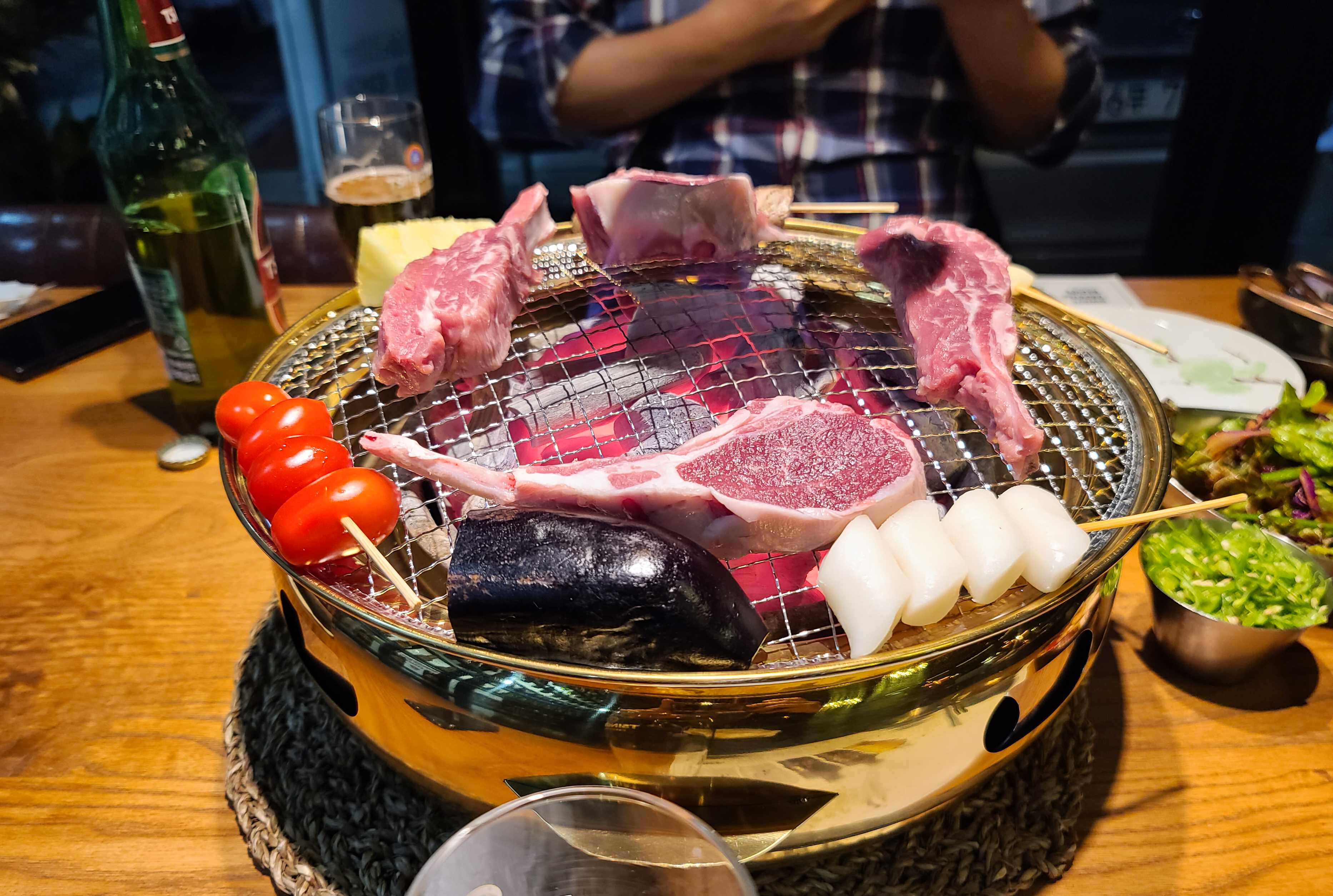 고기를 구울 화로와 불이 나왔고, 양갈비와 같이 구울 채소와 떡, 버섯이 준비되었습니다. 직접 구워도 되지만 직원분께 물어보니 직원이 구워주기도 하시는 것 같더라고요. 저희는 직원분에게 구워주실 것을 부탁드렸습니다. 아무래도 블로그를 하다 보니 고기 구워가면서 사진을 찍는 게 여간 번거로운 일이 아니어서,,,(ㅠㅠ)