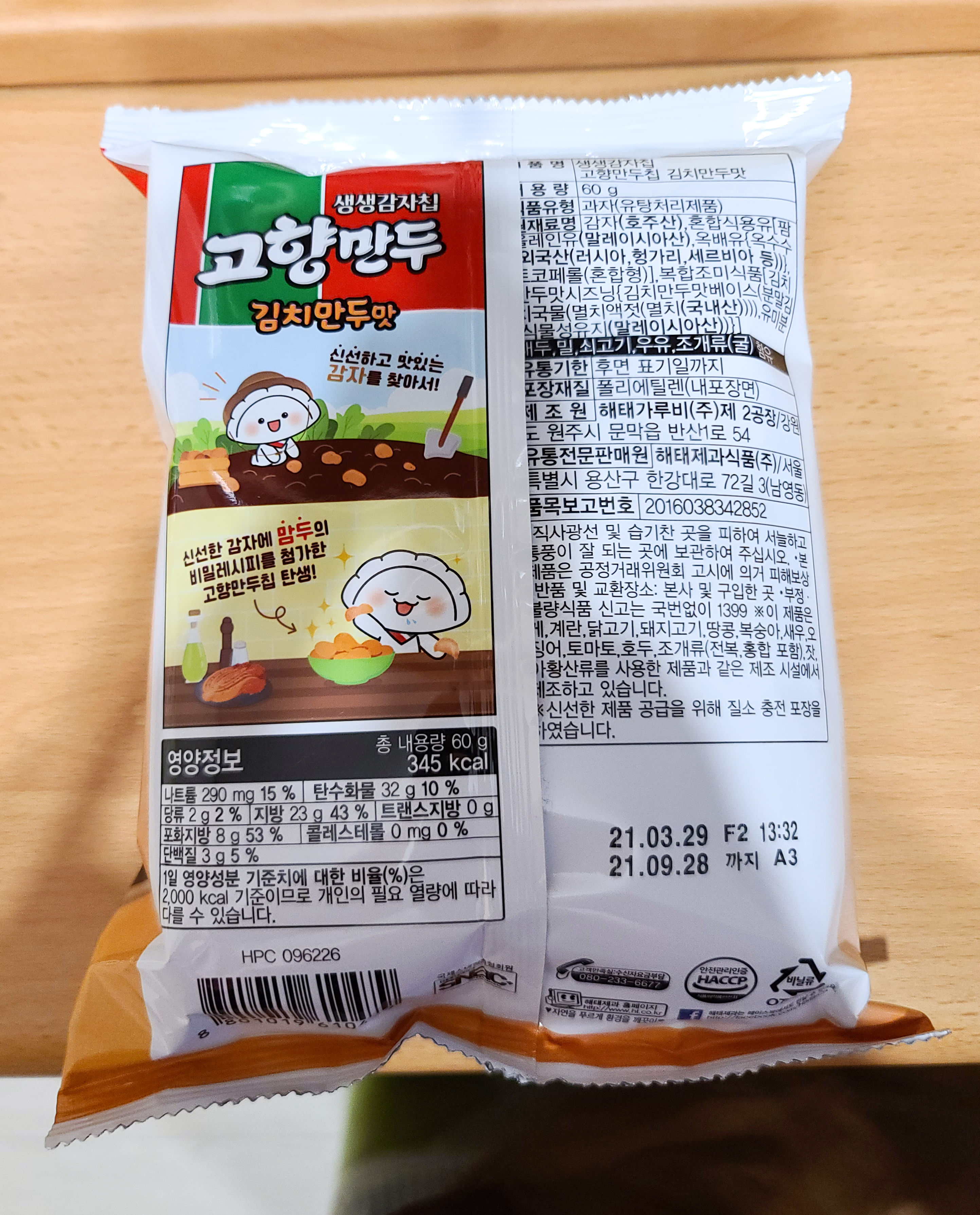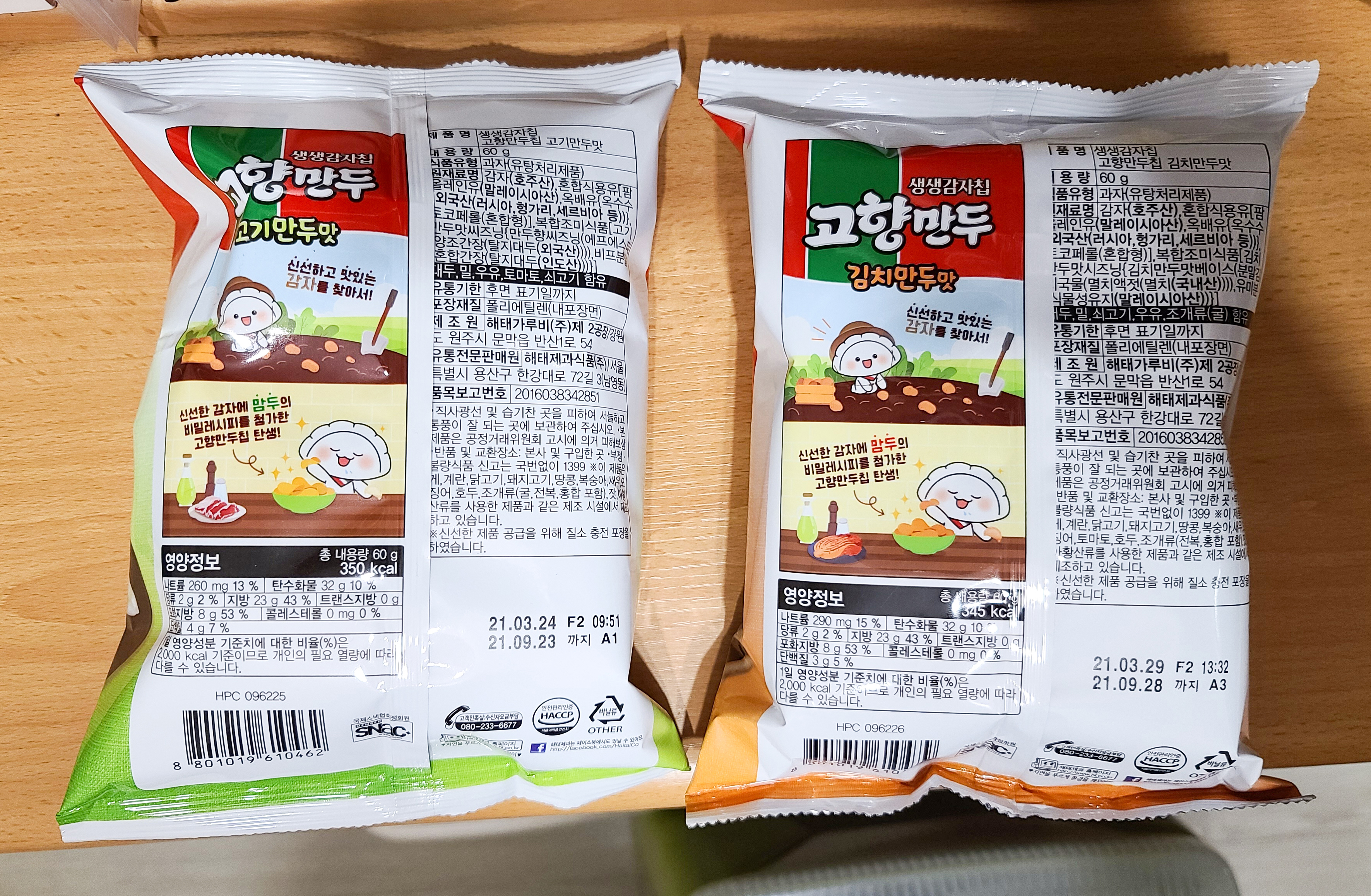 고향만두칩 제품의 뒷면의 모습은 위와 같습니다. 영양정보와 원재료명, 유통기한, 포장재질 등이 표기되어 있었고, 두 제품의 열량은 고기만두, 김치만두 각 350 kcal, 345 kcal 로 큰 차이는 없었습니다.
