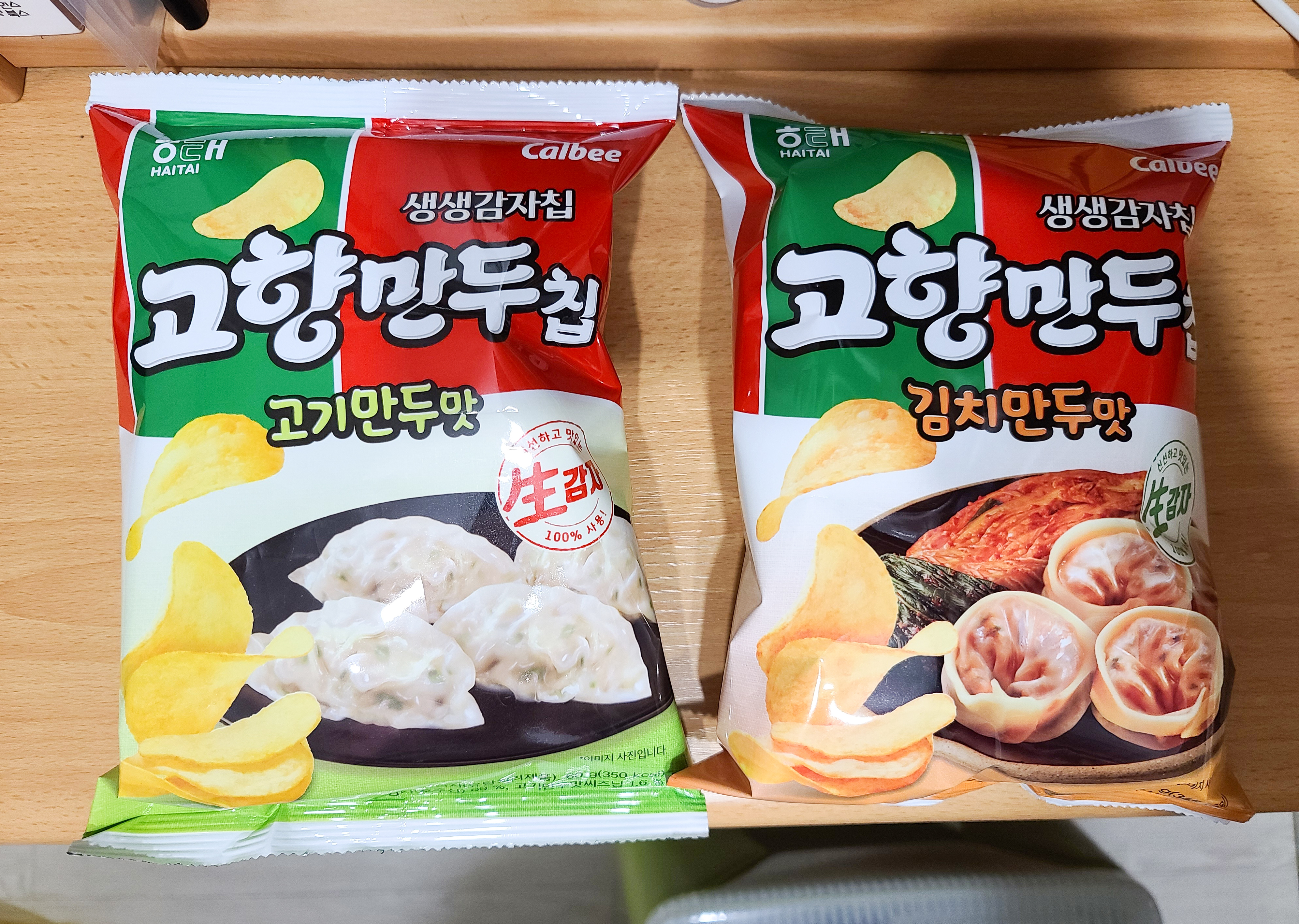 해태 <고향만두칩>은 고향만두의 포장을 떠올리게 하는 패키지와 "만두맛 감자칩은 과연 어떤 맛일까?" 하는 재미있는 아이디어 때문에 호기심에 구입을 이끄는 상품인 것 같습니다. 가격은 개당 1,500원 이었으며, 고기만두맛과 김치만두맛 두 가지 제품을 판매하고 있었습니다.