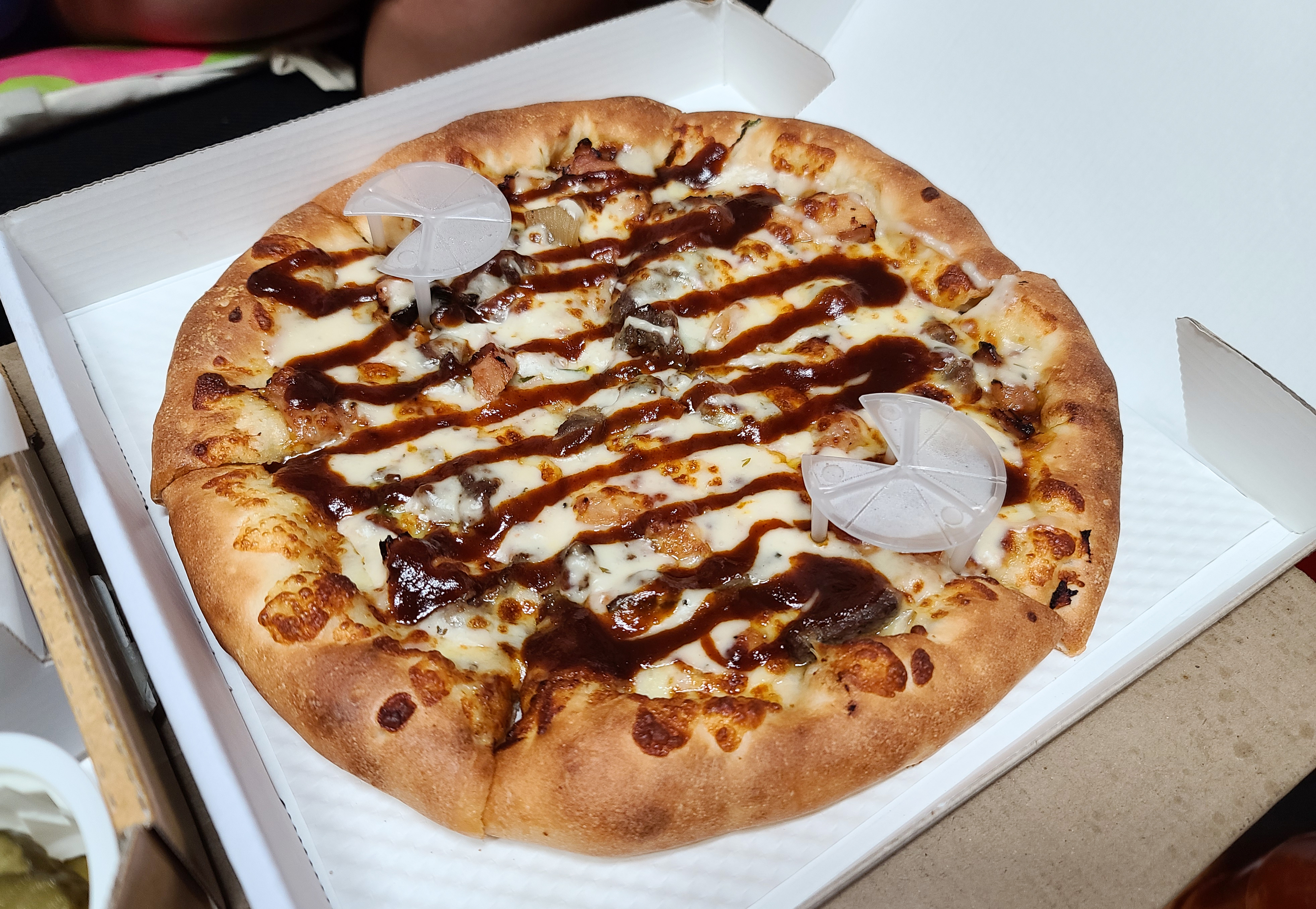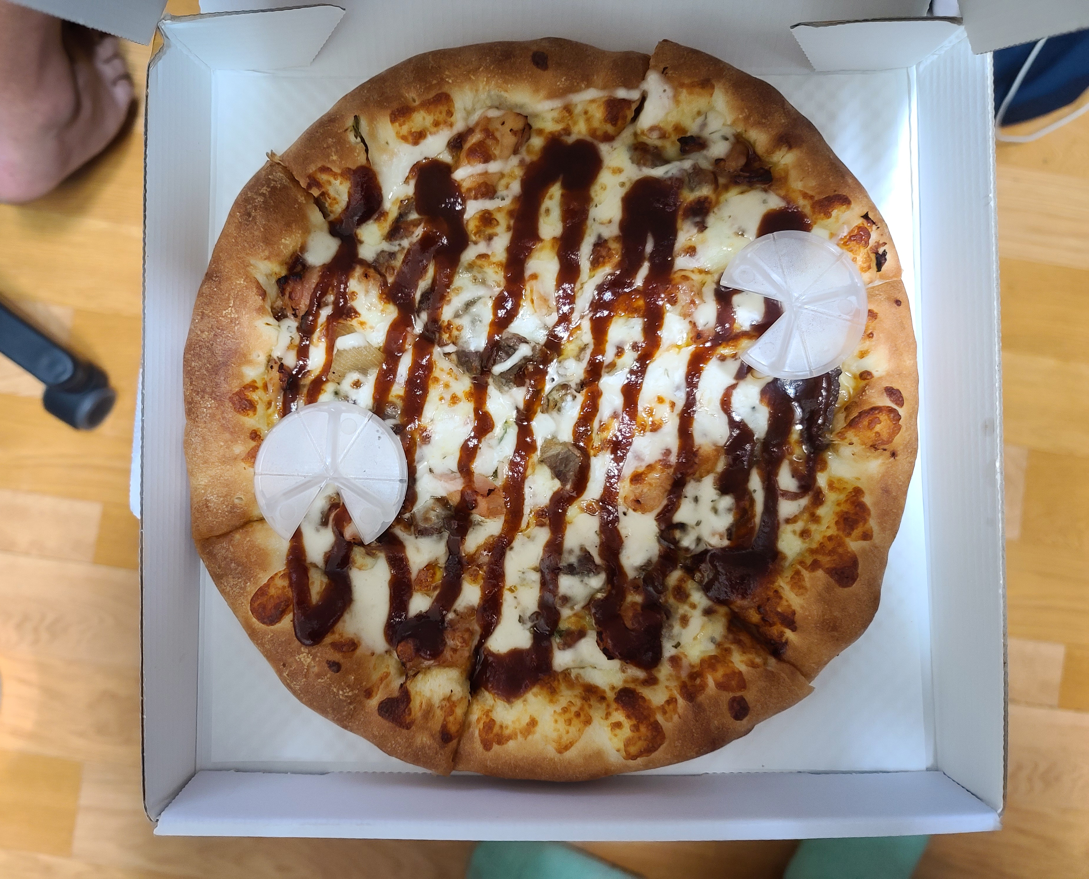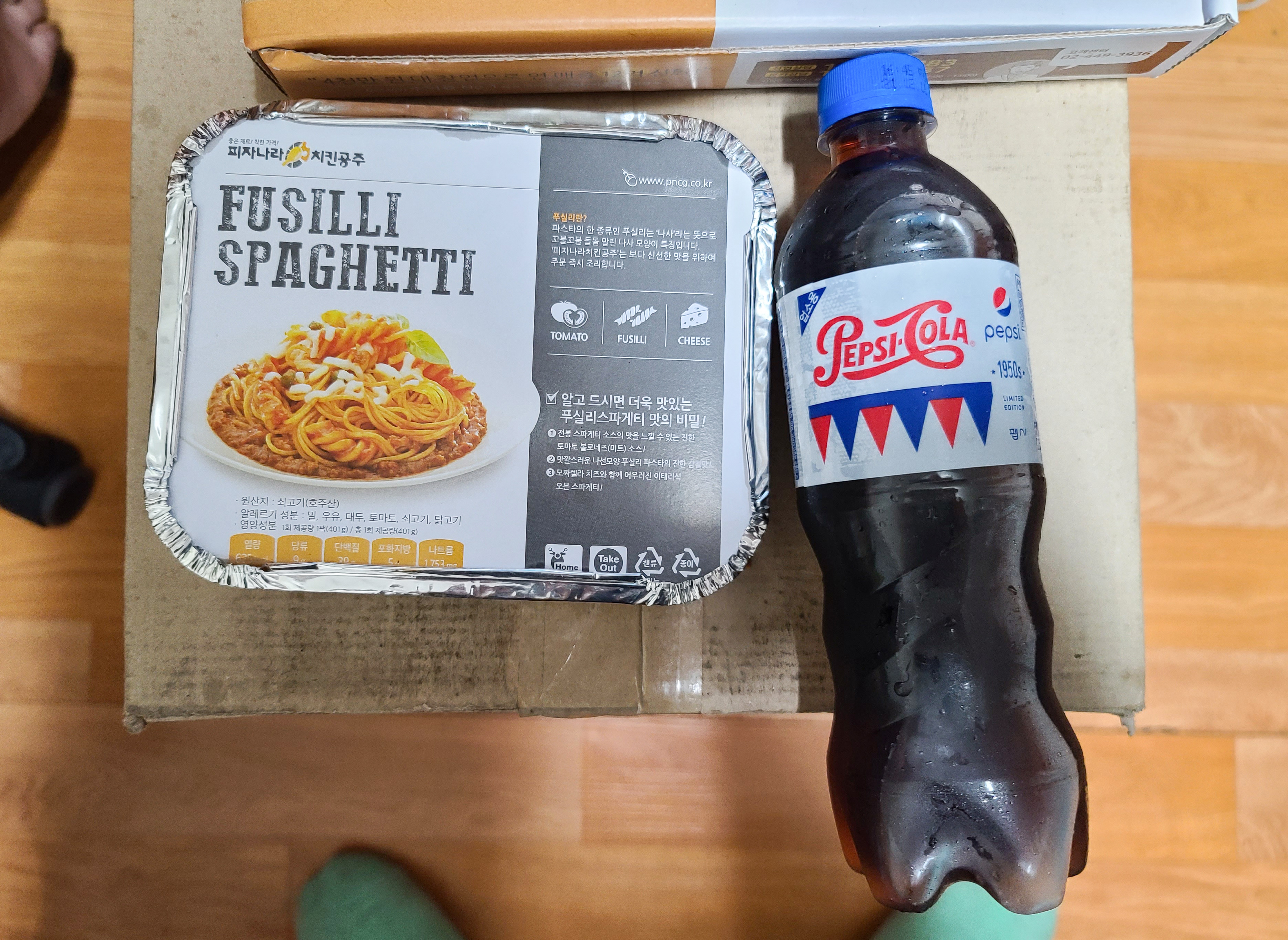 주문한 메뉴는 피자나라치킨공주 트리플바비큐 피치세트와 푸실리 스파게티 입니다. 우선 피자와 소스류 부터 사진을 찍어보았습니다. 트리플바비큐 피자는 매콤한 바비큐 소스와 비프스트립, 바비큐치킨, 베이컨이 들어가 고기의 씹는 식감과 숯불 특유의 향을 잘 살린 피자였습니다. 피자나라 치킨공주 배달에는 기본적으로 콜라가 제공되며, 허니머스타드, 핫소스, 소금, 치킨무, 피클이 함께 제공되었습니다.