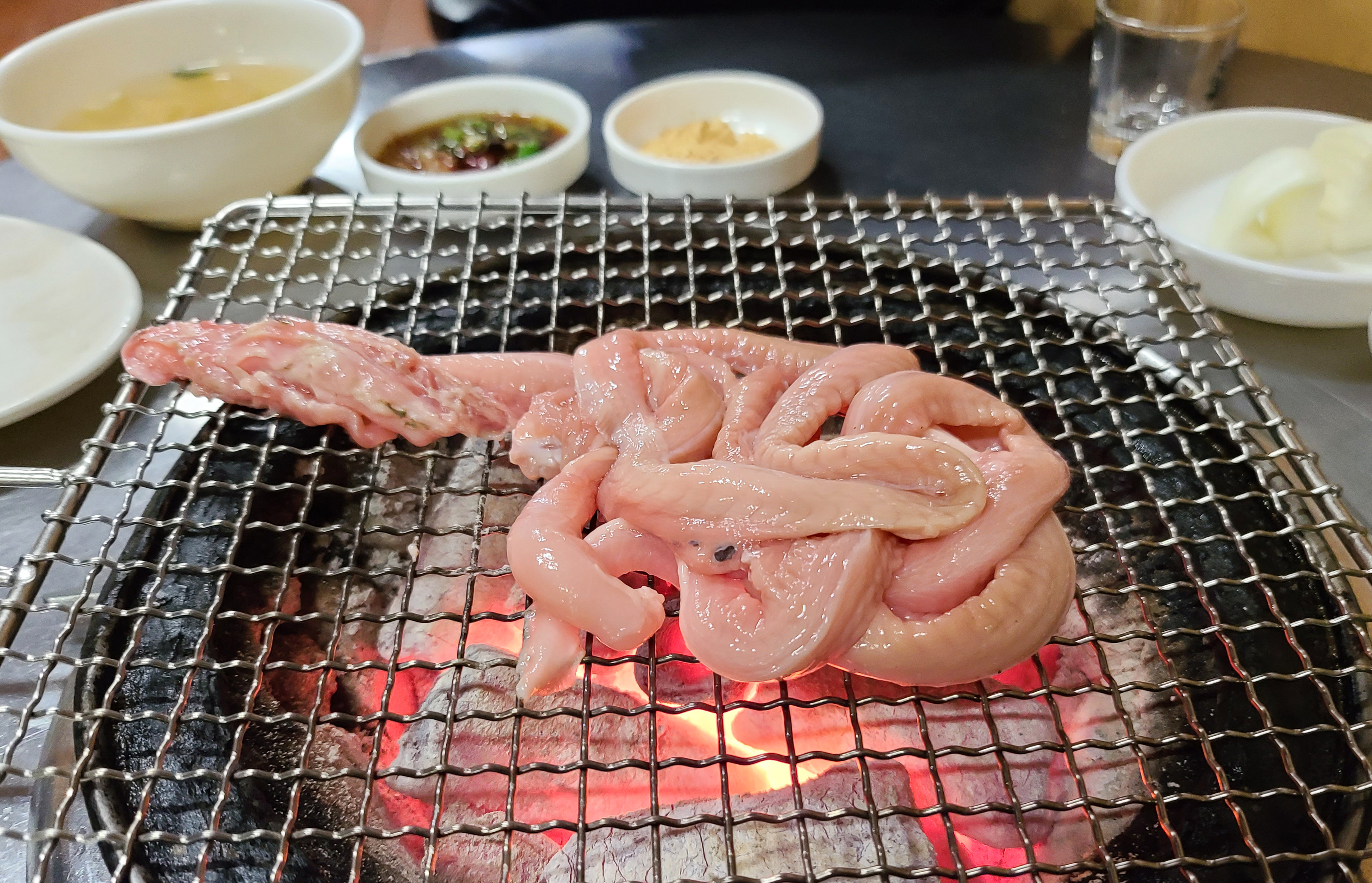 돼지뽈살구이전문의 꼼장어와 껍데기, 돼지뽈살이 나왔고, 순서는 아무렇게나 구워도 되는데 저희는 우선 꼼장어부터 먹기로 했습니다. 꼼장어는 살아있는 건 아니었고, 손질이 되어 나왔는데 예전에 살아있는 꼼장어구이는 좀 징그러웠는데, 이 건 그래도 덜 징그럽더라고요. 맛은 오징어랑 비슷한 맛인데 식감은 좀 더 꼬들꼬들했습니다.