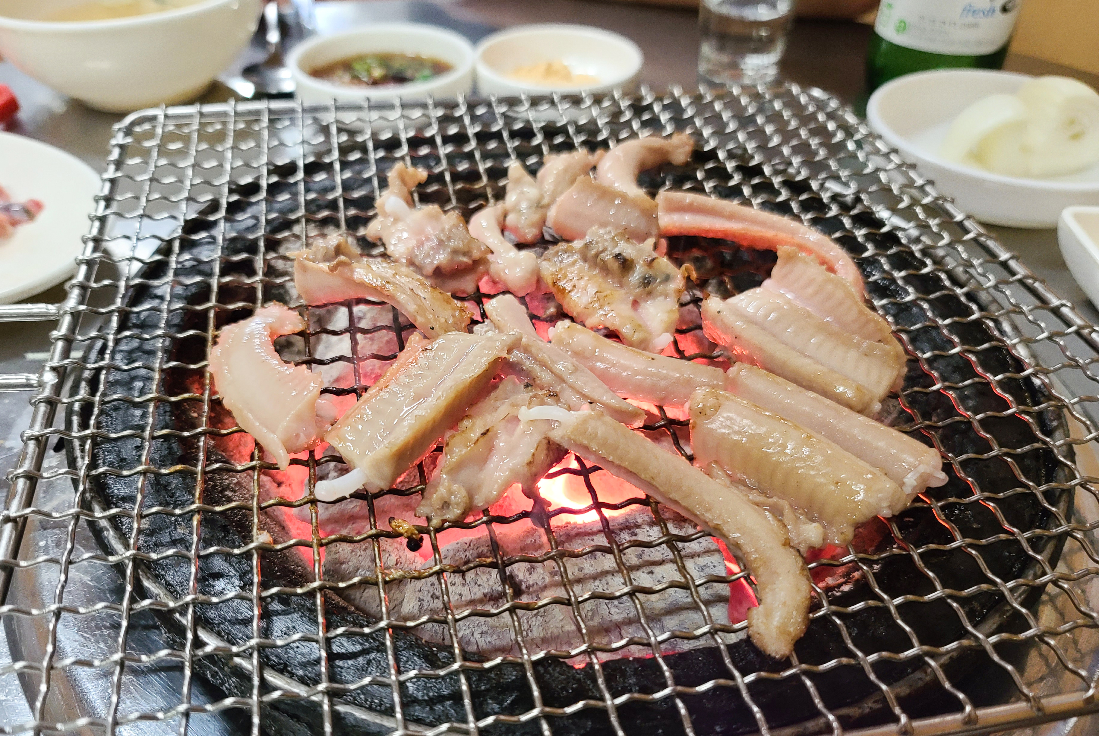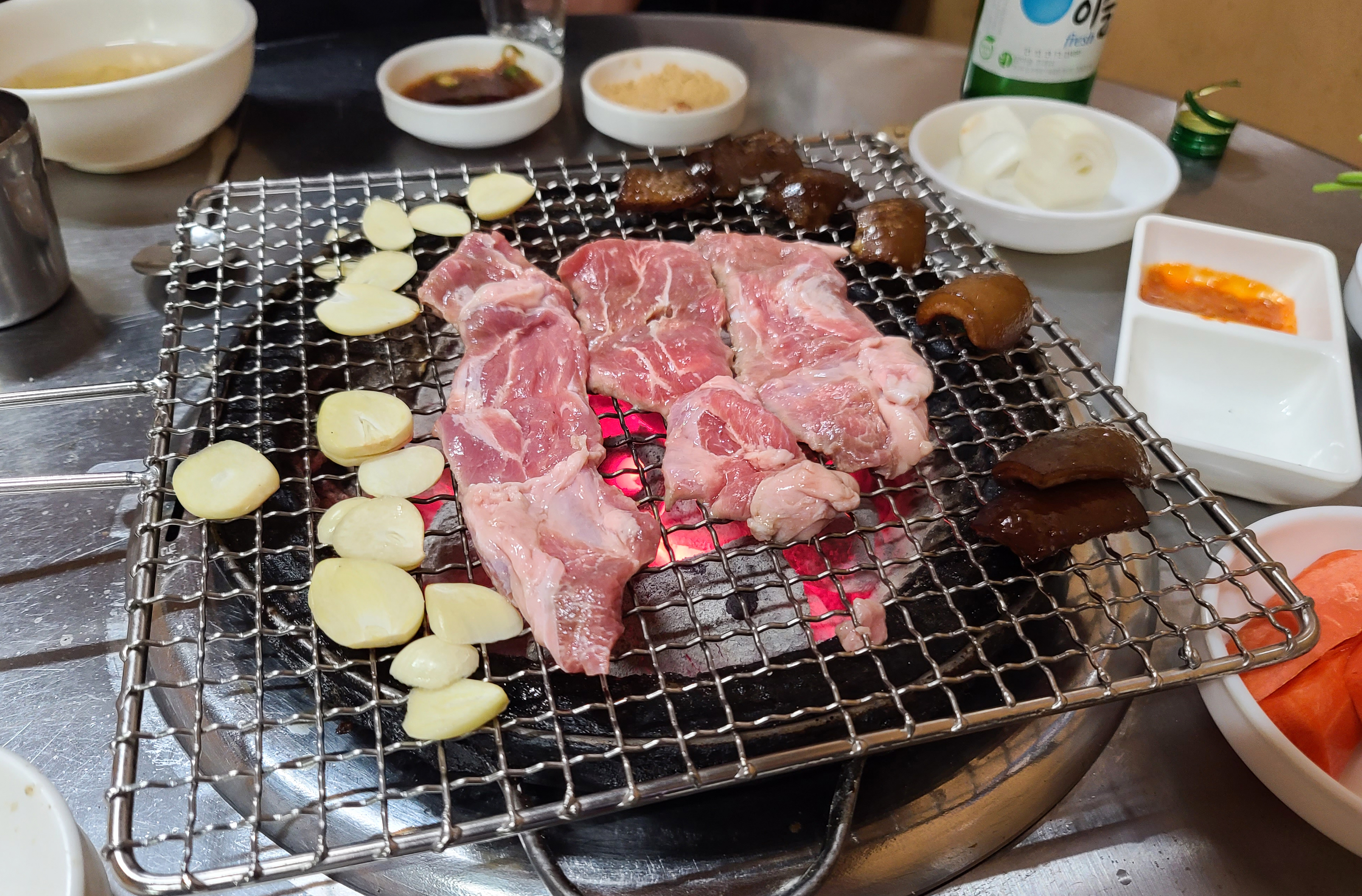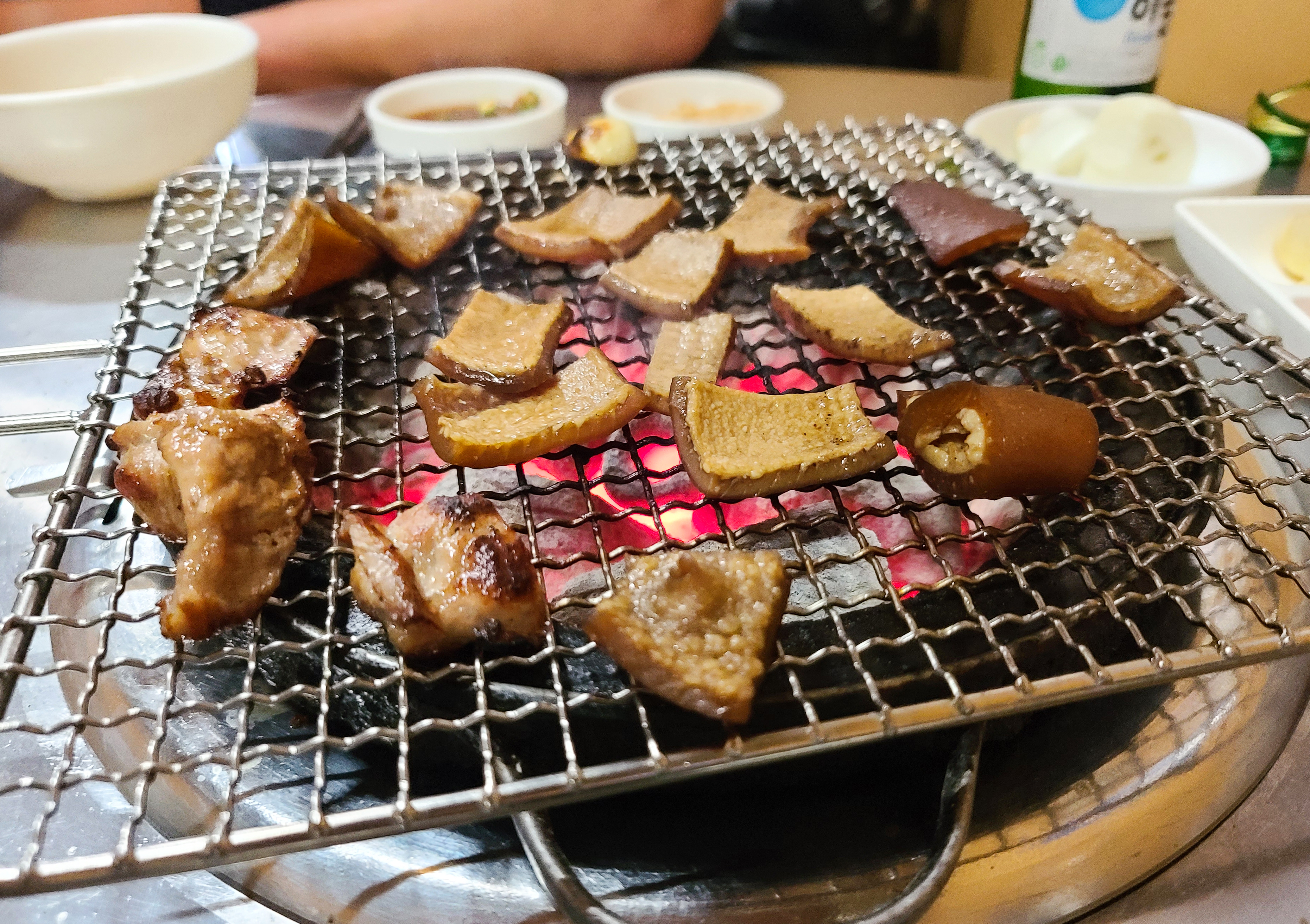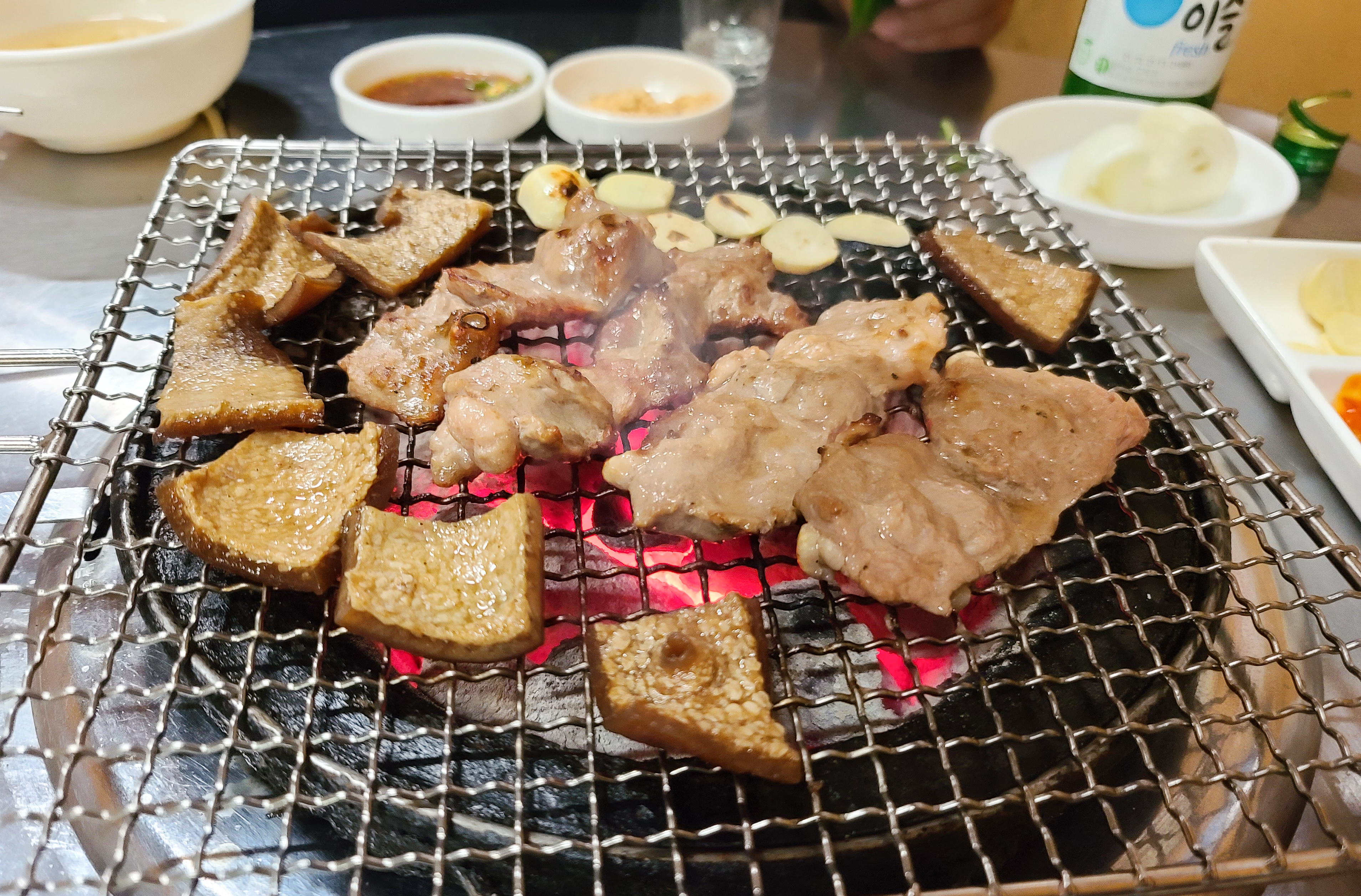 기본적인 반찬은 콩나물국, 간장소스, 콩가루, 당근, 마늘, 쌈장, 양파, 깻잎 등이 나왔습니다. 곧이어 꼼장어와 돼지뽈살, 껍데기를 구울 숯불이 준비되었고 고기들도 함께 등장했습니다.