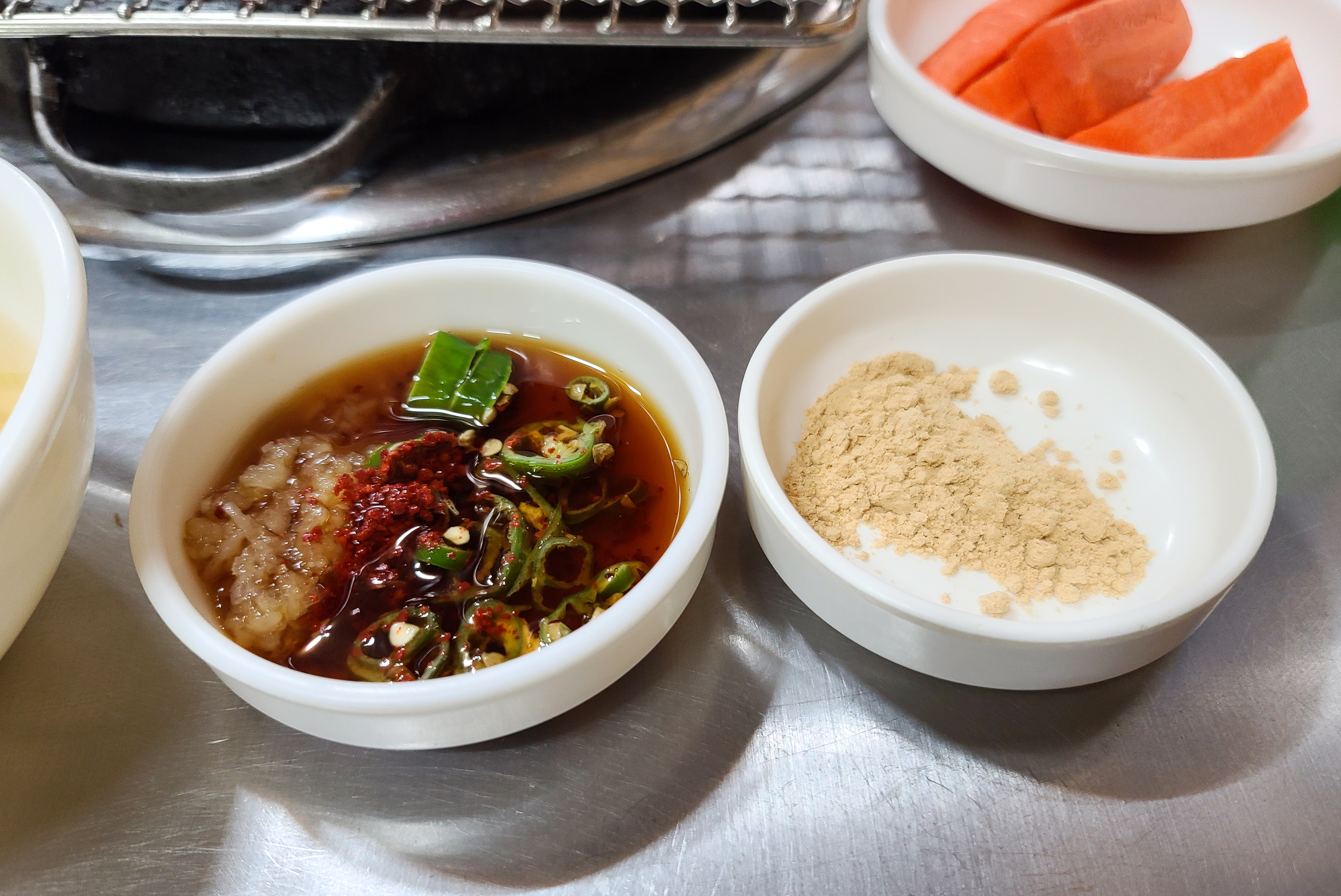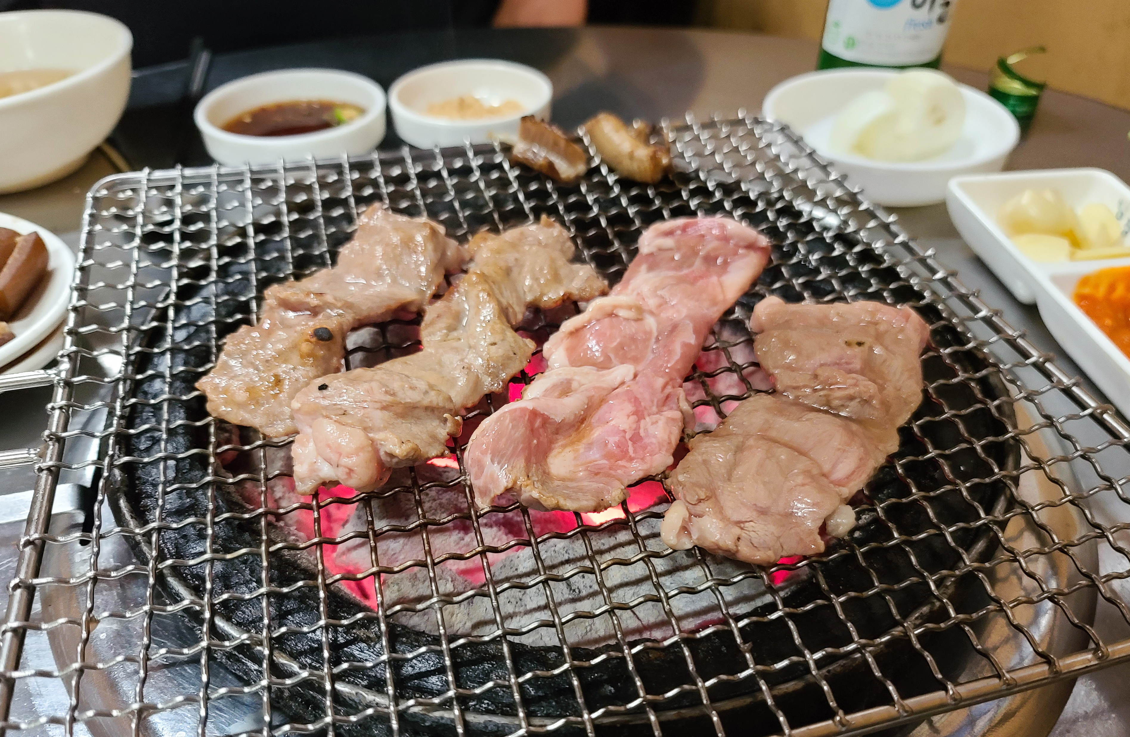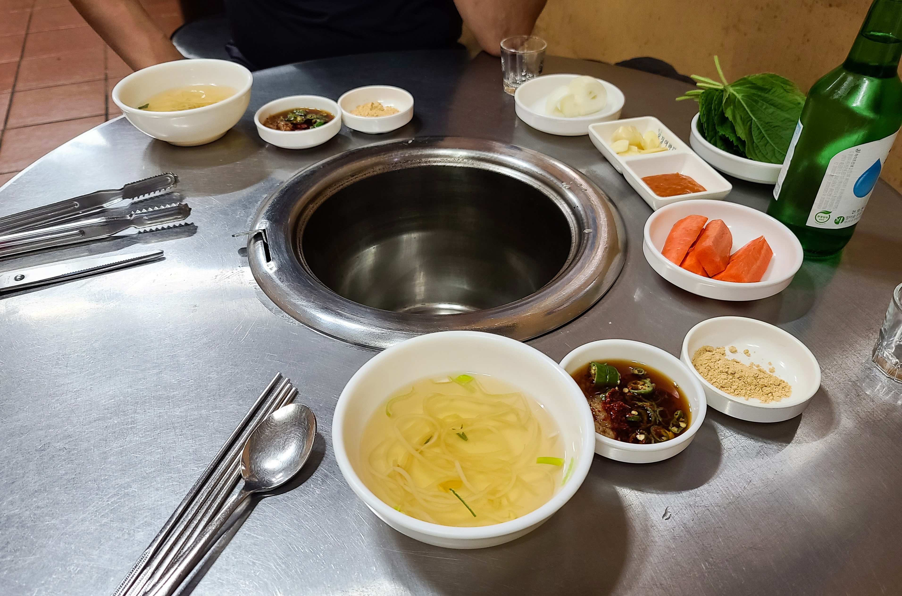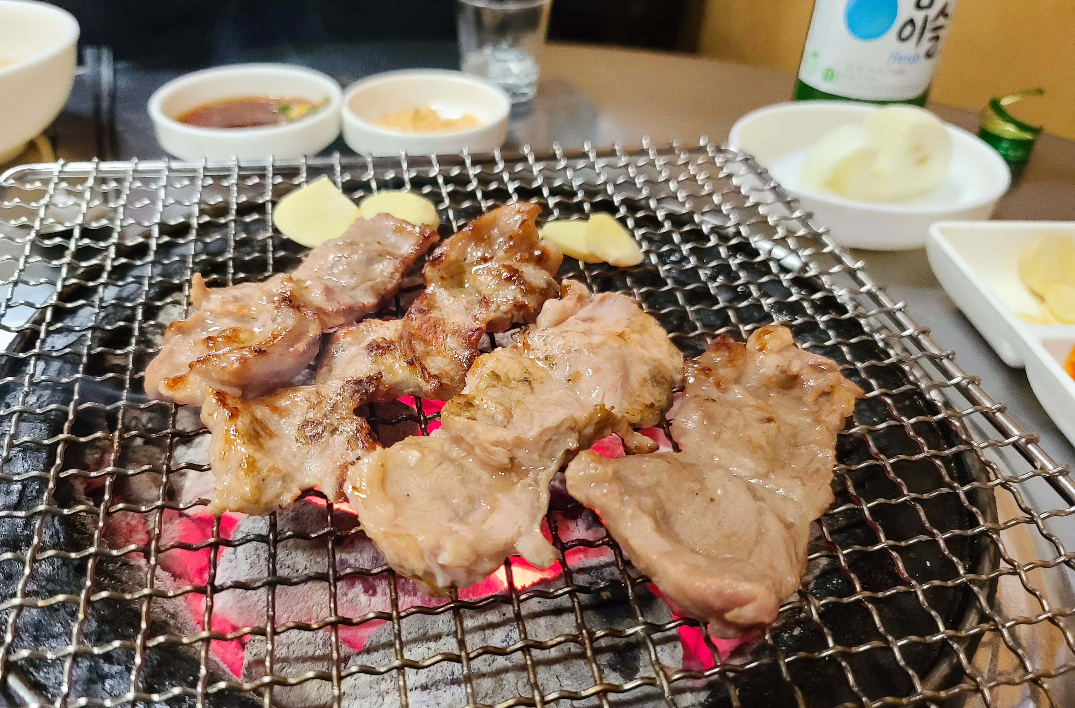 기본적인 반찬은 콩나물국, 간장소스, 콩가루, 당근, 마늘, 쌈장, 양파, 깻잎 등이 나왔습니다. 곧이어 꼼장어와 돼지뽈살, 껍데기를 구울 숯불이 준비되었고 고기들도 함께 등장했습니다.