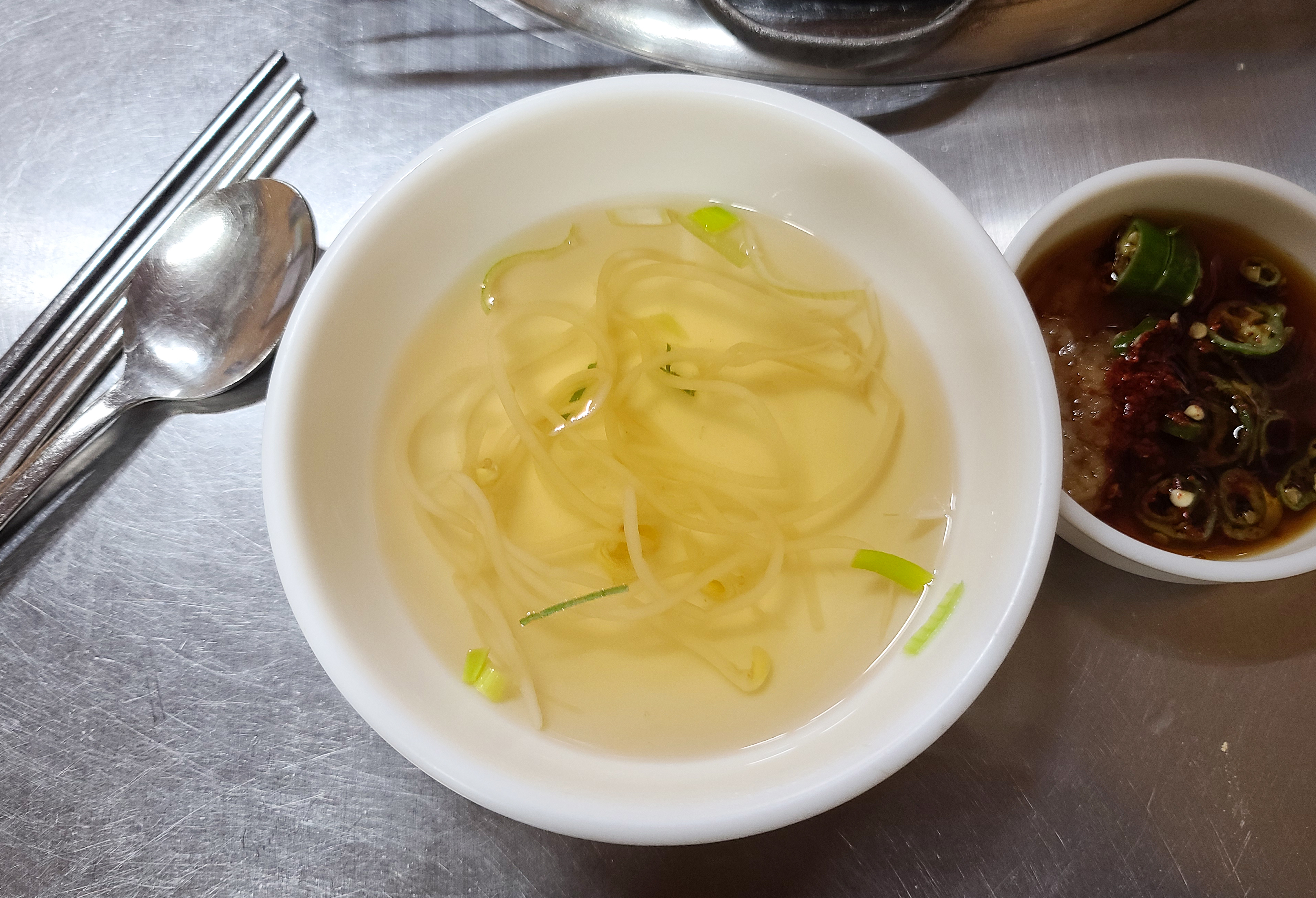 돼지뽈살은 꼬들꼬들한 식감은 있지만, 꼼장어보단 더 먹기에 편하고 좋았습니다. 껍데기도 냄새를 잘 제거해줘서 부드러우면서도 맛있었습니다. 돼지뽈살을 간장과 마늘, 청양고추가 섞인 소스에 곁들여 먹으니 맛이 괜찮았습니다.