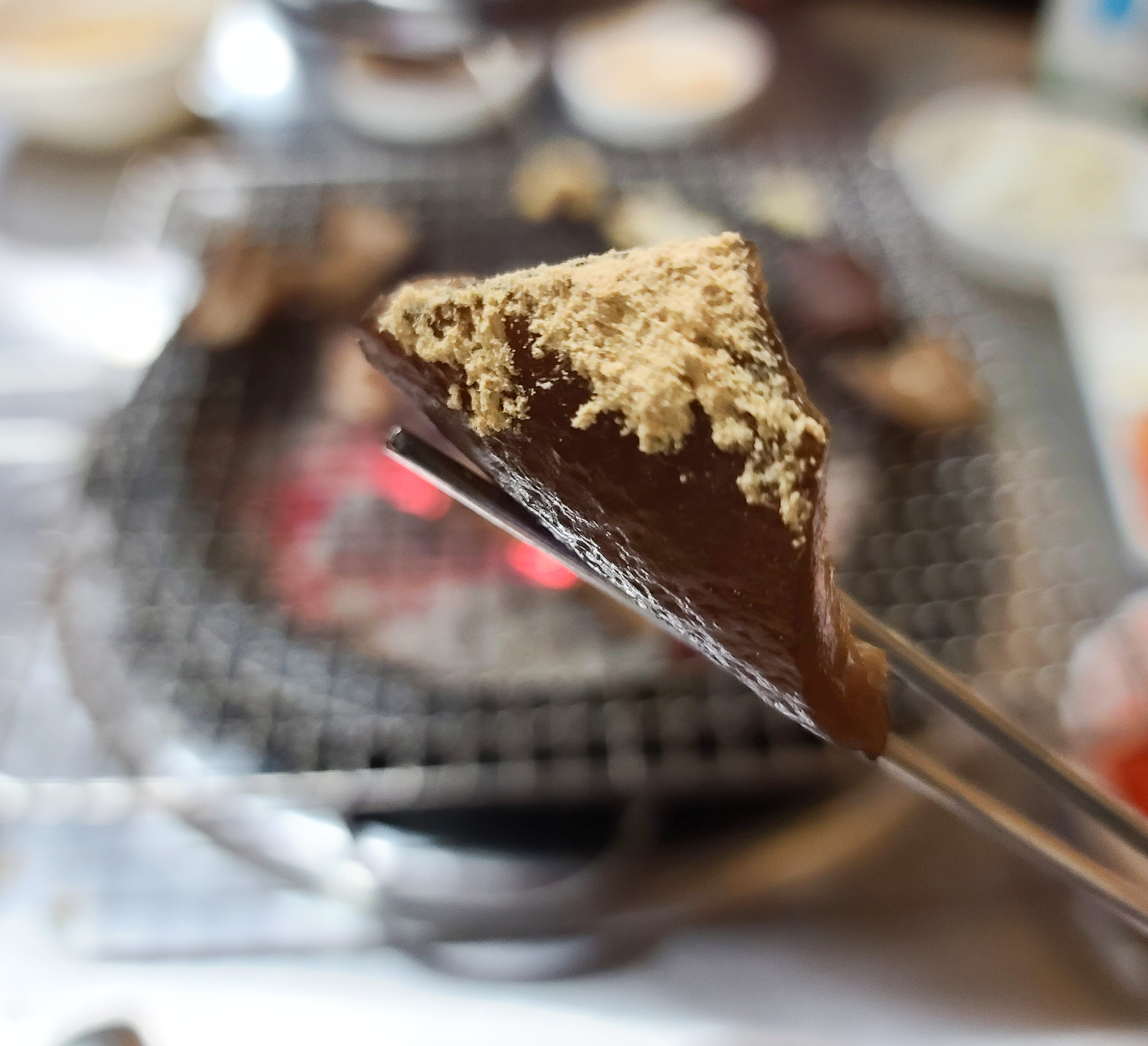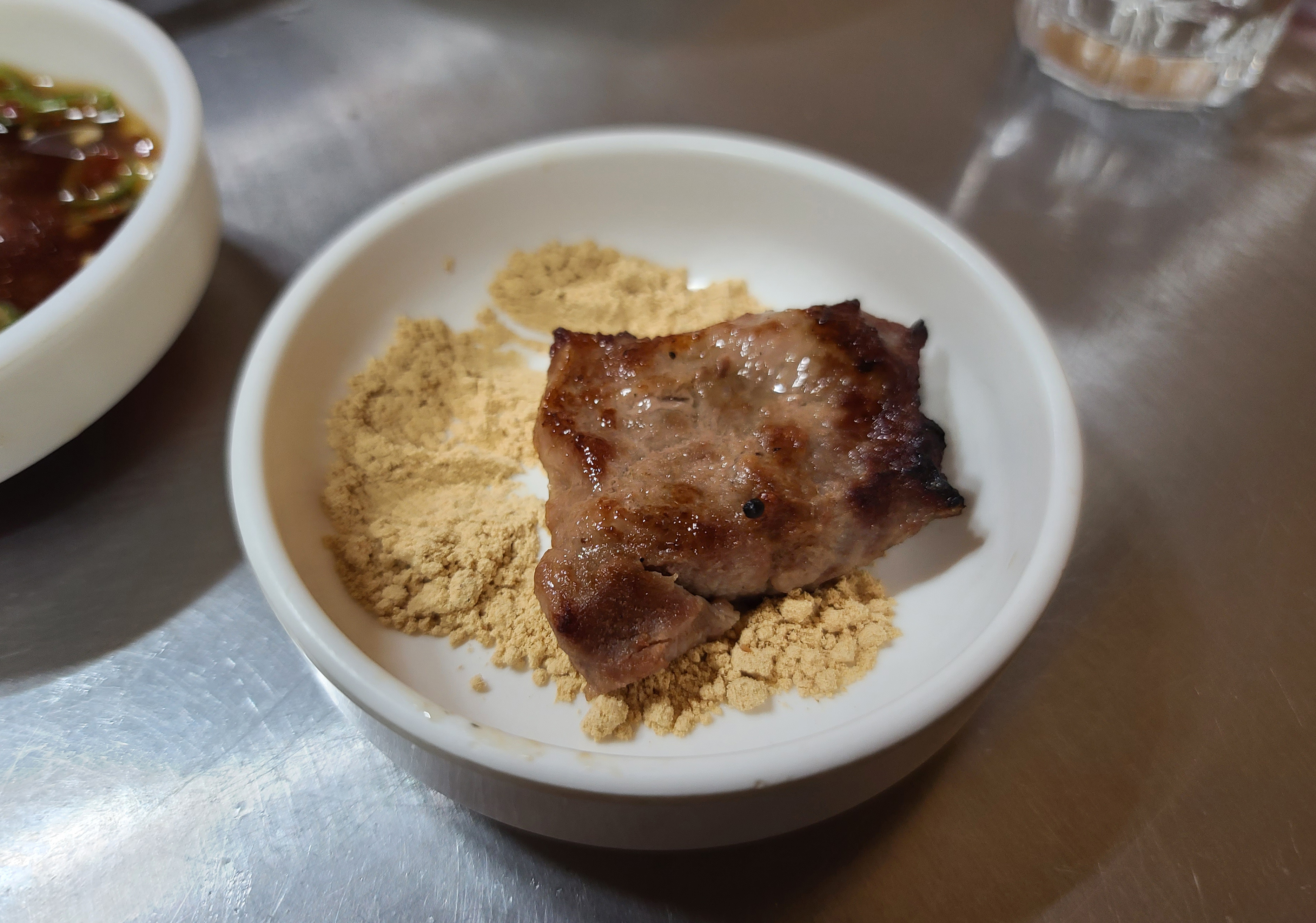 잘 익은 돼지 뽈살과 껍데기의 모습입니다. 돼지뽈살은 다른 부위보다 더 담백하고 맛있었고, 껍데기는 흔히 아는 쫄깃쫄깃한 식감이 있는 그런 맛이었습니다. 콩가루를 묻혀서 먹으면 덜 느끼하게 먹을 수 있다는 게 장점이었습니다.