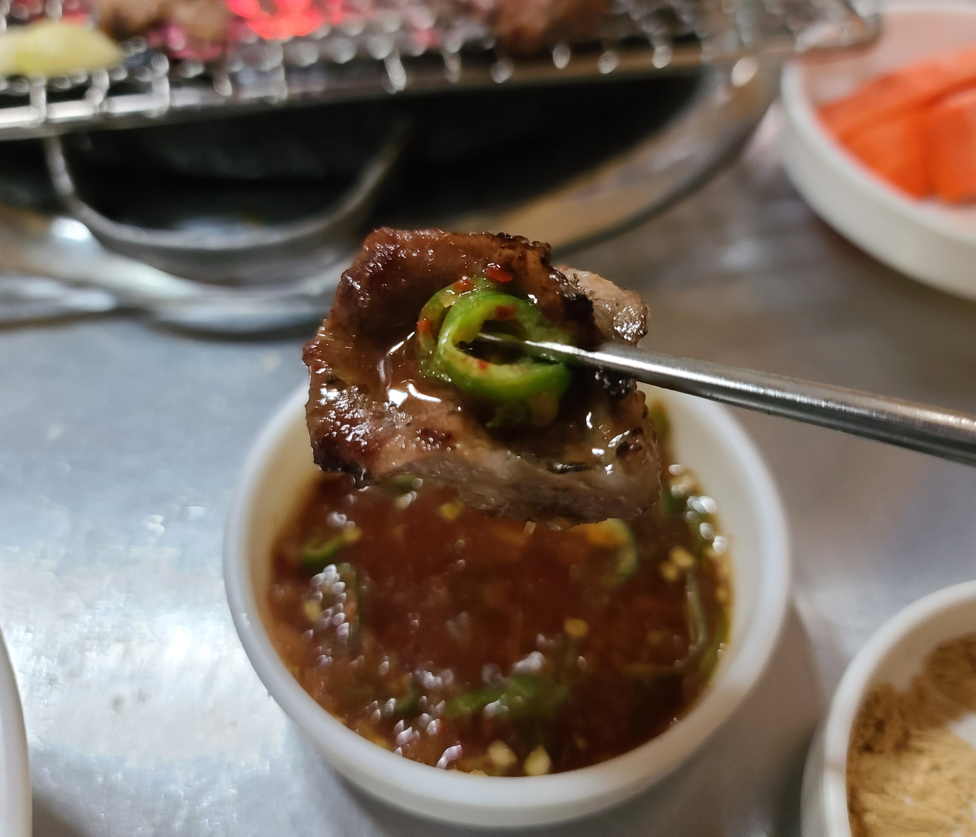껍데기를 어느 정도 먹은 다음 돼지 뽈살이 입맛에 맞아서 추가로 주문하여 먹었습니다. 콩가루에 찍어먹어도 맛있지만, 아래 사진처럼 간장소스에 청양고추를 곁들여서 먹어도 괜찮았습니다. 이 날 주문했던 메뉴들인 꼼장어, 껍데기, 돼지뽈살 모두 맛이 좋았고 추천할 만했습니다.