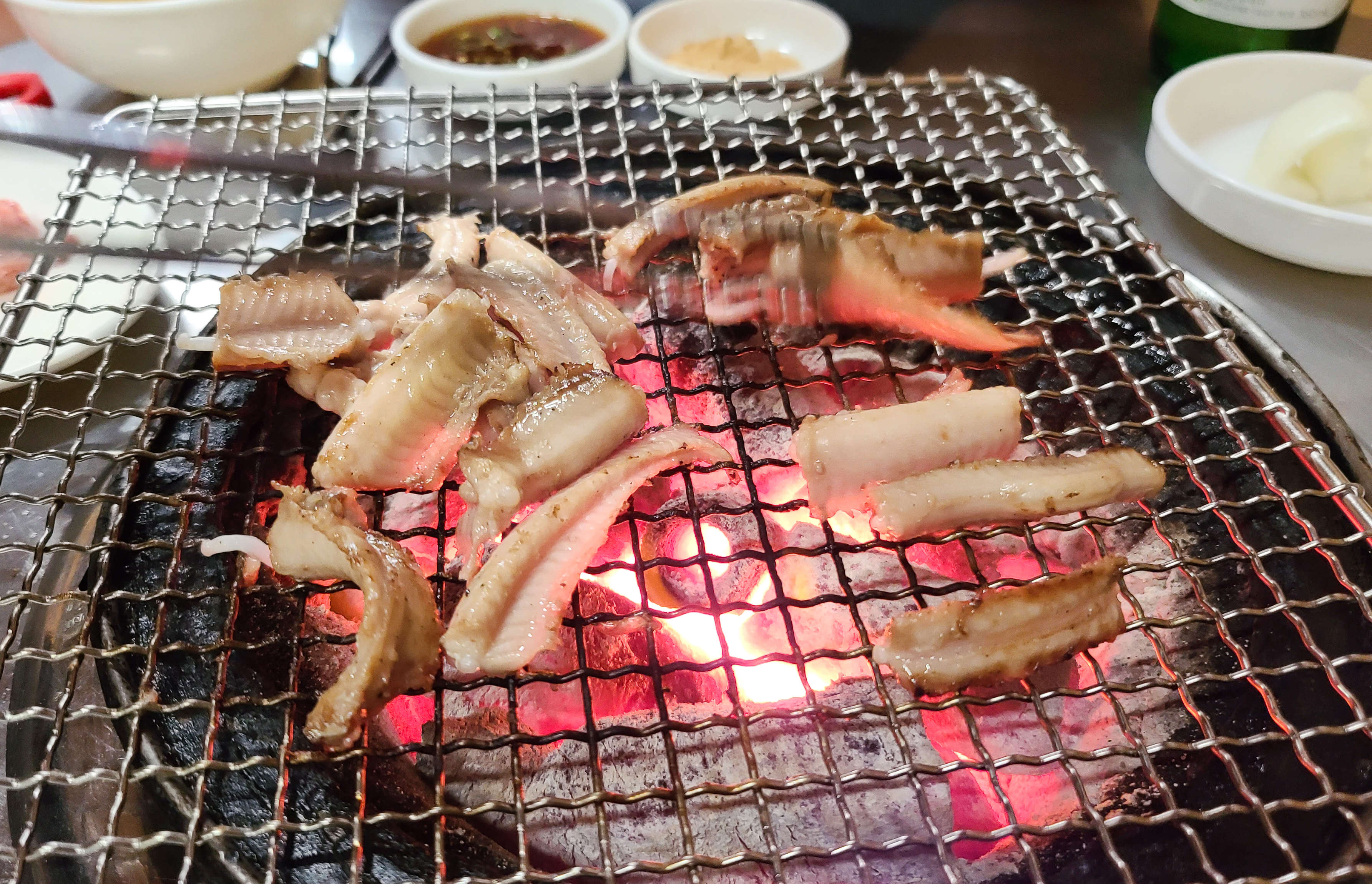 돼지뽈살구이전문의 꼼장어와 껍데기, 돼지뽈살이 나왔고, 순서는 아무렇게나 구워도 되는데 저희는 우선 꼼장어부터 먹기로 했습니다. 꼼장어는 살아있는 건 아니었고, 손질이 되어 나왔는데 예전에 살아있는 꼼장어구이는 좀 징그러웠는데, 이 건 그래도 덜 징그럽더라고요. 맛은 오징어랑 비슷한 맛인데 식감은 좀 더 꼬들꼬들했습니다.