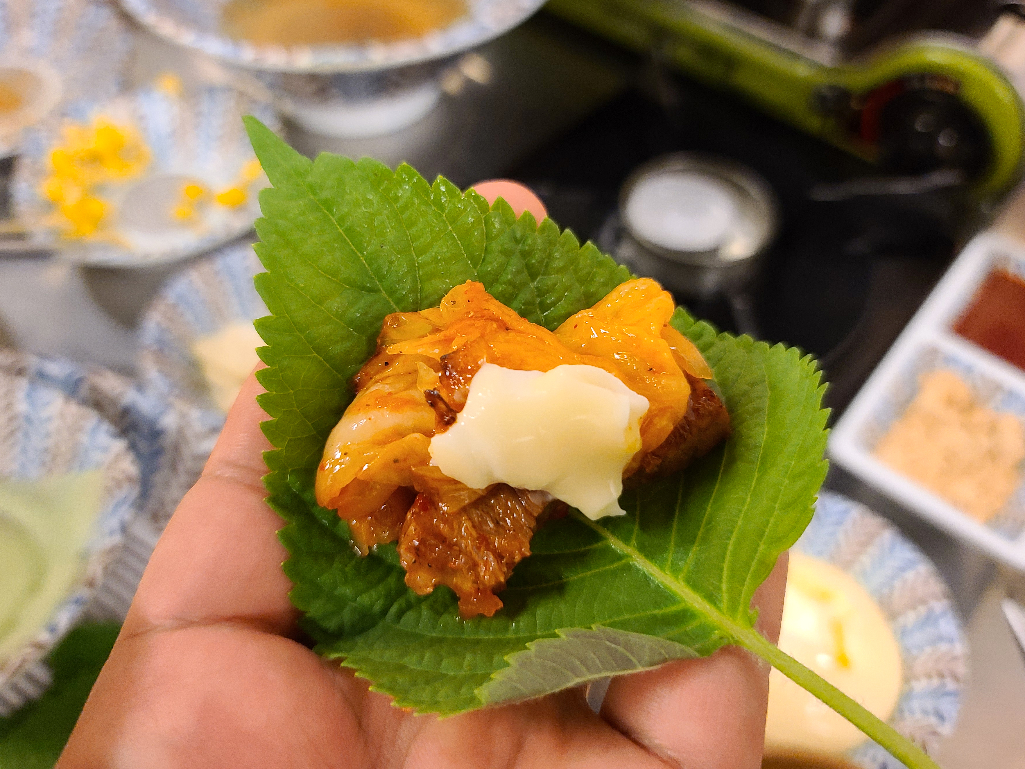 돼지김치구이를 어느정도 먹은다음 꽃껍데기도 나와서 함께 먹었습니다. 콩가루와 함께 먹어도 맛있었지만, 저는 매콤한 소스와 함께 먹는 게 더 맛있더라고요. 콩가루와 매콤한 소스 둘 다 느끼한 맛을 잡아주지만, 제게는 아무래도 콩가루 보다는 매콤한 소스가 매운맛을 더 잘 잡아주는 것 같아서 좋더라고요.