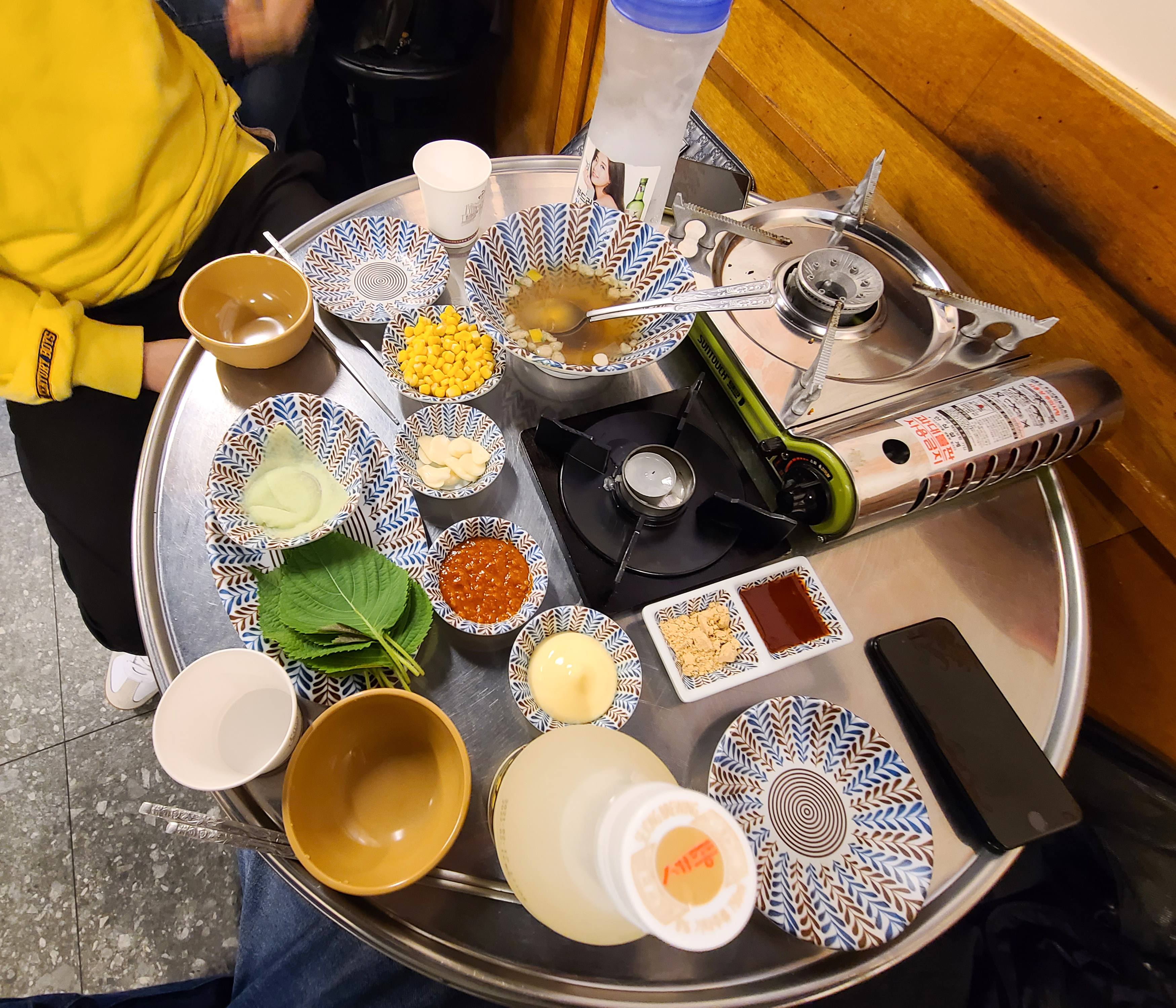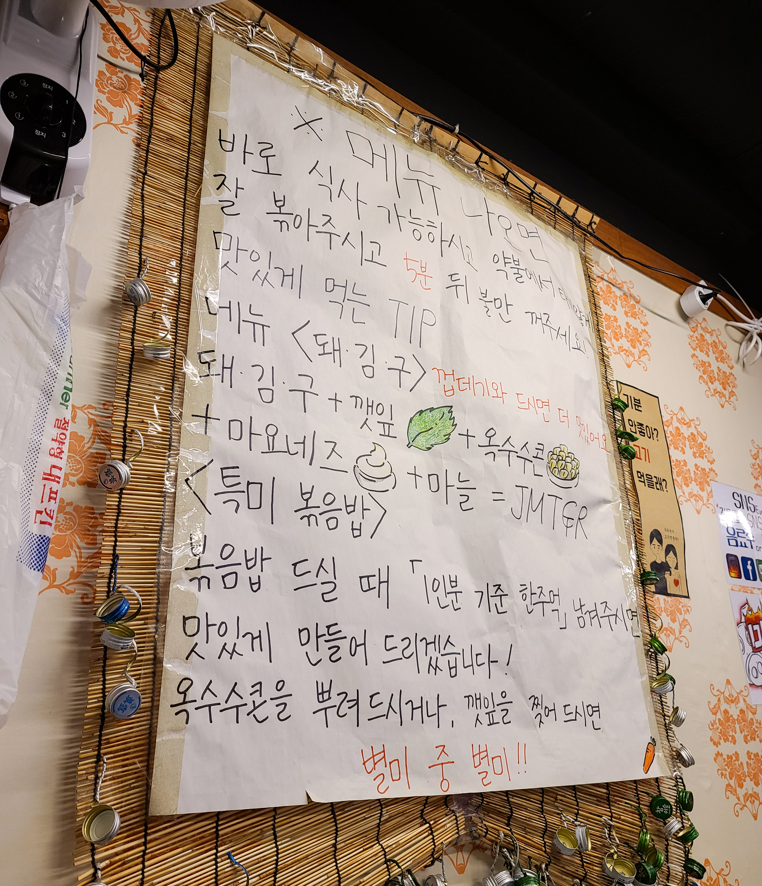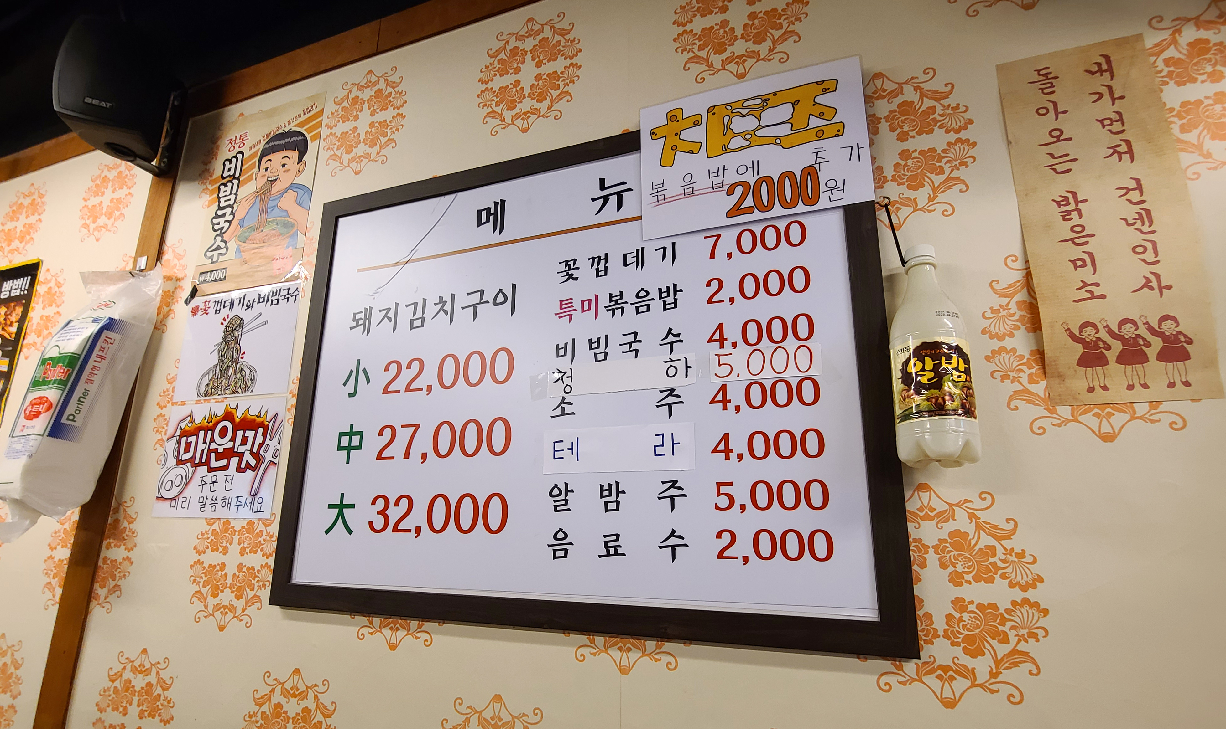 이 날은 친구와 함께 돼지김치구이 소자와 꽃껍데기 그리고 알밤막걸리와 특미볶음밥을 주문하여 먹었습니다. 기본적인 상차림은 깻잎과 무채, 콘샐러드, 마늘, 쌈장, 마요네즈, 콩가루, 어묵국물(?) 등이 나왔습니다. 가장 메인이 되는 돼지김치구이의 가격은 22,000원~ 32,000원 선이었고, 가격이 크게 부담스럽지는 않았습니다.