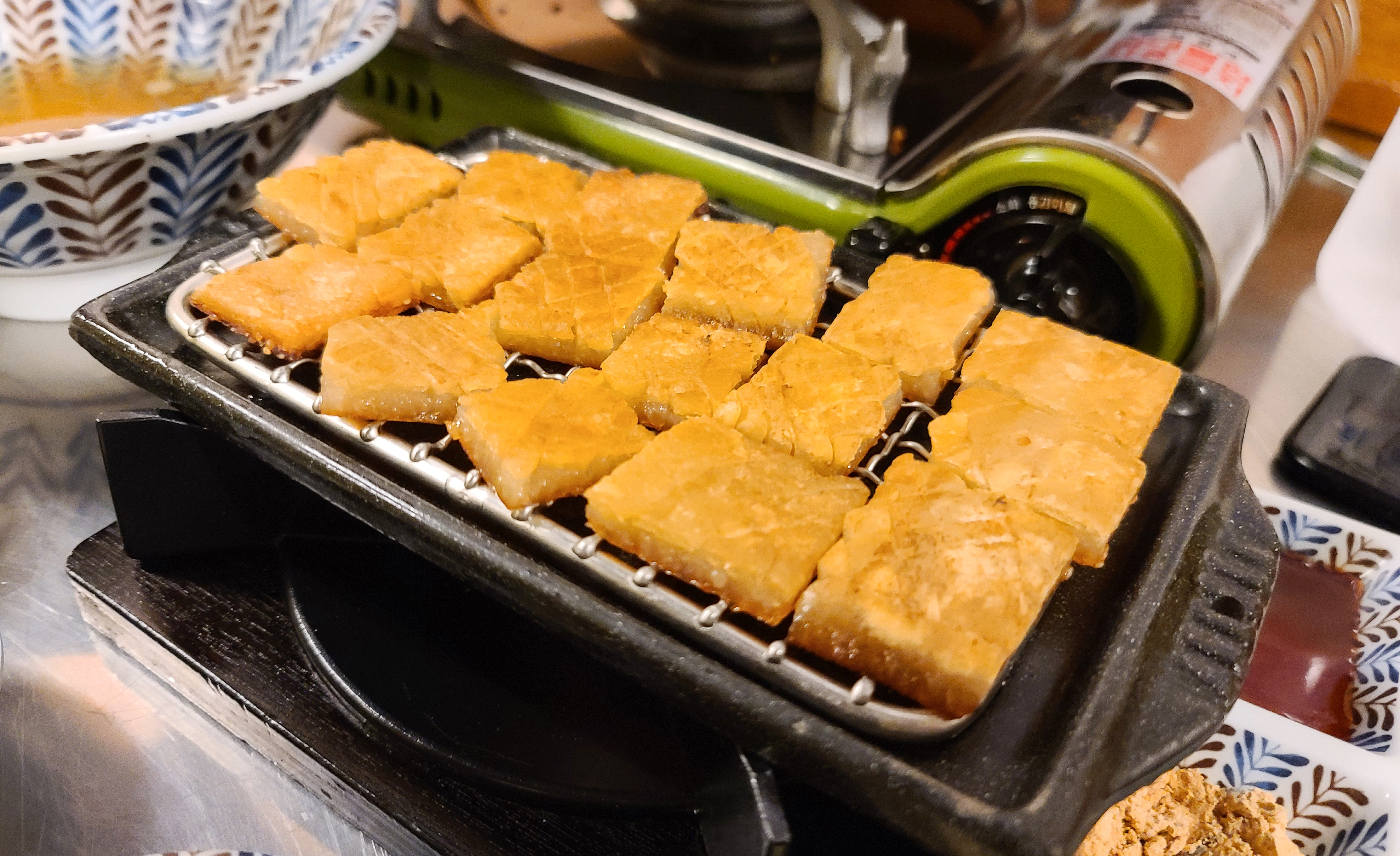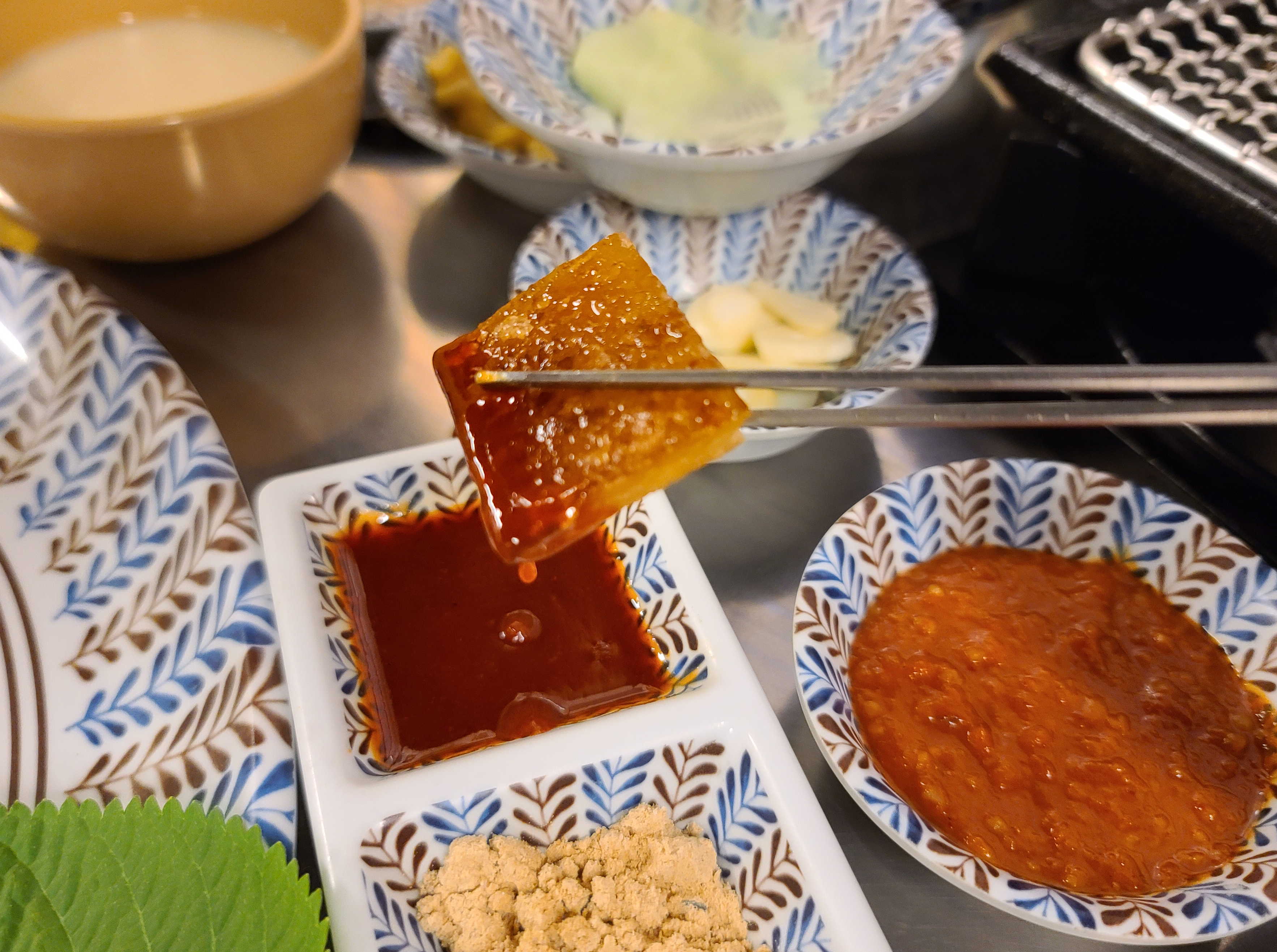 돼지김치구이를 어느정도 먹은다음 꽃껍데기도 나와서 함께 먹었습니다. 콩가루와 함께 먹어도 맛있었지만, 저는 매콤한 소스와 함께 먹는 게 더 맛있더라고요. 콩가루와 매콤한 소스 둘 다 느끼한 맛을 잡아주지만, 제게는 아무래도 콩가루 보다는 매콤한 소스가 매운맛을 더 잘 잡아주는 것 같아서 좋더라고요.