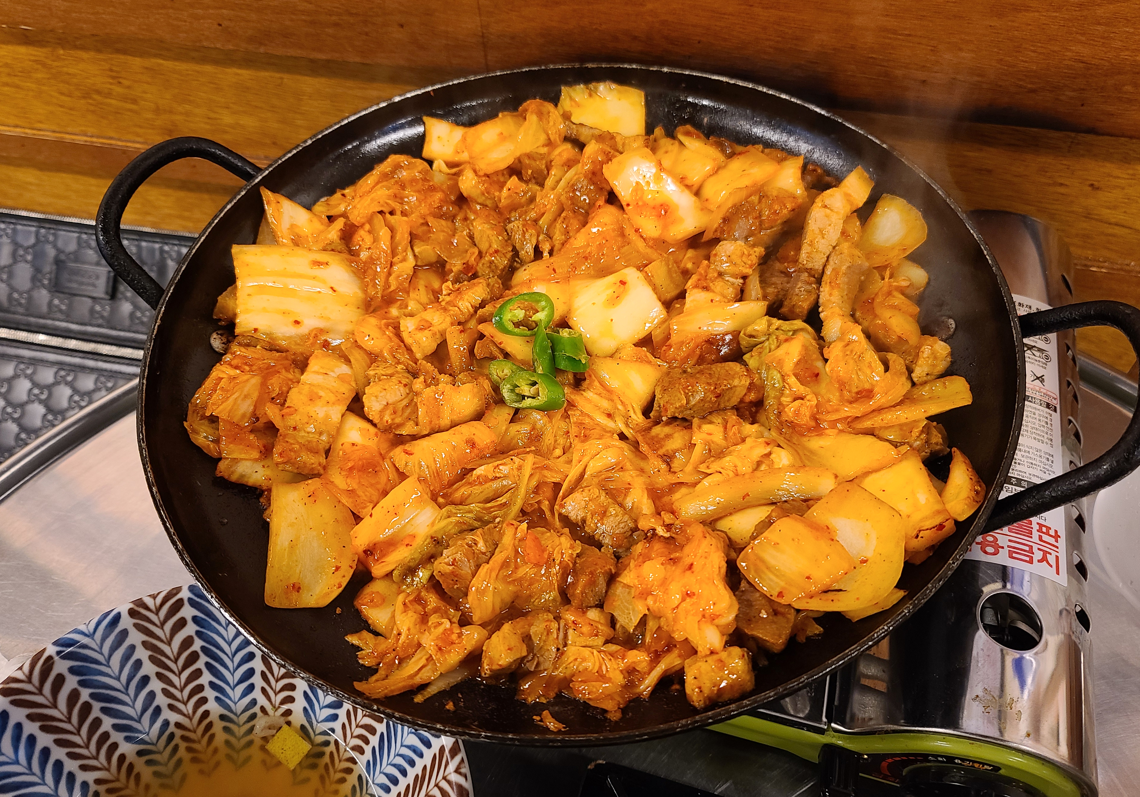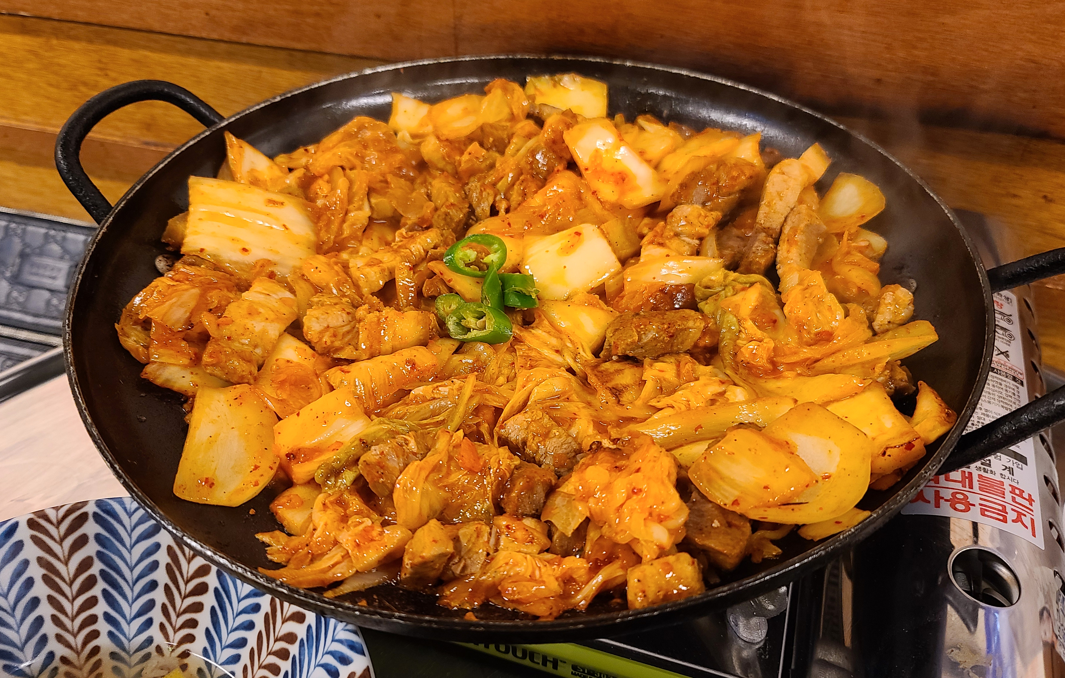 돼지김치구이의 모습은 위와 같았습니다. 넓적한 냄비에 김치와 양파, 고추 등을 얹어 매콤하게 볶아낸 메뉴였는데, 기호에 따라서 깻잎이나 옥수수콘, 마요네즈, 마늘과 곁들여서 먹으면 되었고, 볶음밥을 위해서 1인분 기준 한주먹 정도 남겨두면 볶음밥을 만들어준다고 하더라고요. 기본적으로 돼지고기와 김치를 볶아서 그런지 돼지고기와 김치의 특유의 감칠맛이 돌아서 맛이 좋았습니다.