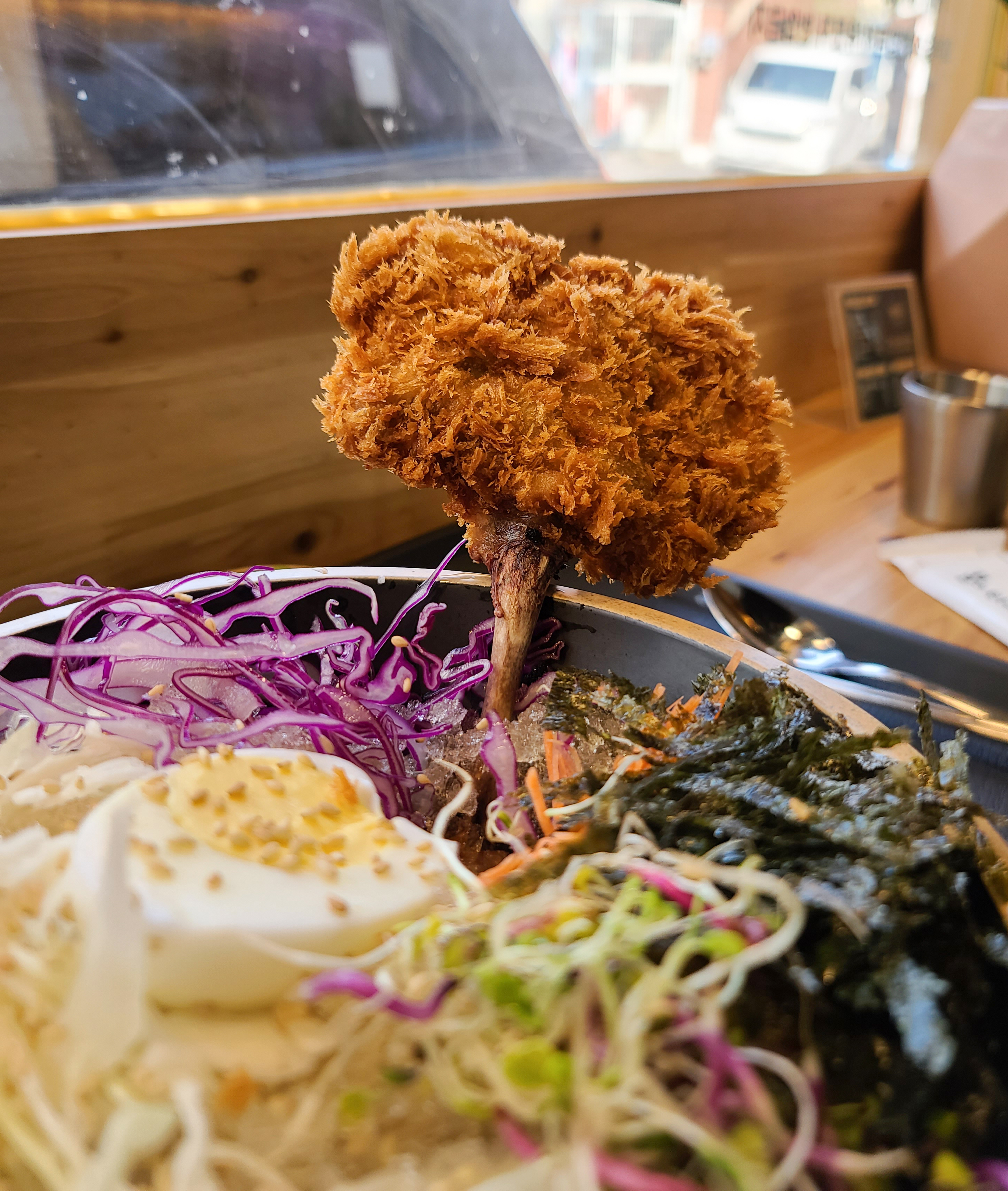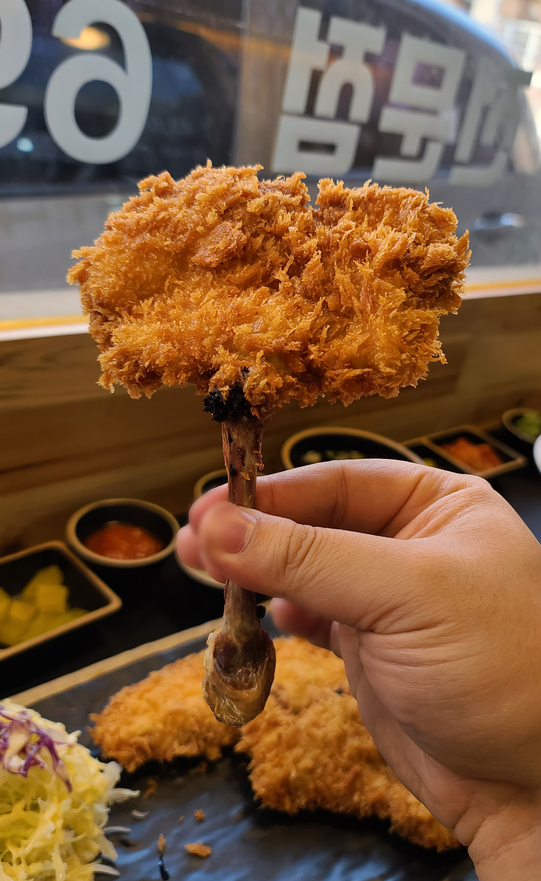 수제 돈가스 그중에 치킨까스는 독특한 비주얼에 치킨 닭다리처럼 들고도 찍어보고, 냉모밀 사이에 꽂아서도 찍어보고 여러장의 사진을 찍어보았습니다. 이 외에도 주로 생선까스하면 흰 살 생선을 떠올리는데, 훈제연어까스는 연어의 색 처럼 주황색을 띄었고, 맛도 훈제연어라서 그런지 훈연한 향이 났습니다. 같이 나오는 소스도 돈까스와 잘 어울렸고요.