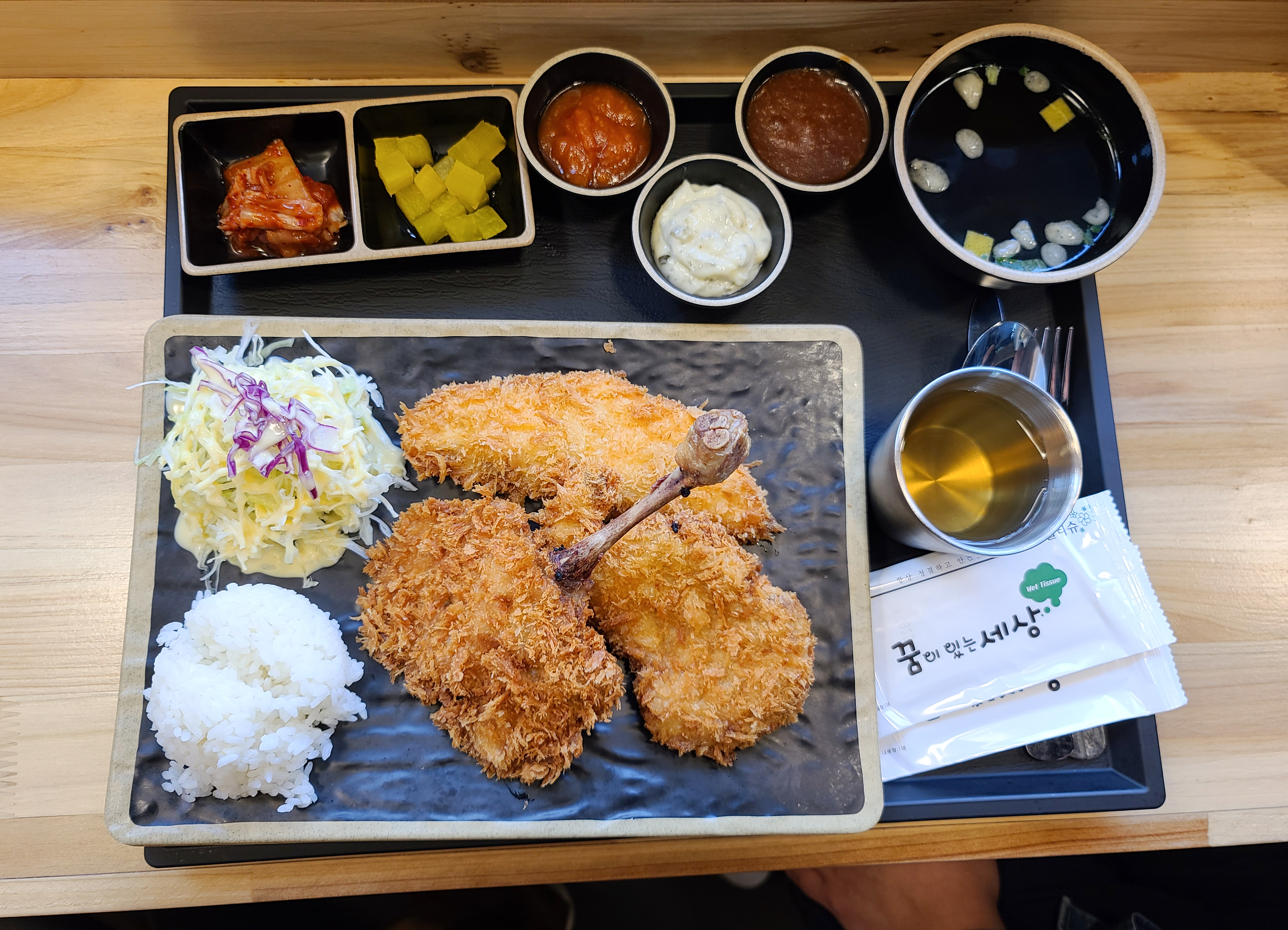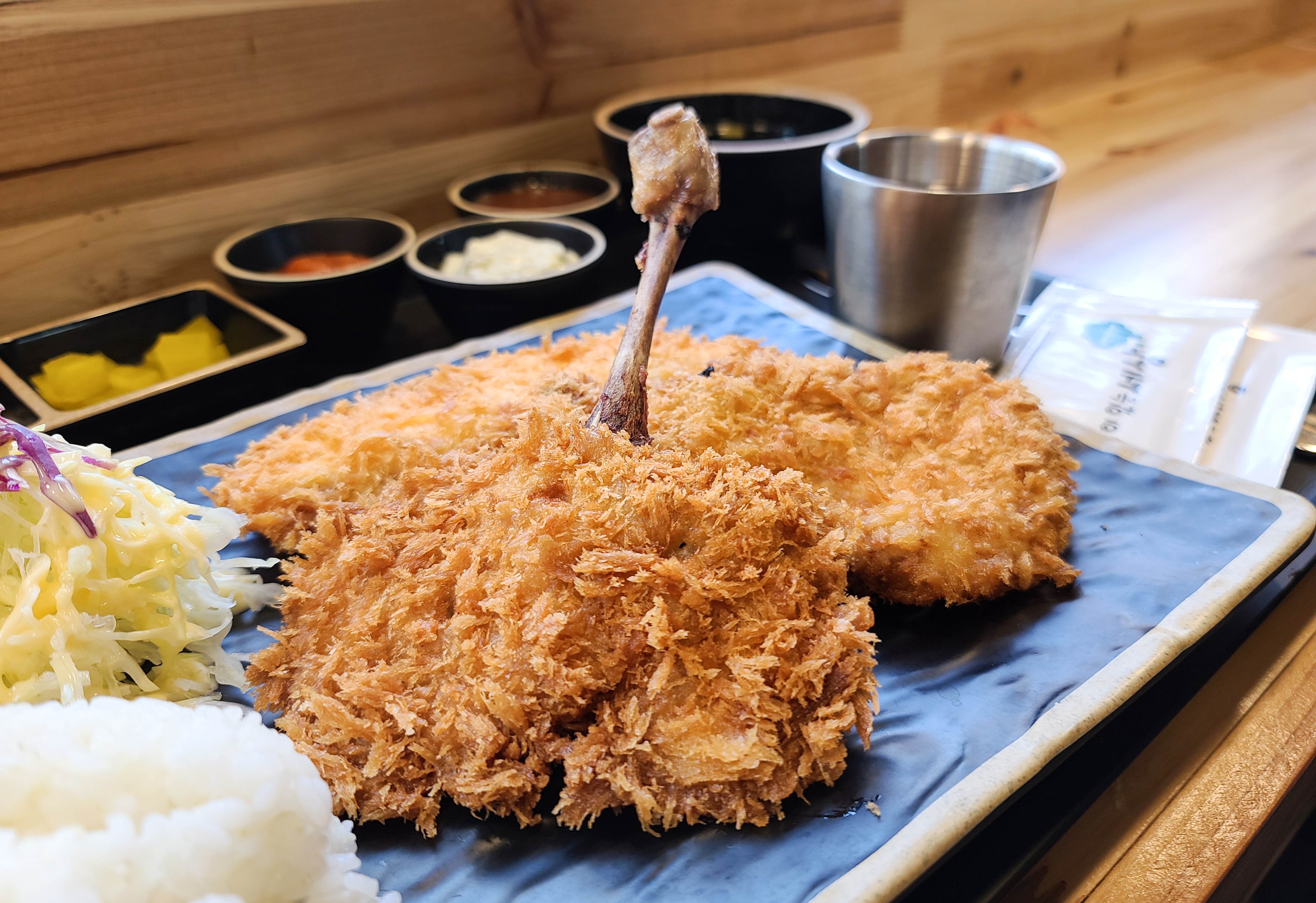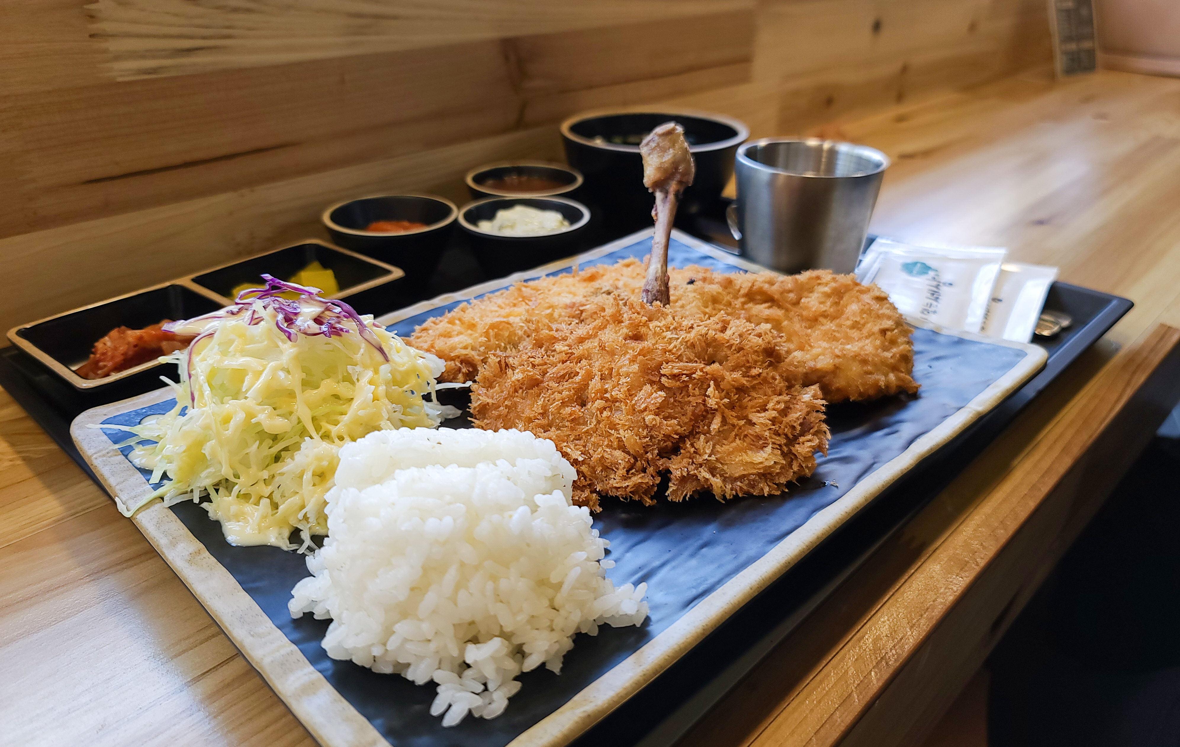 먼저 저희가 주문한 모둠돈까스와 냉모밀의 모습을 함께 살펴보시죠, 모둠돈까스는 굿돈까스, 치킨까스, 훈제연어까스 총 3가지 메뉴를 동시에 맛볼 수 있는 메뉴인데, 가장 눈에 띄는 것은 아무래도 닭다리 뼈가 그대로 드러난 치킨까스의 압도적인 비주얼이었습니다. 보통 치킨까스 하면 닭의 안심을 사용하는 것으로 알고 있었는데, 이 곳은 닭다리살을 이용하여 만들어 부드러운 식감을 보여주었습니다.