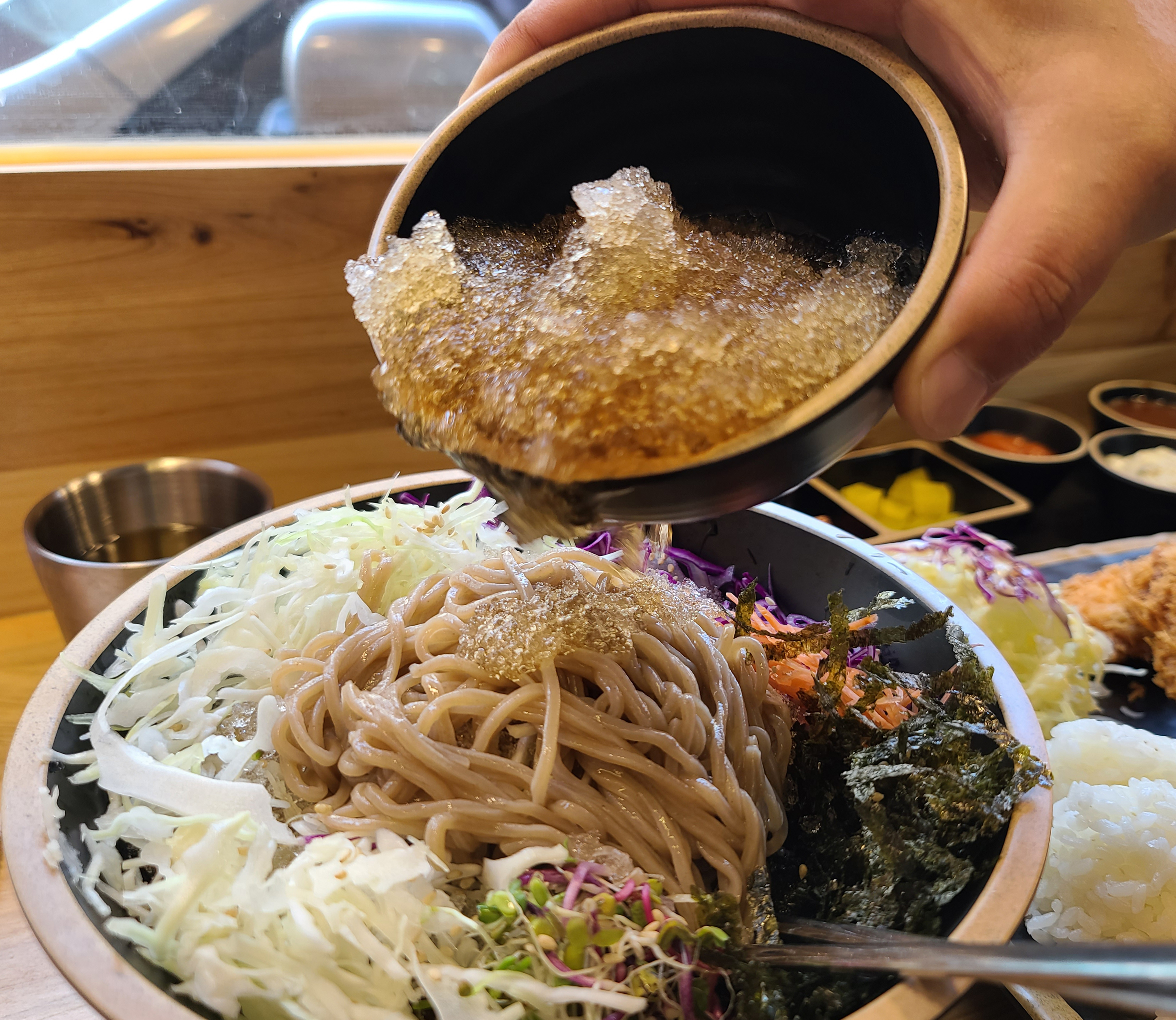 요즘 날씨가 갑자기 더워져서 냉모밀 같이 시원한 메뉴가 당겼는데, 굿수제돈까스&냉모밀 가게는 냉모밀도 잘 하는 것 같더라고요. 시원한 국물에 각종 채소들이 들어가 아삭아삭한 식감과 이가 시릴정도로 차가운 육수가 더위를 식혀주는 것 같았습니다. 길 가다가 우연히 발견하여 방문하게 된 가게인데, 나름 만족스럽게 이용한 곳이고, 이 가게는 새로생긴 곳인지, 지도검색도 안되더라고요. 전체적으로 돈까스와 냉모밀 두루 맛있었던 가게이고, 나중에 또 방문할 의사가 있는 가게입니다.