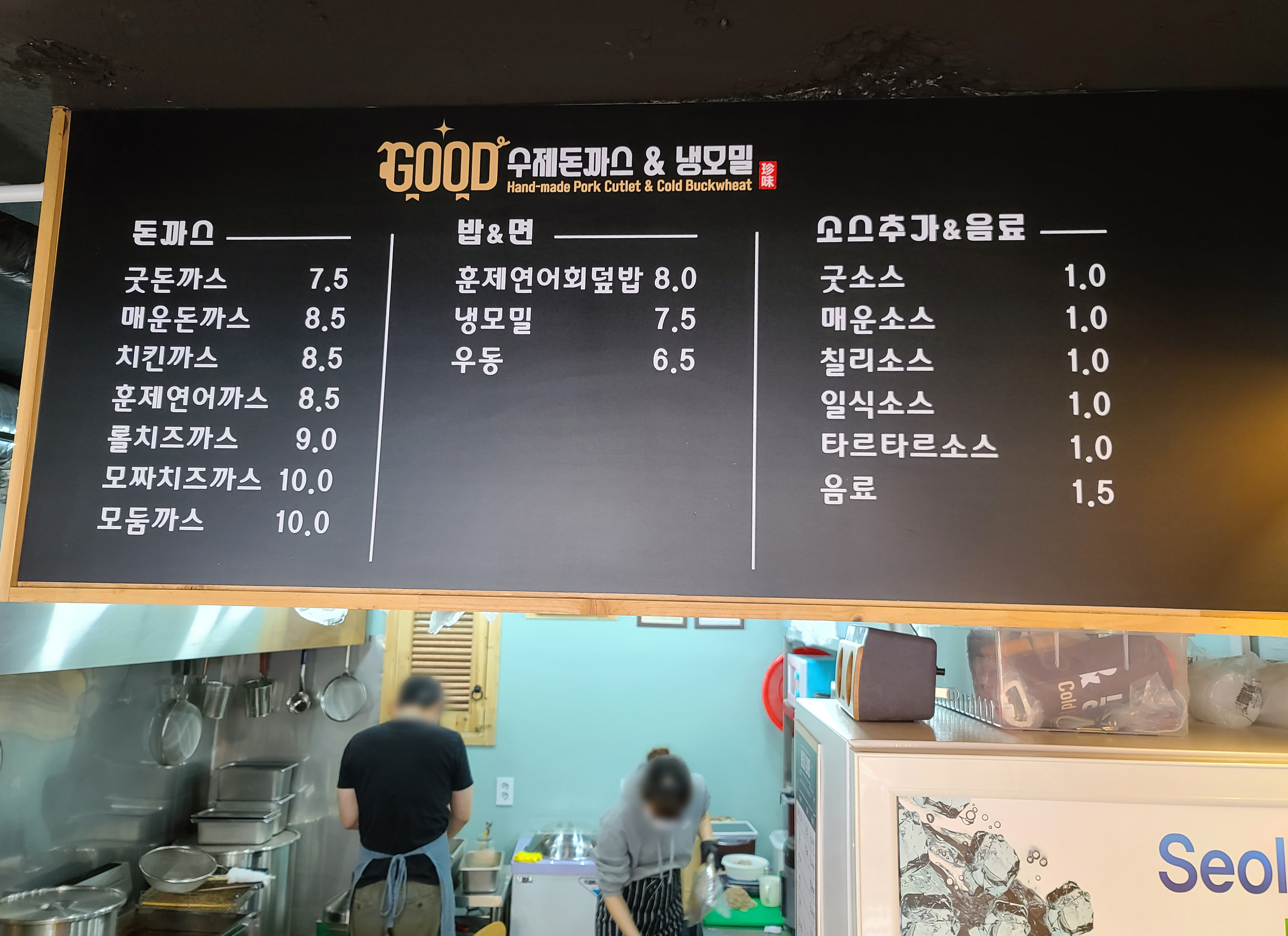 간판에는 'GOOD 수제돈까스&냉모밀' 이라고 표시가 되어있었고, 굿수제돈까스&냉모밀 가게는 포장 배달을 전문으로 하고 있었습니다. 가게에 협소하지만 테이블이 마련되어 있어서, 가게에서 식사를 할 수 있었고, 영업시간은 오전 11시부터 오후 8시까지이며, 중간에 휴식시간은 오후 3시부터 오후 4시 30분 까지였습니다.